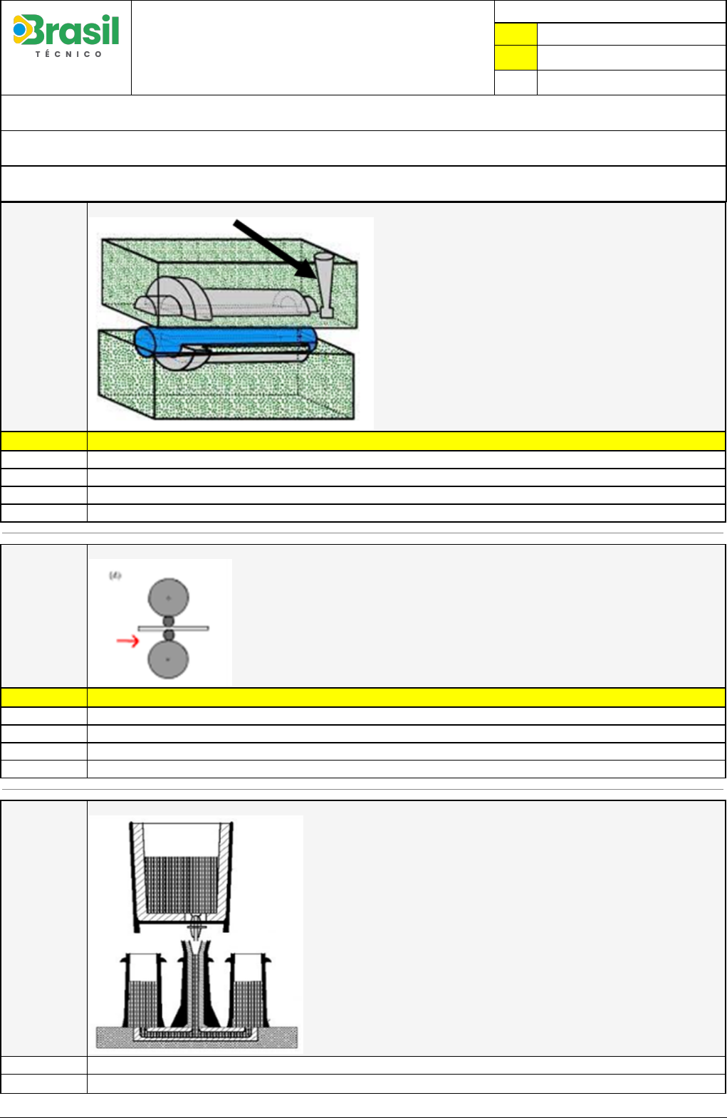 Pincel Atômico - 13/06/2023 12:03:36 1/5 PATRICK NEVES DE CARVALHO Avaliação Online (SALA EAD) Atividade finalizada em 29/05/2023 19:59:56 (995509 / 1) LEGENDA Resposta correta na questão # Resposta correta - Questão Anulada X Resposta selecionada pelo Aluno Disciplina: PROCESSOS DE TRANSFORMAÇÃO MECÂNICA [534363] - Avaliação com 20 questões, com o peso total de 51,00 pontos [capítulos - Todos] Turma: Curso Técnico: Mecânica - Grupo: BT PRES JAN/23 - BT PRES MEC V1 [77082] Aluno(a): 91417968 - PATRICK NEVES DE CARVALHO - Respondeu 17 questões corretas, obtendo um total de 43,35 pontos como nota [350211_152070] Questão 001 Qual componente do processo de fundição está sendo indicado pela seta? X Canal de vazamento Molde Macho Modelo Caixa [350211_151984] Questão 002 A imagem abaixo se refere a qual tipo de laminador? X Duo Laminador Quádruo Laminador Duo Reversível Laminador Sendzimir Laminador trio Laminador Duo [350211_151973] Questão 003 A imagem abaixo trata de qual tipo de lingotamento? Lingotamento convencional direto X Lingotamento continuo Pincel Atômico - 13/06/2023 12:03:36 2/5 Lingotamento continuo indireto Lingotamento continuo direto Lingotamento convencional indireto [350211_152045] Questão 004 Qual a melhor definição para o brunimento? X O brunimento é um processo mecânico de usinagem por abrasão O brunimento é um processo mecânico de usinagem por oxidação O brunimento é um processo conformação mecânica por meio de compressão O brunimento é um processo conformação mecânica por meio de tração O brunimento é um processo mecânico de usinagem por ferramenta de corte [350211_152004] Questão 005 A imagem abaixo mostra qual tipo de extrusão? Extrusão hidrostática X Extrusão direta Extrusão indireta Extrusão indireta lateral Extrusão lateral [350211_152013] Questão 006 A imagem abaixo se refere a qual tipo de forjamento? X Forjamento em Matriz Fechada Forjamento de Encalcamento Forjamento em matriz semi-aberto Forjamento em Matriz Aberta Forjamento hidrostático [350211_2917] Questão 007 A figura abaixo representa um dos diversos defeitos prováveis em um trefilado. Qual dos referidos defeitos representa a essa figura? Fratura com trinca; Diâmetro escalonado; Fratura com risco lateral; Ruptura me forma de taça-cone; X Fratura irregular com estrangulamento; Pincel Atômico - 13/06/2023 12:03:36 3/5 [350211_152023] Questão 008 Qual tipo de estampagem e mostrado na imagem abaixo? Estampagem de conformação Estampagem em matriz aberta Estampagem de repuxo Dobramento X Estampagem de corte ou puncionamento [350211_152060] Questão 009 Qual das opções abaixo não é uma maneira de classificar a operação de brochamento? Movimento - Da ferramenta (mais comum) - Da peça Direção do movimento - Vertical - Horizontal (mais comum) Aplicação do esforço - Por tração (mais comum) - Por compressão Tipo de superfície - Interna (mais comum) - Externa X Velocidade do brochamento - Rápido - Lento [350211_4030] Questão 010 São componentes de um Laminador: Cilindros, carcaça e caixa de mudanças; Cilindros, barramento, cabeçote fixo e móveis; Carcaça, engrenagens e bielas; Mancais, cilindros e eixos sem fim; X Mancais, carcaça e cilindros; [350212_5629] Questão 011 No esquema de funcionamento de um lingotamento contínuo, qual é o nome do recipiente que recebe o aço líquido produzido nas panelas da aciaria? Rotor do Britador Canaleta de Sucata Panela de Gusa X Distribuidor Cadinho [350212_152062] Questão 012 Em relação a geometria dos dentes das broxas, qual o significado o ângulo (ϒ) mostrada na imagem abaixo? Ângulo de incidência Ângulo de avanço Penetração de recuo X Ângulo de saída Pincel Atômico - 13/06/2023 12:03:36 4/5 Ângulo de desbaste [350212_152007] Questão 013 Qual a faixa de temperatura em °c para a extrusão a quente dos aços? X 875 a 1300 55 a 105 375 a 475 650 a 950 100 a 200 [350212_2905] Questão 014 Quanto a um laminador básico, os cilindros de laminação são fabricados em qual material? Aço Carbono ou Ferro Fundido; Alumínio e suas ligas; Cobre e Aço Carbono; Titanio; X Aço Fundido ou Forjado ou Ferro Fundido; [350212_152025] Questão 015 O material estampado pode ser dividido em região de acordo com a operação realizada. Com relação ao material estampado da imagem abaixo, qual o nome da região “d”? Região do dobramento da matriz X Região do dobramento do punção Região da aba do copo Região lateral do copo Região do fundo do copo [350212_2909] Questão 016 Qual é a redução máxima na espessura de uma chapa de aço oriunda do laminador de tiras a quente? X 1,5mm; 2,0mm; 1,4mm; 1,8mm; 1,1mm; [350213_2906] Questão 017 Considere as partes de um cilindro, representa a parte que realiza a laminação, podendo ser lisa ou com canais. Trata-se da(o): Tambor de acionamento. X Mesa; Trevo; Eixo como um todo; Pescoço; Pincel Atômico - 13/06/2023 12:03:36 5/5 [350213_152074] Questão 018 Qual etapa do processo de fundição está mostrado na figura abaixo? X Vazamento Desmoldagem Fabricação do modelo Fabricação do molde Rebarbação [350213_152019] Questão 019 São vantagens das peças forjadas em relação a peças fundidas exceto? Suas plantas de produção são mais adaptáveis a diferentes produtos Mais baratos para grandes lotes X Possibilidade de produzir peças com partes ocas. Possuem microestrutura mais refinada Mais confiáveis (menos defeitos) [350213_5633] Questão 020 Qual das alternativas abaixo representa o processo pelo qual o aço líquido produzido na aciaria, resulta em placas e tarugos destinados a conformação mecânica? Fundição Extrusão X Lingotamento Trefilação Forjamento