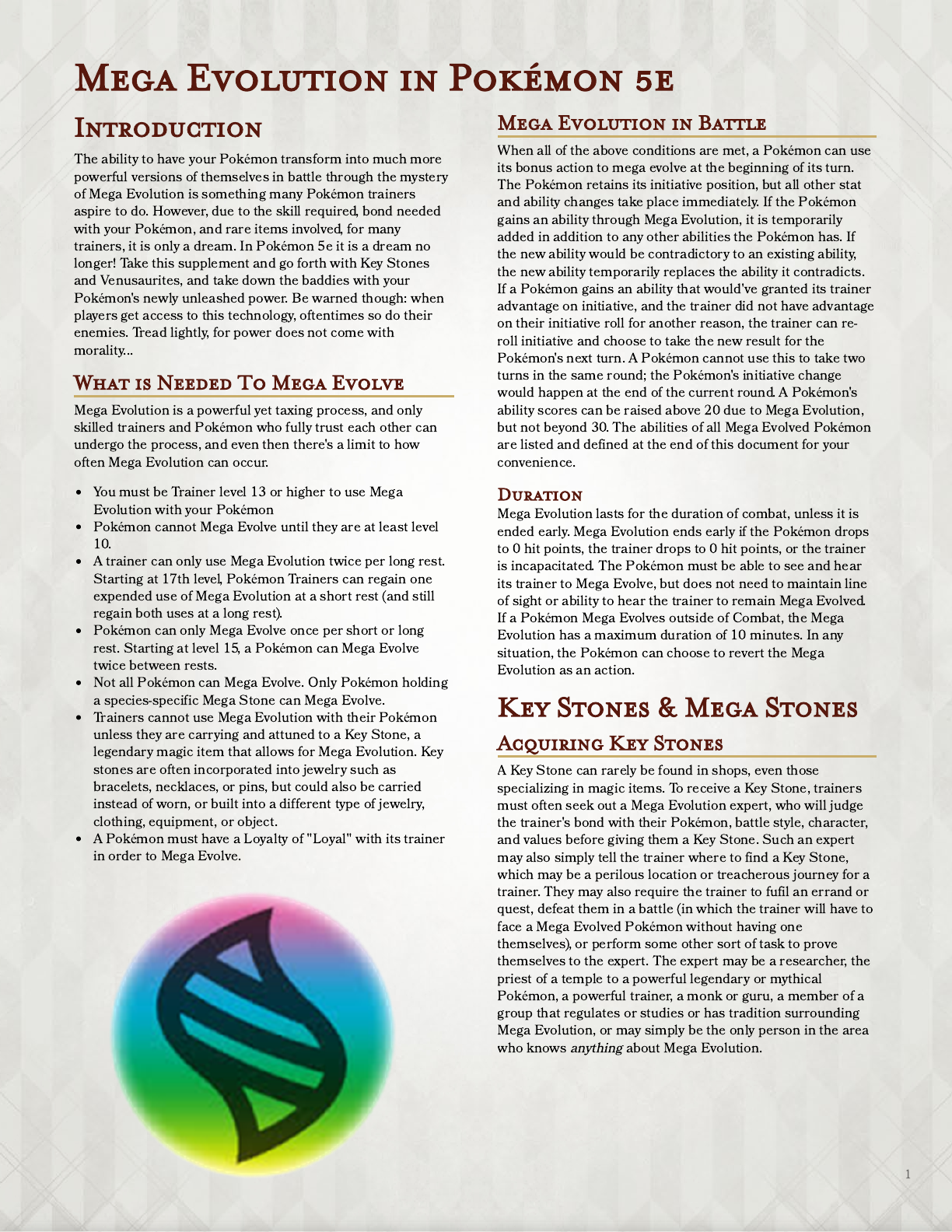 Mega Evolution in Pokémon 5e Introduction The ability to have your Pokémon transform into much more powerful versions of themselves in battle through the mystery of Mega Evolution is something many Pokémon trainers aspire to do. However, due to the skill required, bond needed with your Pokémon, and rare items involved, for many trainers, it is only a dream. In Pokémon 5e it is a dream no longer! Take this supplement and go forth with Key Stones and Venusaurites, and take down the baddies with your Pokémon's newly unleashed power. Be warned though: when players get access to this technology, oftentimes so do their enemies. Tread lightly, for power does not come with morality... What is Needed To Mega Evolve Mega Evolution is a powerful yet taxing process, and only skilled trainers and Pokémon who fully trust each other can undergo the process, and even then there's a limit to how often Mega Evolution can occur. You must be Trainer level 13 or higher to use Mega Evolution with your Pokémon Pokémon cannot Mega Evolve until they are at least level 10. A trainer can only use Mega Evolution twice per long rest. Starting at 17th level, Pokémon Trainers can regain one expended use of Mega Evolution at a short rest (and still regain both uses at a long rest). Pokémon can only Mega Evolve once per short or long rest. Starting at level 15, a Pokémon can Mega Evolve twice between rests. Not all Pokémon can Mega Evolve. Only Pokémon holding a species-specific Mega Stone can Mega Evolve. Trainers cannot use Mega Evolution with their Pokémon unless they are carrying and attuned to a Key Stone, a legendary magic item that allows for Mega Evolution. Key stones are often incorporated into jewelry such as bracelets, necklaces, or pins, but could also be carried instead of worn, or built into a different type of jewelry, clothing, equipment, or object. A Pokémon must have a Loyalty of "Loyal" with its trainer in order to Mega Evolve. Mega Evolution in Battle When all of the above conditions are met, a Pokémon can use its bonus action to mega evolve at the beginning of its turn. The Pokémon retains its initiative position, but all other stat and ability changes take place immediately. If the Pokémon gains an ability through Mega Evolution, it is temporarily added in addition to any other abilities the Pokémon has. If the new ability would be contradictory to an existing ability, the new ability temporarily replaces the ability it contradicts. If a Pokémon gains an ability that would've granted its trainer advantage on initiative, and the trainer did not have advantage on their initiative roll for another reason, the trainer can re- roll initiative and choose to take the new result for the Pokémon's next turn. A Pokémon cannot use this to take two turns in the same round; the Pokémon's initiative change would happen at the end of the current round. A Pokémon's ability scores can be raised above 20 due to Mega Evolution, but not beyond 30. The abilities of all Mega Evolved Pokémon are listed and defined at the end of this document for your convenience. Duration Mega Evolution lasts for the duration of combat, unless it is ended early. Mega Evolution ends early if the Pokémon drops to 0 hit points, the trainer drops to 0 hit points, or the trainer is incapacitated. The Pokémon must be able to see and hear its trainer to Mega Evolve, but does not need to maintain line of sight or ability to hear the trainer to remain Mega Evolved. If a Pokémon Mega Evolves outside of Combat, the Mega Evolution has a maximum duration of 10 minutes. In any situation, the Pokémon can choose to revert the Mega Evolution as an action. Key Stones & Mega Stones Acquiring Key Stones A Key Stone can rarely be found in shops, even those specializing in magic items. To receive a Key Stone, trainers must often seek out a Mega Evolution expert, who will judge the trainer's bond with their Pokémon, battle style, character, and values before giving them a Key Stone. Such an expert may also simply tell the trainer where to find a Key Stone, which may be a perilous location or treacherous journey for a trainer. They may also require the trainer to fufil an errand or quest, defeat them in a battle (in which the trainer will have to face a Mega Evolved Pokémon without having one themselves), or perform some other sort of task to prove themselves to the expert. The expert may be a researcher, the priest of a temple to a powerful legendary or mythical Pokémon, a powerful trainer, a monk or guru, a member of a group that regulates or studies or has tradition surrounding Mega Evolution, or may simply be the only person in the area who knows anything about Mega Evolution. 1 Acquiring Mega Stones Mega Stones may occasionally be for sale, or may be prizes for defeating certain trainers who specialize in the Pokémon in question. Mega Stones may be found in areas where the Pokémon is found in the wild, or may be treasure found in a cave or guarded by an evil organization. There are multiples of each species' Mega Stone, perhaps with the exception of the Mega Stones for legendary Pokémon, but they are still quite rare and may also require quests, errands, battles, money, or luck to find them. Occasionally trainers may recieve a Mega Stone for one of their Pokémon with their Key Stone, but that is not always the case. List of Mega Stones For each of the 46 species of Pokémon capable of Mega Evolution, there is one type of Mega Stone, with the exception of Charizard and Mewtwo, who have two Mega Stones and two possible Mega Evolutions each, which are differentiated by the addition of "X" or "Y" following the name of the Mega Stone. Not all mega evolutions are listed here, only those Pokémon in the Pokémon 5e system already. The Mega Stones, and their specific effects on the Pokémon they evolve, are listed in Pokedex order below. Variant Rule: Point Distribution In some mega stone descriptions, there are options to incr