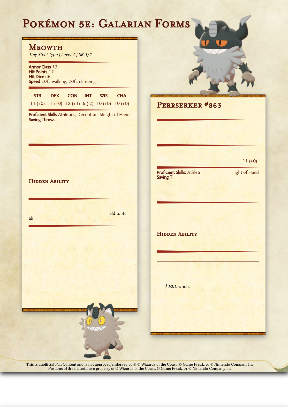 Pokémon 5e: Galarian Forms 1 This is unofficial Fan Content and is not approved/endorsed by © © Wizards of the Coast, © Game Freak, or © Nintendo Company Inc. Portions of the material are property of © Wizards of the Coast, © Game Freak, or © Nintendo Company Inc. Meowth Tiny Steel Type | Level 1 | SR 1/2 Armor Class 13 Hit Points 17 Hit Dice d6 Speed 20ft. walking, 20ft. climbing STR DEX CON INT WIS CHA 11 (+0) 11 (+0) 12 (+1) 6 (-2) 10 (+0) 10 (+0) Proficient Skills Athletics, Deception, Sleight of Hand Saving Throws Dexterity, Constitution Vulnerabilities Fire, Fighting, Ground Resistances Normal, Flying, Grass, Psychic, Rock, Ice, Bug, Dragon, Steel, Fairy Immunities Poison Pickup: If an opponent uses a consumable held item in battle, this Pokémon gains a copy of it if it is not currently holding an item. Tough Claws: This Pokémon can add its proficiency bonus to the damage of all melee attack moves. Hidden Ability Unnerve: Opponents in combat with this Pokémon cannot eat held berries. Evolution: Meowth can evolve into Perrserker at level 8 and above. When it evolves, its health increases by double its level, and it gains 11 points to add to its ability scores (max 20). Moves Starting Moves: Growl, Scratch Level 2: Bite, Hone Claws, Metal Claw Level 6: Fury Swipes, Screech Level 10: Crunch, Taunt Level 14: Pay Day, Slash Level 18: Metal Sound, Swagger, Thrash Learnable Moves: TM: 01, 10, 11, 12, 17, 18, 21, 24, 25, 27, 30, 40, 41, 42, 44, 45, 46, 48, 49, 65, 66, 74, 75, 77, 85, 87, 88, 89, 90, 97, 100 Perrserker #863 Small Steel Type | Level 5 | SR 7 Armor Class: 14 Hit Points: 50 Hit Dice: d10 Speed: 30ft. walking, 30 ft. climbing STR DEX CON INT WIS CHA 16 (+3) 13 (+1) 15 (+2) 6 (-2) 13 (+1) 11 (+0) Proficient Skills: Athletics, Deception, Sleight of Hand Saving Throws Dexterity, Constitution Vulnerabilities Fire, Fighting, Ground Resistances Normal, Flying, Grass, Psychic, Rock, Ice, Bug, Dragon, Steel, Fairy Immunities Poison Battle Armor: This Pokémon is immune to extra damage dealt by a Critical Hit. Tough Claws: This Pokémon can add its proficiency bonus to the damage of all melee attack moves. Hidden Ability Steely Spirit: This Pokémon may add its STAB bonus to power up an ally's steel attack move damage. Moves Starting Moves: Metal Claw, Fake Out, Growl, Metal Burst, Thrash, Scratch, Iron Defense Level 6: Fury Swipes, Screech Level 10: Crunch, Taunt Level 14: Iron Head, Slash Level 18: Metal Sound, Swagger, Thrash Learnable Moves: TM: 05, 06, 08, 10, 11, 12, 13, 14, 15, 17, 18, 21, 27, 30, 32, 34, 36, 41, 42, 43, 44, 45, 46, 48, 60, 63, 65, 68, 75, 86, 87, 88, 89, 90, 95, 97, 100 2 This is unofficial Fan Content and is not approved/endorsed by © © Wizards of the Coast, © Game Freak, or © Nintendo Company Inc. Portions of the material are property of © Wizards of the Coast, © Game Freak, or © Nintendo Company Inc. Ponyta Small Psychic Type | Level 1 | SR 1/2 Armor Class: 14 Hit Points: 18 Hit Dice: d8 Speed: 35ft. walking STR DEX CON INT WIS CHA 12 (+1) 15 (+2) 10 (+0) 6 (-2) 14 (+2) 12 (+1) Proficient Skills: Athletics Saving Throws: Dexterity Vulnerabilities: Bug, Dark, Ghost Resistances: Fighting, Psychic Immunities: None Run Away: This Pokémon cannot be the target of an attack of opportunity Pastel Veil: Your Pokémon cannot be poisoned as long as this Pokémon is your active Pokémon Hidden Ability Anticipation: When this Pokémon enters the battle, an opponent must reveal if it has a move that the Pokémon is vulnerable to. The move does not have to be revealed - only that there is such a move. Evolution: Ponyta can evolve into Rapidash at level 10 and above. When it evolves, its health increases by double its level, and it gains 12 points to add to its ability scores (max 20). Moves Starting Moves: Growl, Tackle Level 2: Tail Whip, Confusion Level 6: Psybeam, Stomp Level 10: Fairy Wind, Heal Pulse Level 14: Take Down, Dazzling Beam, Agility Level 18: Psychic, Bounce, Healing Wish Learnable Moves: TM: 04, 06, 10, 17, 21, 27, 29, 32, 42, 43, 44, 45, 48, 49, 87, 88, 90, 93, 99, 100 Rapidash Medium Psychic/Fairy Type | Level 10 | SR 11 Armor Class: 16 Hit Points: 98 Hit Dice: d10 Speed: 50ft. walking STR DEX CON INT WIS CHA 16 (+3) 18 (+4) 14 (+2) 6 (-2) 12 (+1) 12 (+1) Proficient Skills: Athletics Saving Throws: Dexterity Vulnerabilities: Poison, Ghost, Steel Resistances: Fighting, Psychic Immunities: Dragon Run Away: This Pokémon cannot be the target of an attack of opportunity Pastel Veil: Your Pokémon cannot be poisoned as long as this Pokémon is your active Pokémon Hidden Ability Anticipation: When this Pokémon enters the battle, an opponent must reveal if it has a move that the Pokémon is vulnerable to. The move does not have to be revealed - only that there is such a move. Moves Starting Moves: Confusion, Psycho Cut, Growl, Megahorn, Tackle, Quick Attack, Tail Whip, Psybeam, Stomp, Fairy Wind, Heal Pulse Level 14: Take Down, Dazzling Beam, Agility Level 18: Psychic, Bounce, Healing Wish Learnable Moves: TM: 04, 06, 10, 15, 17, 21, 27, 29, 32, 42, 43, 44, 45, 48, 49, 67, 68, 87, 88, 90, 92, 93, 99, 100 3 This is unofficial Fan Content and is not approved/endorsed by © © Wizards of the Coast, © Game Freak, or © Nintendo Company Inc. Portions of the material are property of © Wizards of the Coast, © Game Freak, or © Nintendo Company Inc. Farfetch'd Small Fighting Type | Level 1 | SR 3 Armor Class: 14 Hit Points: 25 Hit Dice: d8 Speed: 25ft. walking STR DEX CON INT WIS CHA 14 (+2) 14 (+2) 12 (+1) 6 (-2) 12 (+1) 10 (+0) Proficient Skills: Athletics, Perception Saving Throws: Strength Vulnerabilities: Flying, Psychic, Fairy Resistances: Bug, Rock, Dark Immunities: None Steadfast Once per long rest, when this Pokémon fails a saving throw against a negative status condition, it can choose to pass instead. Hidden Ability Scrappy: This Pokémon's Normal and Fighting type moves hit Ghost type Pokémon. Evolution: Farfetch'd can evolve into S