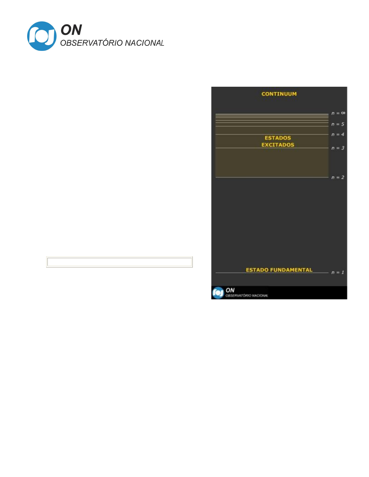 Os níveis de energia de um átomo: excitação e desexcitação Um dos aspectos básicos da mecânica quântica que está incorporado ao modelo atual do átomo, e que o faz ser completamente diferente do modelo planetário que tantas vezes é usado como analogia, é que a energia das partículas no átomo de Bohr está restrita a certos valores discretos, muito bem definidos, e somente estes valores são permitidos. Dizemos que a energia do átomo é quantizada. Isto significa que somente certas órbitas, com raios bem estabelecidos, podem ser ocupadas pelos elétrons. As órbitas que poderiam estar situadas dentro destes intervalos estabelecidos pela mecânica quântica simplesmente não existem. A essas órbitas bem definidas e permitidas pela mecânica quântica damos o nome de níveis de energia. A figura ao lado mostra alguns níveis de energia quantizados, e portanto permitidos, para o átomo de hidrogênio. Estes níveis são designados por um número inteiro n que é chamado de número quântico. O estado (ou nível) de energia mais baixo é chamado de estado fundamental. Os estados que apresentam, sucessivamente, mais energia do que o estado fundamental são chamados de estados excitados e são designados, segundo a ordem de afastamento a partir do núcleo atômico, como primeiro estado excitado, segundo estado excitado, terceiro estado excitado, etc. As energias dos estados estacionários do átomo de hidrogênio são dadas por uma expressão muito simples. Ela é: E = 13,6 / n 2 elétronsvolts n = 1, 2, 3,... onde n é o número quântico. Nessa equação n=1 define o nível fundamental e cada um dos outros valores possíveis de n (2, 3, 4, etc.) definem os níveis excitados. Com essa simples conta podemos calcular os níveis de energia possíveis de existir em um átomo de hidrogênio. Além de uma certa energia, chamada potencial de ionização, os elétrons que pertencem ao átomo não conseguem mais ficar ligados ao núcleo. Eles passam a ser elétrons livres. A partir deste valor de energia os níveis de energia formam uma região que recebe o nome de continuum. No caso do hidrogênio seu potencial de ionização ou seja, a energia necessária para destruir a ligação do seu elétron com o núcleo atômico, transformandoo em elétron livre, é de 13,6 elétronsvolt. Dizemos então que o continuum do átomo de hidrogênio começa em 13,6 eV acima do estado fundamental. Excitação e desexcitação de um átomo Os elétrons pertencentes a um átomo podem fazer transições entre as órbitas (níveis de energia) permitidas pela mecânica quântica absorvendo ou emitindo exatamente a diferença de energia que existe entre estas órbitas. Vejamos melhor como isto acontece. Vamos supor que um elétron está em uma órbita qualquer, entre aquelas permitidas pela mecânica quântica, em torno de um núcleo. É claro que existem outras possíveis órbitas, ou níveis de energia, que este elétron pode ocupar se ele tiver energia suficiente para isto. A diferença de energia entre cada uma destas várias órbitas possíveis e aquela onde está efetivamente o elétron pode ser facilmente calculada. Vamos supor então que, por algum processo, por exemplo aquecimento, transmitimos energia para este átomo. A energia total incidente, seja qual for a sua origem, é dada pela soma das mais diversas quantidades de energia possuidas pelos fótons . Eventualmente um desses fótons pode possuir uma quantidade de energia exatamente igual à diferença de energia que existe entre algum dos possíveis níveis atômicos deste átomo e o nível onde está um elétron. Quando esse pacote de energia externa incide sobre o elétron, ele poderá absorverá um dos fótons incidentes que o formam desde que a energia desse fóton incidente corresponda exatamente à diferença de energia que existe entre um dos possíveis níveis de energia atômicos e o nível de energia onde o elétron está. Ao absorver esta energia o elétron realiza um salto quântico para o nível de energia mais alta que corresponde à sua nova energia total. Em termos mais técnicos, a diferença em energia entre esses níveis corresponde exatamente a um comprimento de onda específico da radiação incidente. Por exemplo, um elétron está no segundo nível quântico. Incidimos sobre ele radiação formada por vários fótons com energias diferentes. Entre esses fótons temos um cuja energia corresponde à diferença de energia entre, por exemplo, o nível quântico 5 e o nível 2 onde está o elétron. Nosso elétron absorve esse fóton e passa para o nível 5, ocupando agora um estado de maior excitação do que aquele em que ele estava anteriormente. Resumindo, quando o átomo encontra um fóton com uma determinada energia específica, correspondente a diferença de energia entre níveis quânticos, o fóton será absorvido pelo átomo, e o elétron saltará do nível de energia mais baixa para o nível de energia mais alta. O elétron neste novo nível de energia está em um estado excitado. No entanto, todos os elétrons que estão em estados excitados querem retornar a um nível de energia mais baixa. Para realizar isto o elétron libera um fóton, que transporta este excesso de energia, e retorna para um nível de energia correspondente a uma excitação menor. A este processo de emissão de energia damos o nome de desexcitação. Resumindo, quando um elétron excitado cai de um nível de maior energia para um de menor energia ele emite um fóton cuja energia é equivalente à diferença de energia entre estes dois níveis. Se o elétron excitado volta para o seu estado original, ele emite um fóton que tem a mesma energia que a possuida pelo fóton que o excitou inicialmente. A imagem a seguir mostra uma excitação atômica causada pela absorção de um fóton e uma desexcitação causada pela emissão de um fóton. No entanto, as regras para que a excitação ou desexcitação ocorram são muito rígidas. Em cada cas