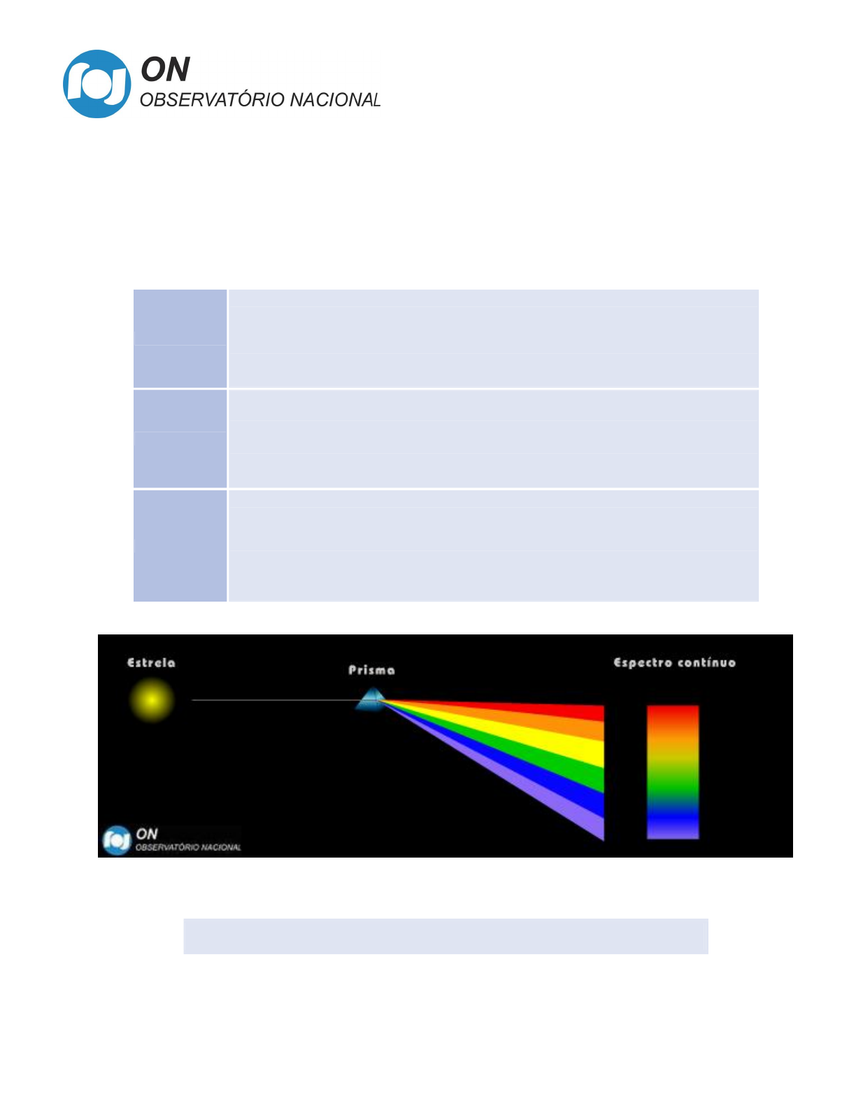 As leis da espectroscopia Por volta dos anos de 1860, Kirchhoff e Bunsen já haviam realizado um número suficientemente grande de análises espectrais. O conhecimento acumulado sobre as linhas espectrais já era suficiente a ponto de permitir que Kirchhoff formulasse três importantes enunciados sobre espectros que hoje são chamados de leis de Kirchhoff. 1 a lei • um corpo opaco e quente, produz um espectro contínuo. • o corpo opaco e quente pode ser um sólido, um líquido ou um gás altamente comprimido, e portanto denso. • o espectro contínuo é um verdadeiro "arcoíris", um conjunto completo de cores sem qualquer linha espectral traçada sobre ele. 2 a lei • um gás transparente, quente, produz um espectro onde uma série de linhas espectrais brilhantes estão traçadas contra o fundo escuro. • a este espectro damos o nome de espectro de linhas de emissão. • o número e as cores destas linhas depende de quais os elementos que estão presentes no gás. 3 a lei • se colocamos um gás transparente e frio na frente de uma fonte de espectro contínuo, o gás mais frio provoca o aparecimento de uma série de linhas escuras riscadas entre as cores do espectro contínuo. • a este espectro damos o nome de espectro de linhas de absorção. • as cores e o número das linhas de absorção depende dos elementos presentes no gás frio. É muito importante notar que as linhas brilhantes que aparecem em um espectro de emissão ocorrem exatamente nos mesmos comprimentos de onda que as linhas escuras no seu espectro de absorção. Dizendo de um modo mais físico, As linhas absorvidas por um gás a partir de um espectro contínuo são as mesmas linhas emitidas por este mesmo gás quando fornecemos energia a ele. É a temperatura relativa entre a nuvem de gás e o seu fundo que determina qual o espectro que é observado. As linhas de absorção são vistas se o fundo é mais quente do que o gás e as linhas de emissão são vistas se o fundo é mais frio do que o gás. Ambas podem ser usadas para determinar a composição química do gás. Agora podemos voltar ao espectro da luz solar obtido inicialmente por Fraunhofer. Foi Kirchhoff que mostrou que as duas linhas fortes que chamaram a atenção de Fraunhofer, e que ele chamou de linhas D, na verdade eram linhas produzidas pelo sódio na região espectral com comprimento de onda correspondente à cor amarela. A figura abaixo mostra, comparativamente, vários espectros. Inicialmente note que os comprimentos de onda mais curtos estão à esquerda e eles crescem à medida que vamos para o lado direito. Isto quer dizer que na esquerda temos maiores freqüênciase, portanto, maiores energias. De cima para baixo, a primeira imagem é o espectro contínuo emitido por um sólido aquecido. Em seguida mostramos o espectro de absorção do Sol, onde apenas as linhas mais fortes são indicadas, juntamente com os elementos que as produzem. Note que as linhas são traços escuros sobre um espectro contínuo. Mais tarde explicaremos por que razão o espectro de uma estrela é dessa forma. Em seguida mostramos os espectros de emissão de diversos elementos tais como o sódio (Na), hidrogênio (H), cálcio (Ca), mercúrio (Hg) e neônio (Ne). Muito importante é notar que as linhas de emissão que aparecem nestes espectros se alinham perfeitamente com as linhas de absorção correspondentes que estão assinaladas no espectro de absorção do Sol. Isto é uma prova de que as linhas de emissão e de absorção correspondentes têm o mesmo comprimento de onda. Tipos de espectros Espectro contínuo O espectro contínuo é mostrado na figura abaixo. Espectro de emissão A figura mostra como é formado um espectro de emissão. Espectro de absorção Este é o processo de formação de um espectro de absorção.