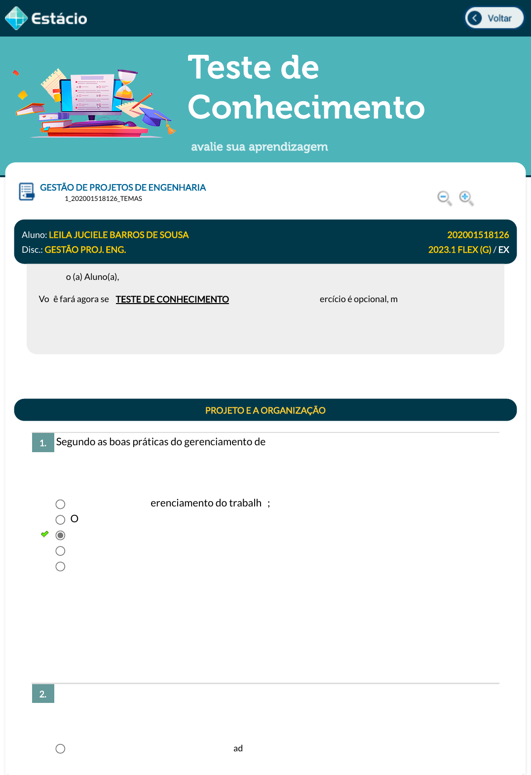 Teste de Conhecimento avalie sua aprendizagem Segundo as boas práticas do gerenciamento de projetos, delineadas pelo Guia PMBOK, os grupos de processos são um agrupamento lógico de entrada, ferramentas, técnicas e saídas. Dessa forma, o grupo de processos de Monitoramento e Controle além de possuir processos para monitorar o trabalho que está sendo executado ele também atua fazendo: Compreender os princípios e conceitos do Gerenciamento de Projetos é fundamental para a formação de um pro�ssional de TI em um mercado cada vez mais competitivo. Durante as aulas de computação a aluna Ana Carolina perguntou ao seu professor qual era o conceito do gerenciamento de projetos. Analise as a�rmativas a seguir e marque a alternativa correta sobre o que é o gerenciamento de projetos. GESTÃO DE PROJETOS DE ENGENHARIA Lupa CCE1881_202001518126_TEMAS Aluno: LEILA JUCIELE BARROS DE SOUSA Matr.: 202001518126 Disc.: GESTÃO PROJ. ENG. 2023.1 FLEX (G) / EX Prezado (a) Aluno(a), Você fará agora seu TESTE DE CONHECIMENTO! Lembre-se que este exercício é opcional, mas não valerá ponto para sua avaliação. O mesmo será composto de questões de múltipla escolha. Após responde cada questão, você terá acesso ao gabarito comentado e/ou à explicação da mesma. Aproveite para se familiarizar com este modelo de questões que será usado na sua AV e AVS. PROJETO E A ORGANIZAÇÃO 1. A orientação e o gerenciamento do trabalho; O conhecimento das partes interessadas; O controle integrado de mudanças; O registro das lições aprendidas; O plano de gerenciamento do projeto; Data Resp.: 25/05/2023 09:23:18 Explicação: A resposta correta é: O controle integrado de mudanças; 2. É a aplicação de uma metodologia as atividades do projeto. javascript:voltar(); javascript:voltar(); javascript:diminui(); javascript:aumenta(); A estrutura organizacional tem a função de organizar a empresa separando por setores e hierarquizando-os, visando de melhor atingir os objetivos estratégicos, promover uma comunicação e�ciente e e�caz. Dentre as 10 estruturas organizacionais, qual das opções abaixo possibilita um nível de alto a quase total de autoridade para o gerente de projetos? Você é Gerente de um projeto de construção de uma fábrica de alimentos. Durante a obra, chegou até você uma sugestão de mudança de escopo para uma determinada entrega do projeto. Você apresentou as características da mudança ao comitê de integrado de mudanças, que decidiu por rejeitá-la. Determine, de acordo com as alternativas abaixo, o que você deverá fazer em seguida. É o gerenciamento coordenado de um grupo de projetos, programas subsidiários e atividades de programas relacionados; Aplicação de um esforço temporário empreendido para criar um produto, serviço ou resultado único; Aplicação de conhecimentos, habilidades, ferramentas e técnicas as atividades do projeto; É vinculação dos resultados do projeto com as metas e objetivos estratégicos da organização; Data Resp.: 25/05/2023 09:25:07 Explicação: Segundo o Guia PMBOK, gerenciamento de projeto é de�nido como a aplicação de conhecimentos, habilidades, ferramentas e técnicas às atividades do projeto, a �m de atender aos seus requisitos, e permite que as organizações executem projetos de forma e�caz e e�ciente. 3. Estrutura Organizacional Matriz Forte; Estrutura Organizacional Funcional; Estrutura Organizacional Orgânico ou Simples; Estrutura Organizacional Orientada a Projeto. Estrutura Organizacional Divisional; Data Resp.: 25/05/2023 09:32:54 Explicação: A resposta correta é: Estrutura Organizacional Orientada a Projeto. ORGANIZANDO O PROJETO NO TEMPO 4. Documentar o resultado do pedido da mudança Executar a mudança, mesmo com a negativa do comitê Se recusar a modi�car o escopo do projeto, mesmo com aval do comitê Não aceitar solicitações de mudanças Executar a mudança, sem passar pelo comitê Data Resp.: 25/05/2023 09:25:45 Explicação: A resposta correta é: Documentar o resultado do pedido da mudança 5. Sequenciar atividades é um processo do gerenciamento de tempo que identi�ca e documenta os relacionamentos entre as atividades do projeto. Como este processo é implementado corretamente nos softwares de gerenciamento de projetos? A Estrutura Analítica de Projeto (EAP) é caracterizada por ser: O gerenciamento de recursos humanos, custos e comunicações constituem a base primordial para gestão de qualquer projeto. Acerca dos conceitos de gerenciamento de custos e equipe em projetos, como se chama o trabalho efetivamente realizado no projeto? Por meio da criação de atividades de ligação, com o objetivo de relacionar duas atividades principais. Por meio da elaboração de calendários para cada recurso atribuído às atividades do projeto. Por meio do preenchimento de uma planilha de restrições de atividades e recursos. Por meio da de�nição das datas de início e �m para cada atividade do projeto. Por meio do estabelecimento de atividades predecessoras e sucessoras. Data Resp.: 25/05/2023 09:31:34 Explicação: A resposta correta é: Por meio do estabelecimento de atividades predecessoras e sucessoras. 6. Um arranjo não hierárquico do escopo do projeto. Parcial, ao identi�car apenas partes do trabalho a ser realizada. Uma estrutura sequenciada temporalmente. Uma imagem grá�ca da hierarquia do projeto. Um guia para validação do escopo do projeto. Data Resp.: 25/05/2023 09:31:14 Explicação: A resposta correta é: Um guia para validação do escopo do projeto. GERENCIAMENTO DE CUSTOS E EQUIPE EM PROJETOS 7. CR - Custos Real. VR - Valor realizado. VC - Variação de custos. VP - Valor Planejado. VA - Valor Agregado. Data Resp.: 25/05/2023 09:26:23 Explicação: O Valor Agregado indica a parcela do orçamento que deveria ser gasta, considerando o trabalho realizado até o momento. Um executivo da sua empresa liga para o gerente de projetos e diz da sua preocupaç