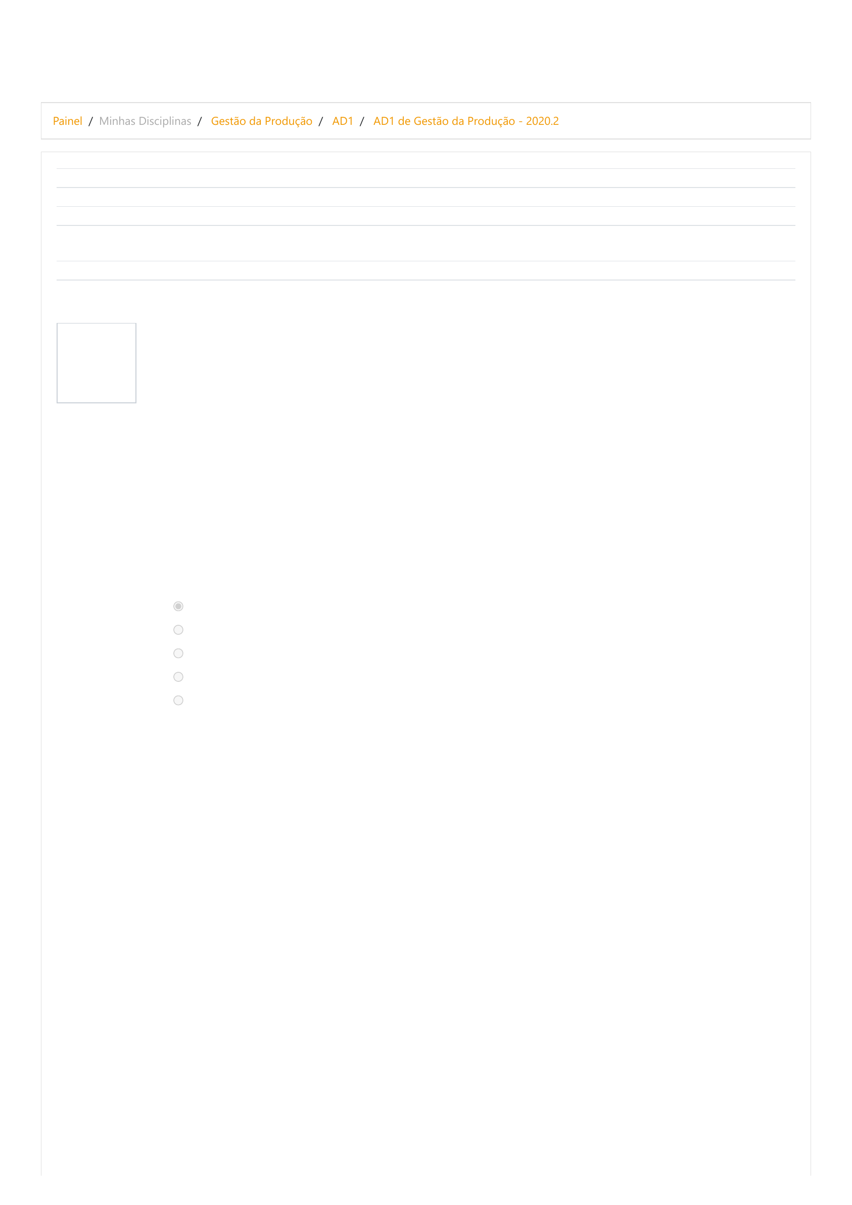 30/09/2020 AD1 de Gestão da Produção - 2020.2: Revisão da tentativa https://graduacao.cederj.edu.br/ava/mod/quiz/review.php?attempt=80709&cmid=324839 1/6 Painel / Minhas Disciplinas / Gestão da Produção / AD1 / AD1 de Gestão da Produção - 2020.2 Questão 1 Correto Atingiu 1,00 de 1,00 Iniciado em sábado, 12 set 2020, 18:58 Estado Finalizada Concluída em sábado, 12 set 2020, 20:18 Tempo empregado 1 hora 19 minutos Avaliar 5,00 de um máximo de 10,00(50%) Comentários Você teve um aproveitamento regular. Estude mais um pouco! Plataformas de delivery de comida têm mostrado resultados de venda bastante satisfatórios, impulsionados pelo isolamento social imposto pela pandemia de coronavírus que o mundo atravessa. Tal modelo de negócio apóia-se numa tríade de relacionamento que envolve cliente, restaurante e entregador, cujos interesses se encontram no aplicativo. Nesse contexto, podemos afirmar que: I-A transformação de matéria prima em bem tangível é realizada no restaurante. II-Os entregadores representam atores do processo que estão na retaguarda do serviço. III-As empresas de aplicativo substituem o contato físico do restaurante pela relação remota, caracterizando-se como operação de serviço. Está(ão) correta(s): Escolha uma: a. Somente os itens I e III. Parabéns! b. Somente os itens II e III. c. Todos os itens estão corretos d. Somente o Item II e. Somente o item I. Sua resposta está correta. A resposta correta é: Somente os itens I e III.. https://graduacao.cederj.edu.br/ava/my/ https://graduacao.cederj.edu.br/ava/course/view.php?id=137 https://graduacao.cederj.edu.br/ava/course/view.php?id=137§ion=2 https://graduacao.cederj.edu.br/ava/mod/quiz/view.php?id=324839 30/09/2020 AD1 de Gestão da Produção - 2020.2: Revisão da tentativa https://graduacao.cederj.edu.br/ava/mod/quiz/review.php?attempt=80709&cmid=324839 2/6 Questão 2 Correto Atingiu 1,00 de 1,00 Questão 3 Correto Atingiu 1,00 de 1,00 Leia o texto e assinale a alternativa correta: A agilidade no lançamento de novos produtos é uma característica da Tok&Stok, que atualmente possui uma variedade de nove mil itens. Seus produtos aliam exclusividade de design, modernidade e praticidade. Mais de oito produtos novos são lançados por dia. Dentro do conceito de pronta retirada, é importante que o desenvolvimento de novos produtos contemple questões como a praticidade de transporte e a facilidade de montagem pelo próprio cliente. Além de ser inovadora em seus produtos, a empresa conta com operações inovadoras. As lojas são normalmente simples, amplas e possuem o conceito de auto-serviço, em que o cliente pode andar por ela. Os produtos são expostos com a intenção de mostrar como ficariam na casa do cliente. Isso facilita a visualização da peça dentro de um ambiente modular cuidadosamente montado. A Tok&Stok também pensa na comodidade e no lazer de seus clientes. Algumas lojas contam com a área baby, um espaço para os pais deixarem seus filhos enquanto enquanto fazem suas compras, e o Café Design, onde os clientes podem comer um lanche ou tomar um café. (Adaptado de: KRAJEWSKI, L., RITZMAN L., MALHOTRA, M. Administração de Produção e Operações. 8 ed. São Paulo: Prentice Hall, 2009). Escolha uma: a. A área de produção possui papel proativo dentro da estratégia, sendo provedora da base para o sucesso competitivo. b. O objetivo de desempenho de flexibilidade está presente na capacidade da empresa de lançar novos produtos. Parabéns! c. O objetivo de desempenho de rapidez é negligenciado pela empresa por adotar o conceito de pronta retirada d. O objetivo de desempenho de qualidade está presente na variedade de mix da empresa. e. O objetivo de desempenho de custo está presente na oferta de áreas baby para os pais deixarem os filhos. Sua resposta está correta. As respostas corretas são: O objetivo de desempenho de flexibilidade está presente na capacidade da empresa de lançar novos produtos., A área de produção possui papel proativo dentro da estratégia, sendo provedora da base para o sucesso competitivo. A MNM produz uma linha de motores para caminhões chamada StarFox. A produção na fábrica brasileira apresentou custos mais competitivos de que outros países. Os motores são enviados até uma fábrica em general Escubedo, no México. A fábrica brasileira produz modelos básicos utilizando peças trazidas de Chicago, nos Estados Unidos. Chicago também abastece a unidade Mexicana com itens de diferenciação dos modelos de motores para finalização dos mesmos. As poucas variedades de modelos básicos não finalizados que saem do Brasil transformam-se em dezenas de variedades de modelos acabados no México. À finalização posterior do produto, de acordo com a demanda por cada modelo, dá-se o nome de postergação da produção. Assinale a alternativa correta: Escolha uma: a. Ao planejar que a finalização dos motores ocorresse no México, a empresa conseguiu conciliar objetivos de desempenho como flexibilidade e custos. Parabéns! b. Ao planejar que a finalização dos motores ocorresse no México, nota-se uma priorização do objetivo de rapidez em detrimento da flexibilidade. c. A análise de trade-off mostrada no texto permite conciliar objetivos de desempenho como qualidade e confiabilidade. d. Ao planejar que a finalização dos motores ocorresse no México, nota-se uma priorização do objetivo de qualidade em detrimento de custos. e. A análise de trade-off mostrada no texto permite conciliar objetivos de desempenho como flexibilidade, qualidade e custo. Sua resposta está correta. A resposta correta é: Ao planejar que a finalização dos motores ocorresse no México, a empresa conseguiu conciliar objetivos de desempenho como flexibilidade e custos.. 30/09/2020 AD1 de Gestão da Produção - 2020.2: Revisão da tentativa https://graduacao.cederj.edu.br/ava/mod/quiz/review.php?attempt=80709&cmid=324839 3/6 Questão 4 Incorreto Atingiu 0,0