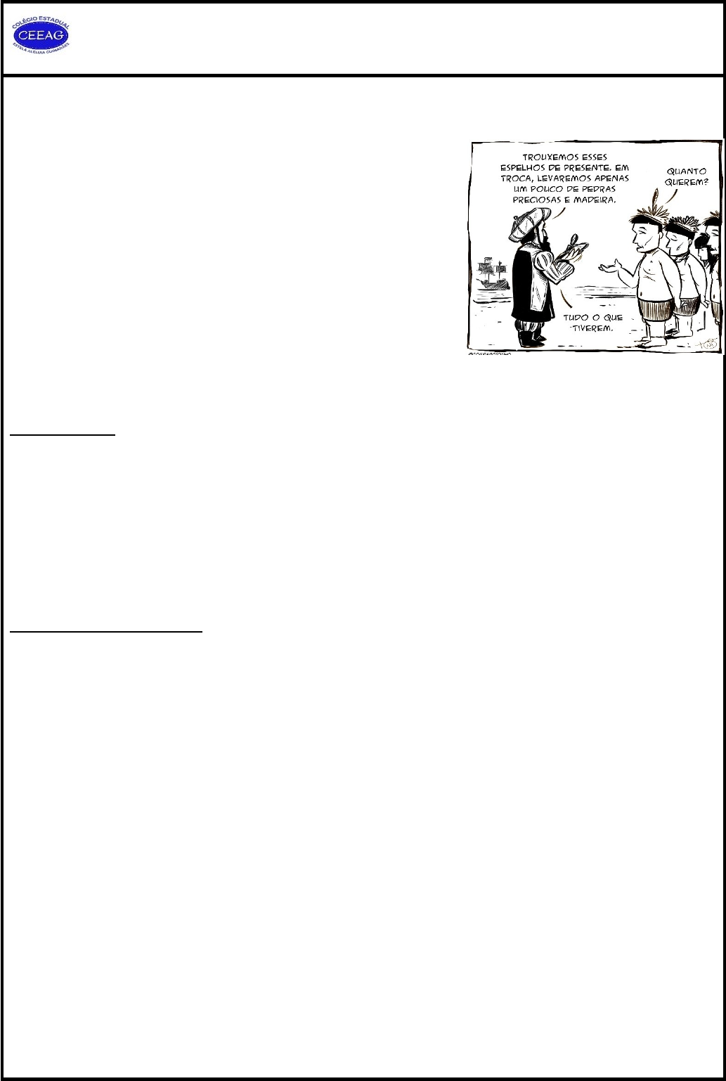 COLÉGIO ESTADUAL ESTELA ALELUIA GUIMARÃES Rua Carmosina Trinchão – Centro / Taperoá-Ba Profª. Lumi | Disciplina: Estação dos Saberes VII - Identidade, Pertencimento com ênfase em Relações Étnico-Raciais Colonialidade e o pensamento decolonial A chegada dos colonizadores/exploradores portugueses no século XV destinou o Brasil a um rumo até então desconhecido pelos povos autóctones que aqui habitavam. Os processos de mudanças que ocorreram a partir deste momento foram chamados de colonização. Estes processos se caracterizam pela exploração de terras e mão-de-obra indígena, posteriormente africana, a implantação de um novo sistema econômico (conhecida como plantation) e a imposição de novas culturas e religião (no caso, a religião cristã católica). Com isso, ao longo da história da formação da sociedade brasileira houve uma série de apagamentos de memórias indígenas, latino-americanas e afrodescendentes, favorecendo, assim, a visão eurocêntrica. O eurocentrismo, por sua vez, é uma visão de mundo centrada em valores europeus, onde a cultura europeia é vista como referência e modelo de sociedade. Fonte: Toni DÁgostinho. Disponível em: http://www.acaricaturadobrasil.com.br/2020/06/charge-colonizacao.html COLONIALIDADE Trata-se de conceito introduzido pelo sociólogo peruano Anibal Quijano, no final da década de 1980 e início da década de 1990, que significa o desdobramento de civilizações a partir de uma perspectiva e práticas Ocidentais. Quando pensarmos em Ocidental, devemos ter em mente a civilização europeia que virou modelo de sociedade em termos culturais, sociais, econômicos e até tecnológicos, entre os séculos XVI e XIX no Brasil. Porém, estas práticas não se difundiram de forma natural da Europa para outros continentes. Houve, na verdade, uma imposição delas com a justificativa de tornar os indivíduos civilizados e modernos. Acontece que, isto resultou em uma série de problemáticas que perpassam décadas e persistem até hoje. Analise a charge a seguir: PENSAMENTO DECOLONIAL Agora que você já sabe o que é colonialidade, vamos te apresentar o termo decolonialidade ou pensamento decolonial. Este ainda não possui um conceito fechado, mas vem sendo estudado e analisado por diversos pensadores com o intuito de fortalecer a luta contra a violência exercida pela dominação de povos a partir de uma perspectiva etnocêntrica. O etnocentrismo, diga-se de passagem, foi um conceito criado pelo sociólogo norte-americano William Graham e diz respeito a um grupo étnico ou povo que considera apenas os valores de sua própria cultura ao analisar as demais. Pode-se dizer, nesse sentido, que o pensamento decolonial é uma corrente teórica latino-americana e americanista que visa o rompimento da forma de dominação europeia com relação a outros povos. Nessa relação, apresentam-se alguns pressupostos para se entender o processo de colonização, que foi imposto pelos europeus a outras populações a partir do século XVI e permanece culturalmente até os dias atuais. Os estudos do pensamento decolonial têm como precursor o sociólogo peruano Aníbal Quijano e é aprofundado pelo grupo de intelectuais que se ocupam sobre a M/C/D (modernidade, colonialidade e decolonialidade). De acordo com Quijano não há modernidade sem colonialidade, de onde decorre o processo de ocultação do controle econômico, da natureza e dos recursos naturais, do gênero e da sexualidade, da subjetividade e do conhecimento. [...] ************************Questões para análise (responder no caderno)**************************** 1) Levando em consideração o que foi analisado durante as aulas e a charge, pode-se dizer que somente bens materiais foram retirados dos povos originários das terras brasileiras? 2) Quando foi criado e de quem é a autoria do conceito de colonialidade? 3) Explique o conceito de EUROCENTRISMO. 4) Caracterize o pensamento decolonial.