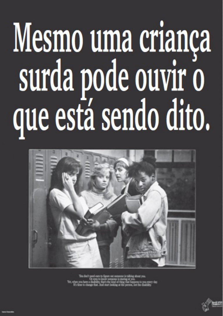 Desafio Tornar o dia a dia das pessoas surdas mais agradável e acolhedor é fundamental. Para tanto, é preciso que os ouvintes tenham maior conhecimento acerca das pessoas surdas. Assim, a desinformação e, consequentemente, o preconceito tendem a diminuir, criando maior aproximação e sentimento de empatia entre surdos e ouvintes. Neste Desafio, você vai observar o cartaz de uma campanha de conscientização, ilustrado na obra de Smith (2008, p. 304). A campanha se refere à convivência entre surdos e ouvintes no ambiente escolar. Diante dessa situação, analise a mensagem da campanha, explicitando o que ela parece destacar, e explique como esse tipo de peça publicitária ajuda a criar um ambiente mais inclusivo. Sua resposta Peças publicitárias de conscientização que promovem a convivência entre surdos e ouvintes no ambiente escolar podem ter várias mensagens e objetivos, dependendo do design e das informações apresentadas. Geralmente, tais campanhas buscam destacar a importância da comunicação, respeito, compreensão e inclusão entre pessoas surdas e ouvintes na escola. Essas peças podem destacar a língua de sinais como uma forma de comunicação fundamental para a inclusão dos surdos, enfatizando que todos os alunos devem ter acesso a uma educação de qualidade, independentemente de sua audição. A campanha pode incentivar atitudes positivas e acolhedoras por parte dos ouvintes, encorajando-os a aprender algumas noções básicas de língua de sinais e a se envolverem de maneira mais empática com seus colegas surdos. Além disso, as peças publicitárias podem apresentar exemplos de como pequenos gestos, como usar gestos ou sinais simples, olhar diretamente para a pessoa surda ao se comunicar e estar disposto a aprender, podem contribuir para um ambiente mais inclusivo e amigável. Em geral, esse tipo de campanha de conscientização visa sensibilizar os ouvintes sobre as necessidades e experiências dos surdos, reduzir estigmas e preconceitos e promover uma cultura de respeito e inclusão no ambiente escolar, o que contribui para criar um ambiente mais acolhedor e positivo para todos. Enviado em: 06/08/2023 20:02 Padrão de resposta esperado A foto da campanha mostra um grupo de alunos que, aparentemente, faz observações sobre outra pessoa à frente do grupo. A frase "mesmo uma criança surda pode ouvir o que está sendo dito" sugere que o grupo está comentando algo sobre uma criança surda. Trata-se, portanto, de uma situação em que crianças surdas sentem algum tipo de preconceito ou de discriminação por parte de crianças ouvintes. Diante de tal quadro, alguns elementos podem ser destacados: - A surdez consiste na perda maior ou menor da percepção normal dos sons. Entretanto, existem outras maneiras de se compreender dado contexto além do uso apenas de nossas capacidades auditivas. Com percepção visual e sensibilidade, o surdo pode captar questões presentes no ambiente à sua volta. - A ideia de que o surdo não escuta e, portanto, podemos falar sobre ele sem pudores, demonstra um desrespeito com o próximo. Respeito e alteridade são elementos indispensáveis para se pensar uma convivência sadia entre as crianças no ambiente escolar. - É preciso superar a ideia, ainda presente no universo escolar, de que a pessoa com alguma deficiência pode ser vista como alguém diferente. Tal "diferença" é quase sempre considerada em função de atitude de discriminação ou de um preconceito. Peças e cartazes que tratam do cotidiano da escola e ilustram posturas arraigadas no desrespeito e no preconceito servem como um estímulo para os alunos na medida em que denunciam uma postura errada e levam à reflexão sobre o respeito e sobre uma convivência mais harmoniosa entre todos. 1. Na educação inclusiva, é fundamental que o professor esteja em constante processo de reciclagem, sendo capaz não apenas de detectar as necessidades educacionais especiais, estando atento ao comportamento e às queixas de cada aluno, mas também de tomar atitudes corretas diante das situações que se apresentam. Sobre esse enunciado, assinale a alternativa correta. A. Apesar de seus esforços, o professor não consegue garantir que seu aluno com surdez progrida como os demais e, por isso, se sente fracassado. B. Um aluno cego apresenta mau desempenho. O professor atribui isso à sua deficiência, propondo-lhe atividades mais fáceis que aquelas propostas aos demais. C. No processo de atendimento ao aluno surdo, o professor não leva em conta a presença do intérprete educacional na sala de aula. D. Para melhor atender ao aluno cego, o professor aprende o método braile e elabora os textos e as atividades na forma adequada para a leitura do aluno. E. Um aluno posicionado no fundo da sala queixa-se por não ouvir bem. O professor o transfere para a primeira fila como solução para o problema. A alternativa correta é: E. Um aluno posicionado no fundo da sala queixa-se por não ouvir bem. O professor o transfere para a primeira fila como solução para o problema. Esta ação do professor demonstra estar atento às queixas e necessidades do aluno e tomar uma atitude correta em resposta à situação apresentada. Mudar o aluno para a primeira fila pode facilitar a audição e a comunicação, demonstrando um esforço em proporcionar um ambiente mais inclusivo para o aluno com dificuldades de audição. Parte superior do formulário 2. Termos como "cegueira" e "baixa visão" são empregados para definir condições específicas de pessoas com necessidades visuais. Com base nos seus conhecimentos sobre tal grupo, assinale a alternativa correta. A. As crianças cegas conseguem interagir com mais facilidade com as crianças videntes do que com as crianças que têm baixa visão. B. Chamamos de pessoas com baixa visão os indivíduos que não conseguem ler corretamente. C. Comunicação gestual e visual pode ser usada como recurso na interação com os cegos. D. É conside