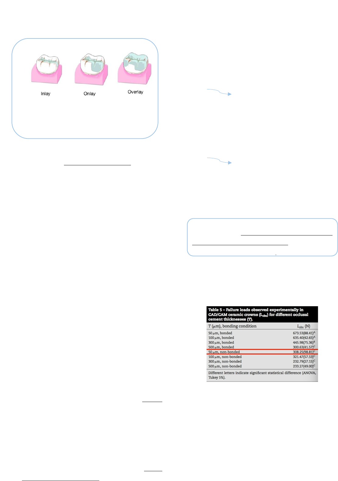 CIMENTAÇÃO EM PPF Revisão: Inlay – quando não envolve cúspide; Onlay – quando envolve cúspide; Overlay – quando envolve todas as cúspides; Endocrow – sem remanescente coronário. Cimentação é o ato de ligar e unir superfícies, promover a união entre estruturas, evitar o deslocamento dos componentes durante a função. # Adesão (mudou a odontologia): O QUE PRECISAMOS FAZER PARA ADERIR? DEPENDE (3 PILARES): QUAL O SUBSTRATO? Onde eu quero aderir: dente, metal ou resina composta – interagimos com diferentes materiais para buscar o melhor resultado em cada caso. QUAL É A RESTAURAÇÃO? QUAL O TIPO DE MATERIAL? Interfere profundamente na forma que vamos cimentar. Buscamos interação com a restauração: cerâmicas – ácido sensíveis ou não (quais cerâmicas são efetivas com o ácido); metalocerâmica. QUAL É O CIMENTO? Cada um tem o seu protocolo – cimentos com ou sem protocolo acido seletivo > mesma variabilidade dos protocolos adesivos, nos cimentos (sigo o protocolo do fabricante). Se eu quero variar o protocolo de tratamento do dente, alguns protocolos me permitem variar e outros não – regra primaria. Literatura suporta que a cimentação deve ser sempre ADESIVA. POR QUE CIMENTAR ADESIVAMENTE É IMPORTANTE? Reduz o risco de infiltração marginal/ recidiva de cárie: Aderir leva a maior longevidade (cimentação faz com que o dente restaurado dure mais tempo – evita o ciclo restaurador repetitivo), reduz o risco de infiltração marginal e o risco de recidiva de cárie (cola que utilizamos para adesão - cimento resinoso, temos uma interação sobre o substrato/ é mais estável). Reforça mecanicamente o sistema (melhor distribuição de tensão restauração - remanescente) Monobloco: quando se tem uma adesão muito boa entre as peças, as forças incididas sobre é dissipada sobre outras regiões (união da peça com a estrutura dental) > estruturas bem unidas/ adesão forte; Retentores, facetas e laminados. Pino de fibra de vidro: módulos semelhantes ao do dente – mais parecido com um monobloco. Quando falamos em adesão, pensamos na adesão ideal (formação de um “corpo único”) - cimentação adesiva faz nos aproximar mais do contexto ideal. Resumindo: sempre que estivermos lidando com prótese dentaria devemos cimentar com técnicas adesivas, independente do substrato (considerando o substrato base e a restauração). ESPESSURA: cuidado! À medida que aumentamos a espessura do cimento, a performance do cimento diminui (mais bolhas, adesão mais fraca, reforço mecânico inferior) - perda das propriedades da adesão. Seguindo a tabela, podemos deduzir que: à medida que aumentamos a espessura do cimento a técnica adesiva e não adesiva tornam-se semelhante. P.S.: não podemos ter distorção na moldagem, muito menos alivio do modelo na confecção da restauração - perda de tudo que “construímos”. COMO OTIMIZAR A ADESÃO ENTRE SUBSTRATOS? Precisamos que estejam no melhor intimo contato possível. 22/06/2023 – Amanda Pollo. Aproximamos duas superfícies tornando-as em intimo contato e preencher a superfícies entre esses substratos com algum agente/ cola - solda frio. Cimentar = colocar em intimo contato dois substratos (um espaço mínimo / menor possível) e interagir quimicamente entre esses dois substratos. Quando escolhemos um cimento, temos que considerar que ele deva propiciar um microembricamento mecânico, ou seja, preencher as rugosidades existentes da superfície do material e ter uma interação química com o substrato. CIMENTO RESINOSO Único cimento que é, classicamente, conhecido como potencial adesivo. Foram introduzidos desde 1952 – grandes avanços nos últimos 20 anos. Compósitos com baixa viscosidade e alta adesividade (a viscosidade é o ponto chave desse compósito); Ativação: estritamente químicos, estritamente foto ou duais (presa química ou foto); Nas aminas terciarias que são responsáveis pela presa química, a perda de estabilidade de cor de um cimento - manchamento de interface. Por isso, temos no mercado cimentos fotopolimerizáveis quando temos indicações onde a estética é primordial e certeza que a luz alcança. Esteticamente, temos variações em relação ao cimento, existe a questão da estabilidade pelo método de ativação (foto). Mas existe também situações, como em facetas, em que a cor pode ser fundamental > cimentos resinosos de diferentes colorações (A1, A2). Resumindo: os cimentos resinosos são basicamente resinas compostas que tiveram sua composição personalizada/ aprimorada para apresentar características que facilitem o ato da cimentação. # Composição: Matriz resinosa + partículas de carga; À medida que aumento a quantidade de cara, temos um cimento mais viscoso e mais resistente mecanicamente. CIMENTO RESINOSOS CONVENCIONAIS: Sistema requer o uso de condicionamento e sistema adesivo; Ainda hoje são os que vão permitir o máximo de personalização no ato de cimentação – devo utilizá-lo em conjunto com o sistema adesivo, personalizamos o ato de cimentação a qualquer substrato que estou aderindo e a qualquer restauração que eu estou “grudando”. Propriedades mecânicas excelentes; Ativação dual. Atenção: a) Para cimentar, preciso buscar interagir ao máximo com o substrato, com a restauração, escolhendo o meio que me permita interagir melhor com o cenário que estamos lidando; b) Devo sempre seguir a norma do fabricante – CUIDADO! Se quero interagir com um substrato especifico, deve-se buscar um sistema que permita interagir com tal. Como é feita a cimentação adesiva? 1. PREPARO DA RESTAURAÇÃO: a) Tratamento de superfície da cerâmica: CERÂMICAS ÁCIDO SENSÍVEIS: são condicionáveis com ácido fluorídrico 5 ou 10% (extremamente toxico – cuidado para não confundir com o fosfórico); Feldspáticas (maior grau de vidro / 60 segundos o condicionamento): ataca a matriz vítrea dessa cerâmica, reabsorvendo-a, criando poros/ bu