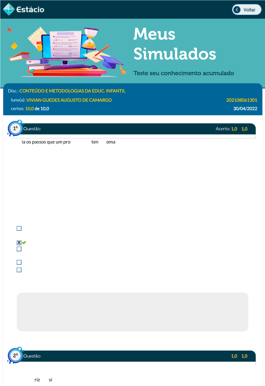 Meus Simulados Teste seu conhecimento acumulado Disc.: CONTEÚDO E METODOLOGIAS DA EDUC. INFANTIL Aluno(a): VIVIAN GUEDES AUGUSTO DE CAMARGO 202108061301 Acertos: 10,0 de 10,0 30/04/2022 Acerto: 1,0 / 1,0 Leia os passos que um professor pretende tomar em uma atividade de sua sala de aula da pré-escola. 1. Observar os interesses e curiosidades dos alunos. 2. Entender o momento de pausa e os silêncios dos alunos. 3. Valorizar as falas e as movimentações corporais. 4. Construir projetos em conjunto com os responsáveis. 5. Valorizar as interações e os diálogos. 6. Estimular as percepções do grupo em conjunto. Com relação à corporeidade na pré-escola, podemos dizer que: Trouxe a ludicidade para o ambiente educacional, e falhou apenas em transformar isso em um preceito formal. Suas atitudes são re�exivas e concebem o aluno como um corpo autoral. Adotou a dinâmica de interação de alunos, deixando que eles decidam as ações, escolham o que lhes interessa e possam analisar seus próprios resultados. Ignorou as possibilidades de diálogo. Não considerou os ritmos dos seus alunos. Respondido em 30/04/2022 06:18:35 Explicação: A atividades do professor são re�exivas e concebem o aluno como um corpo autoral. Lembre-se que a pré-escola é uma construção dialógica e autoral. Autoral porque propicia processos de a�rmação da identidade das crianças e da necessidade de leitura de sua corporeidade, de suas manifestações e cultura. E é dialógica por possibilitar o encontro com um mundo que rompe com os limites das relações centradas na família. Acerto: 1,0 / 1,0 Leia as a�rmações abaixo: ( 1 ) Valorizar o silêncio e as crianças sentadas. Questão1 a Questão2 a https://simulado.estacio.br/alunos/inicio.asp javascript:voltar(); ( 2 ) Favorecer a liberdade de exploração do espaço e de interação. ( 3 ) Valorizar a movimentação e as danças orientadas ou espontâneas do grupo. ( 4 ) Cada criança possui seu ritmo e sua forma de expressar sua corporeidade. Com relação à corporeidade das crianças numa sala de aula da pré-escola, quais das a�rmações que você acabou de ler estão corretas? 2, 3 e 4. 1, 3 e 4. 1 e 3. 1 e 4. 1, 3. Respondido em 30/04/2022 06:19:08 Explicação: A resposta certa é: 2, 3 e 4. Acerto: 1,0 / 1,0 Visando a uma Educação Infantil que garanta o pleno direito às aprendizagens signi�cativas, a organização de um espaço dedicado ao desenvolvimento de crianças de 0 a 3 anos e 11 meses deve ter claras suas necessidades. Assinale a alternativa que apresenta elementos de suma importância em um espaço de creche bem organizado: Uma decoração colorida, com personagens infantis conhecidos das crianças, e área externa. Mesas e cadeiras na altura das crianças, quadro branco e uma estante com livros de histórias. Berços para quem estiver com sono, caixa de brinquedos e mesas para atividades. Estante baixa para acesso aos brinquedos, berços, mesas e cadeiras e área externa. Áreas abertas, semiabertas, cantinhos reservados e área externa. Respondido em 30/04/2022 06:32:32 Explicação: A resposta certa é: Áreas abertas, semiabertas, cantinhos reservados e área externa. Acerto: 1,0 / 1,0 Pesquisas atuais apontam para a potência dos bebês em aprender e que cuidados de qualidade devem atender duas necessidades essenciais para a ampliação de suas descobertas. Assinale a alternativa que apresenta essas duas necessidades: Silêncio e alimentação. Cercado e andador. Afeto e motricidade livre. Alimentação e sono. Afeto e banho. Respondido em 30/04/2022 06:19:54 Questão3 a Questão4 a Explicação: A resposta certa é: Afeto e motricidade livre. Acerto: 1,0 / 1,0 Para a construção de um acervo literário de uma sala de aula da educação infantil, é correto a�rmar que... Não se pode trazer livros de estilos diferentes, mas apenas os de literatura infantil. É preciso ofertar materiais diversi�cados que estimulem a curiosidade dos alunos. Deve-se escolher apenas livros com imagens e muito coloridos. Utilizam-se livros adequados para limitar a curiosidade dos alunos. Limita-se o material e escolhem-se os textos mais fáceis. Respondido em 30/04/2022 06:33:40 Explicação: A resposta certa é: É preciso ofertar materiais diversi�cados que estimulem a curiosidade dos alunos. Acerto: 1,0 / 1,0 Leia as a�rmações a seguir e diga quais são verdadeiras (V) ou falsas (F) em relação à organização da sala de aula na educação infantil. ( ) Deve criar memórias positivas nos alunos. ( ) Estimula as trocas. ( ) Fomenta os processos de escolhas. ( ) É mais fácil para o trabalho do professor. Podemos dizer que: Todas as alternativas são verdadeiras. Falso, verdadeiro, verdadeiro, verdadeiro. Verdadeiro, falso, falso, falso. Verdadeiro, verdadeiro, verdadeiro e falso. Falso, verdadeiro, falso, verdadeiro. Respondido em 30/04/2022 06:23:23 Explicação: A resposta certa é: Falso, verdadeiro, falso, verdadeiro. Acerto: 1,0 / 1,0 Qual dos documentos a seguir não é um marco legal que embasa a Base Nacional Comum Curricular? Lei de Diretrizes e Bases da Educação (LDB 9.394/96). Questão5 a Questão6 a Questão7 a Indicadores de Qualidade na Educação. Diretrizes Curriculares Gerais para a Educação Básica de 2010. Plano Nacional de Educação de 2014. Constituição Federal de 1988. Respondido em 30/04/2022 06:22:29 Explicação: A resposta certa é: Indicadores de Qualidade na Educação. Acerto: 1,0 / 1,0 De acordo com a BNCC, os campos de experiências na educação infantil se referem a um arranjo curricular que acolhe as situações e vivências concretas da vida cotidiana das crianças, articulando-os aos saberes e conhecimentos do patrimônio cultural. Sendo assim, assinale a alternativa que pontua os cinco campos de experiências tratado no documento: O eu, o outro e o nós; Corpo, gestos e movimentos; Traços, sons, cores e formas; Escuta, fala, pensamento e imaginação; Espaços, tempos, quantida