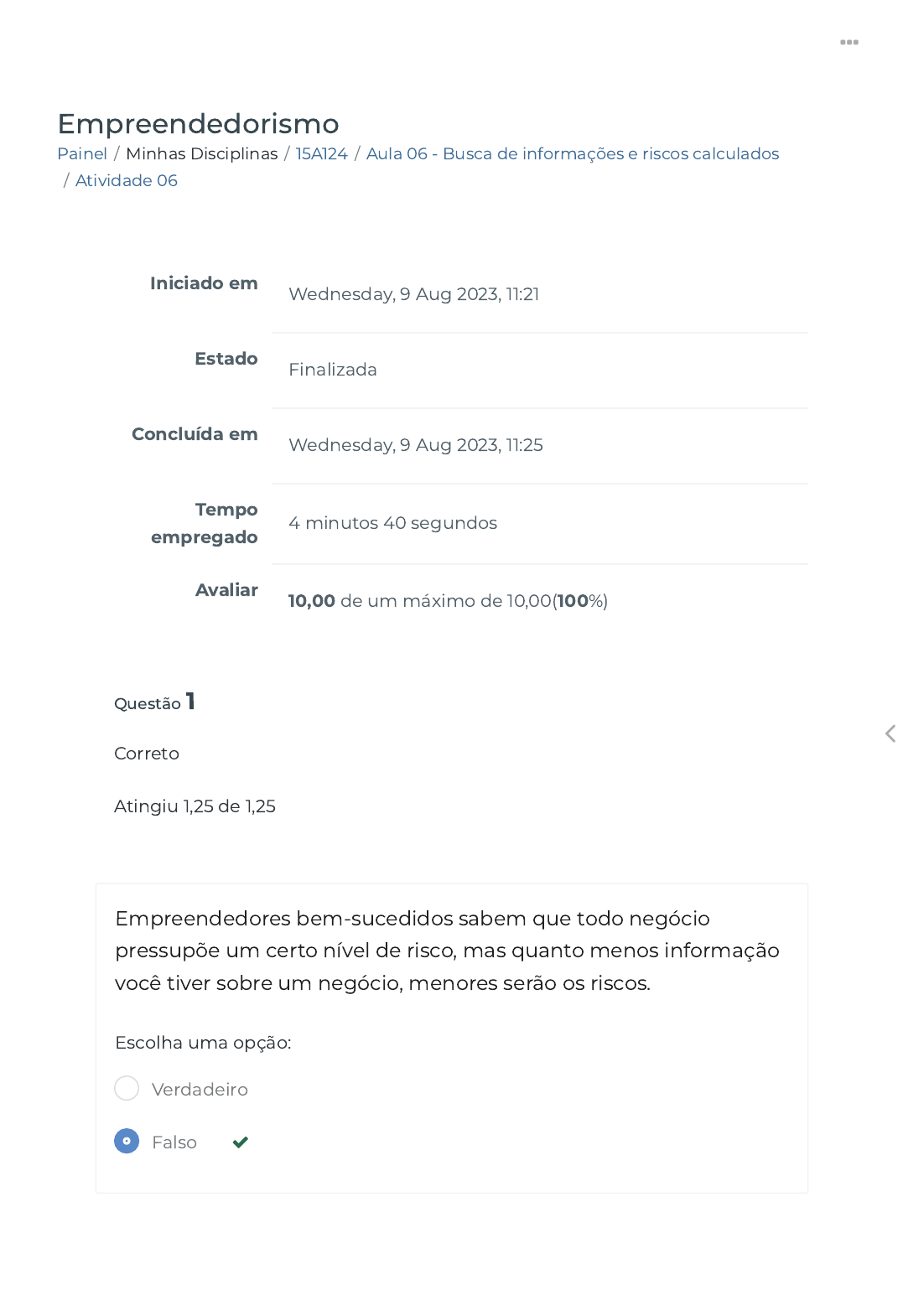 09/08/23, 10:25 Atividade 06 https://ava.politecnicabr.com.br/mod/quiz/review.php?attempt=5376838 1/5 Painel / Minhas Disciplinas / 15A124 / Aula 06 - Busca de informações e riscos calculados / Atividade 06 Empreendedorismo Iniciado em Wednesday, 9 Aug 2023, 11:21 Estado Finalizada Concluída em Wednesday, 9 Aug 2023, 11:25 Tempo empregado 4 minutos 40 segundos Avaliar 10,00 de um máximo de 10,00(100%) Questão 1 Correto Atingiu 1,25 de 1,25 Empreendedores bem-sucedidos sabem que todo negócio pressupõe um certo nível de risco, mas quanto menos informação você tiver sobre um negócio, menores serão os riscos. Escolha uma opção: Verdadeiro Falso https://ava.politecnicabr.com.br/my/ https://ava.politecnicabr.com.br/course/view.php?id=883 https://ava.politecnicabr.com.br/course/view.php?id=883#section-7 https://ava.politecnicabr.com.br/mod/quiz/view.php?id=29044 https://ava.politecnicabr.com.br/ 09/08/23, 10:25 Atividade 06 https://ava.politecnicabr.com.br/mod/quiz/review.php?attempt=5376838 2/5 Questão 2 Correto Atingiu 1,25 de 1,25 Um empreendedor de sucesso se dedica pessoalmente a obter todas as informações de que precisa e trata de de�nir quais são aquelas que possuem uma estreita relação com os riscos que está correndo ou poderá correr. Escolha uma opção: Questão 3 Correto Atingiu 1,25 de 1,25 Brainstorming: técnica de criatividade e resolução de problemas que consiste em anotar todas as ideias relacionadas com um determinado tema que vierem à cabeça. Escolha uma opção: Verdadeiro Falso Verdadeiro Falso https://ava.politecnicabr.com.br/ 09/08/23, 10:25 Atividade 06 https://ava.politecnicabr.com.br/mod/quiz/review.php?attempt=5376838 3/5 Questão 4 Correto Atingiu 1,25 de 1,25 Existem várias oportunidades de negócios e várias maneiras de se começar um. Empreendedores de sucesso estudam as diferentes alternativas e escolhem aquela que para eles representa o maior risco. Escolha uma opção: Questão 5 Correto Atingiu 1,25 de 1,25 Os estudiosos da personalidade dos empreendedores bem- sucedidos a�rmam que eles não possuem um certo senso de descon�ança que os mantém alertas sobre ameaças em potencial. Escolha uma opção: Verdadeiro Falso Verdadeiro Falso https://ava.politecnicabr.com.br/ 09/08/23, 10:25 Atividade 06 https://ava.politecnicabr.com.br/mod/quiz/review.php?attempt=5376838 4/5 Questão 6 Correto Atingiu 1,25 de 1,25 Empreendedores bem-sucedidos possuem um alto grau de internalidade, o que signi�ca que avaliam o resultado de cada situação em que correram um certo tipo de risco para saber o que �zeram que os levou a um determinado resultado. Escolha uma opção: Questão 7 Correto Atingiu 1,25 de 1,25 Pessoas com alta motivação por realização competem consigo mesmas, não com os outros. Por isso, empreendedores de sucesso não se colocam em situações que representam riscos excessivos como forma de impressionar outras pessoas. Escolha uma opção: Verdadeiro Falso Verdadeiro Falso https://ava.politecnicabr.com.br/ 09/08/23, 10:25 Atividade 06 https://ava.politecnicabr.com.br/mod/quiz/review.php?attempt=5376838 5/5 © 2022 - Escola Politécnica Brasileira Questão 8 Correto Atingiu 1,25 de 1,25 A informação é a matéria-prima para uma análise dos riscos envolvidos em um determinado negócio e para ações concretas que visem a reduzir esses riscos. Escolha uma opção: Verdadeiro Falso Entre em Contato https://www.politecnicabr.com.br 0800 084 2627 0800 084 2627 Links Úteis Dicas da nossa Diretora Acadêmica Planner de Estudos Declaração de Matrícula Orientações do AVA Abertura de Ticket Fale com o Tutor Cronograma de Estudos Manual de Estágio Manual de Competência Siga-nos nas redes sociais https://ava.politecnicabr.com.br/mod/quiz/0 https://www.politecnicabr.com.br/ https://soundcloud.com/user-501638417/sets/escola-politecnica-brasileira https://storage.googleapis.com/sirius-pubstore/semestre_plannerdeestudo%20poli.pdf https://storage.googleapis.com/sirius-pubstore/declaracao_matricula.pdf https://storage.googleapis.com/sirius-pubstore/orientacoes_ava.pdf https://storage.googleapis.com/sirius-pubstore/abertura_ticket.pdf https://storage.googleapis.com/sirius-pubstore/fale_com_tutor.pdf https://storage.googleapis.com/sirius-pubstore/cronograma_estudos.pdf https://storage.googleapis.com/sirius-pubstore/manual_estagio.pdf https://storage.googleapis.com/sirius-pubstore/manual_competencia.pdf https://www.facebook.com/politecnicabr https://www.instagram.com/politecnicabr_oficial https://ava.politecnicabr.com.br/