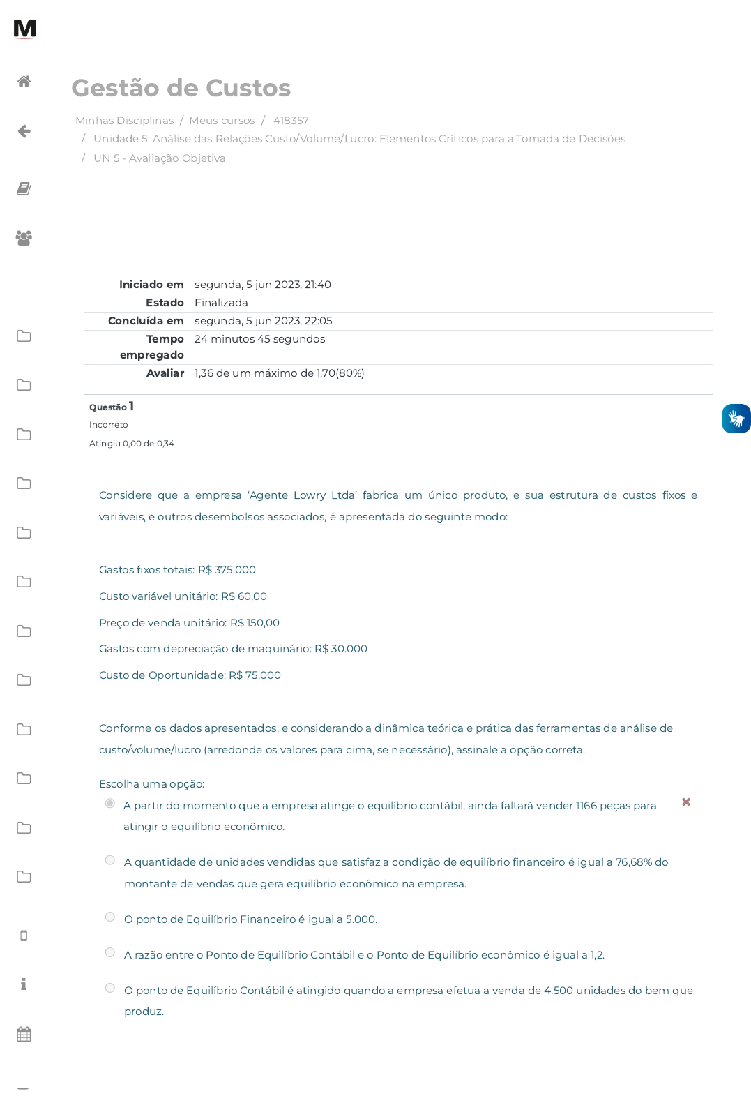 05/06/2023, 22:05 UN 5 - Avaliação Objetiva: Revisão da tentativa https://avap.multivix.edu.br/mod/quiz/review.php?attempt=3175009&cmid=1316819 1/5 Minhas Disciplinas / Meus cursos / 418357 / Unidade 5: Análise das Relações Custo/Volume/Lucro: Elementos Críticos para a Tomada de Decisões / UN 5 - Avaliação Objetiva Gestão de Custos Iniciado em segunda, 5 jun 2023, 21:40 Estado Finalizada Concluída em segunda, 5 jun 2023, 22:05 Tempo empregado 24 minutos 45 segundos Avaliar 1,36 de um máximo de 1,70(80%) Questão 1 Incorreto Atingiu 0,00 de 0,34 Considere que a empresa ‘Agente Lowry Ltda’ fabrica um único produto, e sua estrutura de custos �xos e variáveis, e outros desembolsos associados, é apresentada do seguinte modo: Gastos �xos totais: R$ 375.000 Custo variável unitário: R$ 60,00 Preço de venda unitário: R$ 150,00 Gastos com depreciação de maquinário: R$ 30.000 Custo de Oportunidade: R$ 75.000 Conforme os dados apresentados, e considerando a dinâmica teórica e prática das ferramentas de análise de custo/volume/lucro (arredonde os valores para cima, se necessário), assinale a opção correta. Escolha uma opção: A partir do momento que a empresa atinge o equilíbrio contábil, ainda faltará vender 1166 peças para atingir o equilíbrio econômico. A quantidade de unidades vendidas que satisfaz a condição de equilíbrio �nanceiro é igual a 76,68% do montante de vendas que gera equilíbrio econômico na empresa. O ponto de Equilíbrio Financeiro é igual a 5.000. A razão entre o Ponto de Equilíbrio Contábil e o Ponto de Equilíbrio econômico é igual a 1,2. O ponto de Equilíbrio Contábil é atingido quando a empresa efetua a venda de 4.500 unidades do bem que produz. https://avap.multivix.edu.br/my/ https://avap.multivix.edu.br/course/view.php?id=20196 https://avap.multivix.edu.br/course/view.php?id=20196§ion=6 https://avap.multivix.edu.br/mod/quiz/view.php?id=1316819 https://avap.multivix.edu.br/my/ https://avap.multivix.edu.br/course/view.php?id=20196 https://avap.multivix.edu.br/user/index.php?id=20196 https://avap.multivix.edu.br/course/view.php?id=20196§ion=1 https://avap.multivix.edu.br/course/view.php?id=20196§ion=2 https://avap.multivix.edu.br/course/view.php?id=20196§ion=3 https://avap.multivix.edu.br/course/view.php?id=20196§ion=4 https://avap.multivix.edu.br/course/view.php?id=20196§ion=5 https://avap.multivix.edu.br/course/view.php?id=20196§ion=6 https://avap.multivix.edu.br/course/view.php?id=20196§ion=7 https://avap.multivix.edu.br/course/view.php?id=20196§ion=8 https://avap.multivix.edu.br/course/view.php?id=20196§ion=9 https://avap.multivix.edu.br/course/view.php?id=20196§ion=10 https://avap.multivix.edu.br/course/view.php?id=20196§ion=11 https://avap.multivix.edu.br/course/view.php?id=20196§ion=12 https://avap.multivix.edu.br/hooks/portal/ https://avap.multivix.edu.br/mod/page/view.php?id=1252%2F%22%20target%3D%22_blank https://avap.multivix.edu.br/calendar/view.php/ https://avap.multivix.edu.br/local/staticpage/view.php?page=biblioteca https://avap.multivix.edu.br/ 05/06/2023, 22:05 UN 5 - Avaliação Objetiva: Revisão da tentativa https://avap.multivix.edu.br/mod/quiz/review.php?attempt=3175009&cmid=1316819 2/5 Questão 2 Correto Atingiu 0,34 de 0,34 A empresa ‘Cleet Tecnologia e Serviços de Informação Ltda.’ elabora softwares dedicados para a gestão �nanceira de microempresas, e realiza vendas mensais médias equivalentes a vinte unidades, a um preço de venda igual a R$ 5.000. Os custos e despesas �xas são iguais a R$ 28.500, e os custos e despesas variáveis são equivalentes a 44,5% do preço de venda unitário. Sabe-se, ainda, que os custos de oportunidade são iguais a 3,5% das receitas de venda. A partir do conteúdo apresentado, e arredondando para cima os valores, se necessário, avalie as a�rmações a seguir. I – A Margem de Contribuição total é igual a R$ 2.775 II – O ponto de equilíbrio econômico é igual a 12. III – A Margem de Segurança é igual a 8. É correto o que se a�rma em Escolha uma opção: I e III, apenas. I, apenas. II, apenas. II e III, apenas. I, II, III. https://avap.multivix.edu.br/my/ https://avap.multivix.edu.br/course/view.php?id=20196 https://avap.multivix.edu.br/user/index.php?id=20196 https://avap.multivix.edu.br/course/view.php?id=20196§ion=1 https://avap.multivix.edu.br/course/view.php?id=20196§ion=2 https://avap.multivix.edu.br/course/view.php?id=20196§ion=3 https://avap.multivix.edu.br/course/view.php?id=20196§ion=4 https://avap.multivix.edu.br/course/view.php?id=20196§ion=5 https://avap.multivix.edu.br/course/view.php?id=20196§ion=6 https://avap.multivix.edu.br/course/view.php?id=20196§ion=7 https://avap.multivix.edu.br/course/view.php?id=20196§ion=8 https://avap.multivix.edu.br/course/view.php?id=20196§ion=9 https://avap.multivix.edu.br/course/view.php?id=20196§ion=10 https://avap.multivix.edu.br/course/view.php?id=20196§ion=11 https://avap.multivix.edu.br/course/view.php?id=20196§ion=12 https://avap.multivix.edu.br/hooks/portal/ https://avap.multivix.edu.br/mod/page/view.php?id=1252%2F%22%20target%3D%22_blank https://avap.multivix.edu.br/calendar/view.php/ https://avap.multivix.edu.br/local/staticpage/view.php?page=biblioteca https://avap.multivix.edu.br/ 05/06/2023, 22:05 UN 5 - Avaliação Objetiva: Revisão da tentativa https://avap.multivix.edu.br/mod/quiz/review.php?attempt=3175009&cmid=1316819 3/5 Questão 3 Correto Atingiu 0,34 de 0,34 A empresa ‘Mr. Finch Comércio e Serviços Ltda.’ fabrica um determinado produto e o coloca 40.000 unidades do mesmo no mercado, por mês, ao preço unitário de R$ 25,00. Seus gastos �xos totais, ao longo de um período de tempo de trinta dias, são iguais a R$ 300.000. O custo variável unitário é igual a 45% do preço de venda deste produto. Sabe-se, ainda, que a empresa tem maquinários avaliados em R$ 3.000.000, e o valor da depreciação mensal equivale a 1% do valor nomi