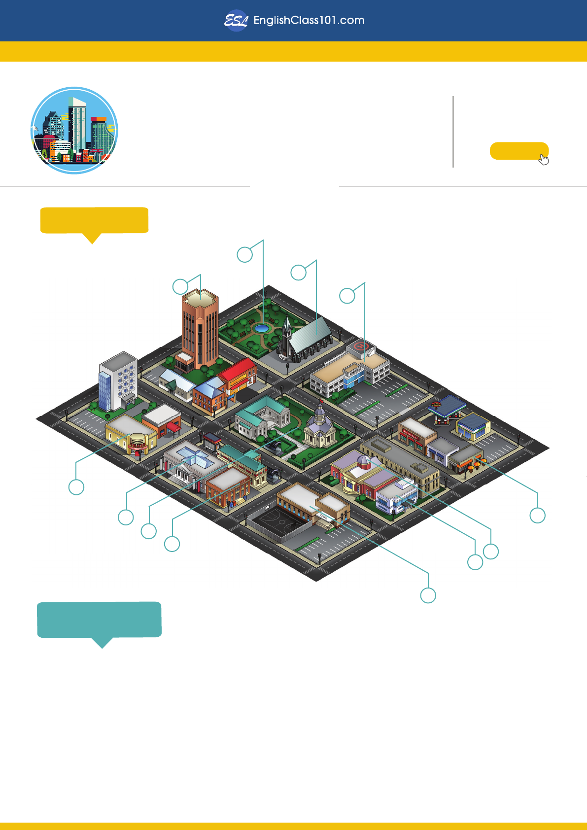 1 2 3 4 5 6 7 8 9 10 11 12 Want More? Getting Around Town in English › START HERE AROUND TOWN Conversation Cheat Sheet CLICK Create Your FREE Account DOWNTOWN 1. park 2. church 3. hospital 4. restaurant 5. city hall 6. police station 7. school 8. post office 9. museum 10. library 11. movie theater 12. hotel I want to go to the/a ~. Where's the ~? https://www.englishclass101.com?src=pdf_around_town_cheat_sheet_pdf_logo&utm_medium=pdf_logo&utm_content=pdf_logo&utm_campaign=around_town_cheat_sheet&utm_term=(not-set)&utm_source=pdf&utm_source=pdf https://www.englishclass101.com?src=pdf_around_town_cheat_sheet_pdf_logo&utm_medium=pdf_logo&utm_content=pdf_logo&utm_campaign=around_town_cheat_sheet&utm_term=(not-set)&utm_source=pdf&utm_source=pdf Sentence Patterns to Ask Directions Taking the Taxi How do I get to the ~? Excuse me, do you know where the ~ is? Is there a ~ near here? Is the ~ far from here? Directions turn left turn right go straight go past at the corner of next to opposite between Taking the Bus or Train バス basu bus バス停 basu tei bus stop 地下鉄 chikatetsu subway 駅 eki train station Does this bus go to ~? What’s the next stop? How much is the fare? bus bus stop subway train station How much is it to ~? Turn right here, please. Go straight, please. To this hotel, please.Here is fine.Can you take me to this place? https://www.englishclass101.com?src=pdf_around_town_cheat_sheet_pdf_logo&utm_medium=pdf_logo&utm_content=pdf_logo&utm_campaign=around_town_cheat_sheet&utm_term=(not-set)&utm_source=pdf&utm_source=pdf
