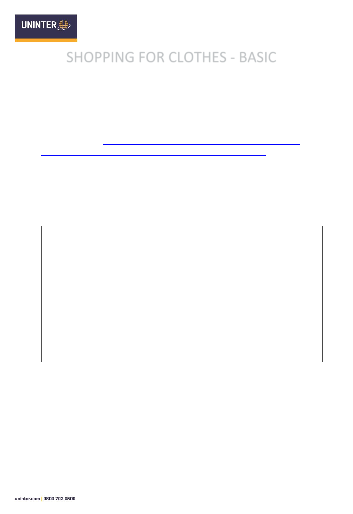 1. Match the pictures of clothes with the words. 1. coat 2. dress 3. jeans 4. Shirt 5. shoes 6. skirt 7. socks 8. sweater 2. Listening activity Claire is in a clothes shop. Listen to the dialogue and answer the questions. Watch the vídeo: https://www.linguahouse.com/esl-lesson-plans/general- english/shopping-for-clothes/videoplayer/clothes_video_bemp4 1. What does Claire want? Shirts 2. What size is she? Small 3. How much does it cost? 30 pounds 4. How does she pay? With a credit card Tapescript - Listening Shop assistant: Can I help you? Claire: Yes. Do you have any shirts? Shop assistant: Yes, we do. What size are you? Claire: A small. Shop assistant: Here you are. Claire: Thanks. Where can I try it on? Shop assistant: The changing rooms are over there. It looks really good on you. Claire: Hmm...How much is it? Shop assistant: It’s 30 pounds. Claire: Fine. Shop assistant: Are you paying in cash? Claire: No, by credit card. 3. Look at the useful language for shopping. Write S (sales assistant) or C (customer) in each box to showwho is talking. Who says it? 1. S 2. C 3. C 4. S 5. S 6. C 7. C 8. S 9. C 10. S 11. S 12. C SHOPPING FOR CLOTHES - BASIC https://www.linguahouse.com/esl-lesson-plans/general-english/shopping-for-clothes/videoplayer/clothes_video_bemp4 https://www.linguahouse.com/esl-lesson-plans/general-english/shopping-for-clothes/videoplayer/clothes_video_bemp4 4. Put the sentences in order to make a dialogue in a shop. 1. Do you have any jeans? 2. Yes, we do. What size are you? 3. I usually take a medium. 4. Here you are. 5. They’re over there. Those jeans really suit you. 6. Thanks! How much do they cost? 7. They’re on sale - only £60! 8. How would you like to pay? 9. In cash, please.