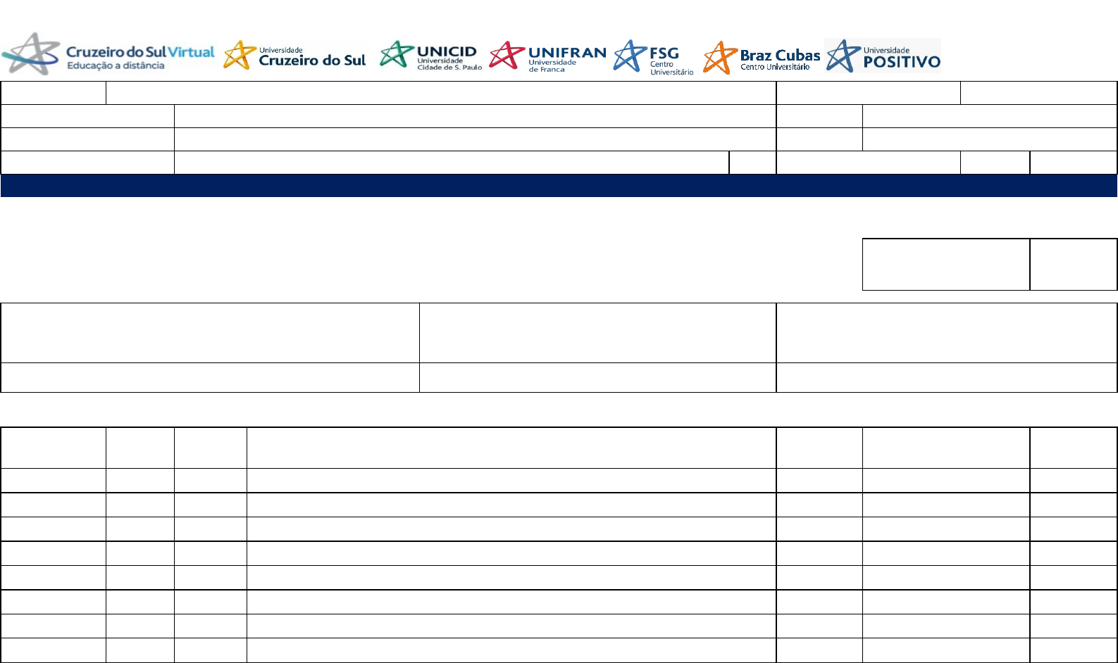 GESTAO Página 1 de 6 não remova essa página Curso: Semestre do Curso: Nome completo do(a) aluno(a) RGM Nome completo da escola: Telefone-Escola Endereço da escola Cidade UF Semestre Letivo: 2023/2 PLANILHA DE CONTROLE E REGISTRO DE HORAS DE ESTÁGIO - GESTÃO EDUCACIONAL TOTAL DE HORAS CUMPRIDAS 0:00:00 CARIMBO DA ESCOLA CARIMBO E ASSINATURA DO DIRETOR ASSINATURA DO PROFISSIONAL QUE ACOMPANHOU O ESTAGIÁRIO DETALHAMENTO DO REGISTRO DAS HORAS CUMPRIDAS DATA HORA DO INÍCIO HORA DO TÉRMINO DETALHAMENTO DAS ATIVIDADES SETOR NOME DO PROFISSIONAL QTDE DE HORAS 0:00 0:00 0:00 0:00 0:00 0:00 0:00 0:00 0:00 Página 2 de 6 não remova essa página DATA HORA DO INÍCIO HORA DO TÉRMINO DETALHAMENTO DAS ATIVIDADES SETOR NOME DO PROFISSIONAL QTDE DE HORAS 0:00 0:00 0:00 0:00 0:00 0:00 0:00 0:00 0:00 0:00 0:00 0:00 0:00 0:00 0:00 0:00 0:00 0:00 0:00 0:00 0:00 0:00 Identificação: 0 0 Página 3 de 6 não remova essa página DATA HORA DO INÍCIO HORA DO TÉRMINO DETALHAMENTO DAS ATIVIDADES SETOR NOME DO PROFISSIONAL QTDE DE HORAS 0:00 0:00 0:00 0:00 0:00 0:00 0:00 0:00 0:00 0:00 0:00 0:00 0:00 0:00 0:00 0:00 0:00 0:00 0:00 0:00 0:00 0:00 Identificação: 0 0 Página 4 de 6 não remova essa página DATA HORA DO INÍCIO HORA DO TÉRMINO DETALHAMENTO DAS ATIVIDADES SETOR NOME DO PROFISSIONAL QTDE DE HORAS 0:00 0:00 0:00 0:00 0:00 0:00 0:00 0:00 0:00 0:00 0:00 0:00 0:00 0:00 0:00 0:00 0:00 0:00 0:00 0:00 0:00 0:00 Identificação: 0 0 Página 5 de 6 não remova essa página DATA HORA DO INÍCIO HORA DO TÉRMINO DETALHAMENTO DAS ATIVIDADES SETOR NOME DO PROFISSIONAL QTDE DE HORAS 0:00 0:00 0:00 0:00 0:00 0:00 0:00 0:00 0:00 0:00 0:00 0:00 0:00 0:00 0:00 0:00 0:00 0:00 0:00 0:00 0:00 0:00 Identificação: 0 0 Página 6 de 6 não remova essa página DATA HORA DO INÍCIO HORA DO TÉRMINO DETALHAMENTO DAS ATIVIDADES SETOR NOME DO PROFISSIONAL QTDE DE HORAS 0:00 0:00 0:00 0:00 0:00 0:00 0:00 0:00 0:00 0:00 0:00 0:00 0:00 0:00 0:00 0:00 0:00 0:00 0:00 Identificação: 0 0 Declaro que as informações acima são de minha responsabilidade e condizem com as ações realizadas. ATENÇÃO: esse documento é composto por seis páginas. Caso não use todas, risque na diagonal a folha que não utilizar, mas não separe as páginas. ASSINATURA DO(A) ALUNO(A) CARIMBO DA ESCOLA Declaro para os devidos fins que o(a) estagiário(a) acima identificado(a), cumpriu o estágio nesta Unidade Escolar conforme horas descritas na planilha abaixo.