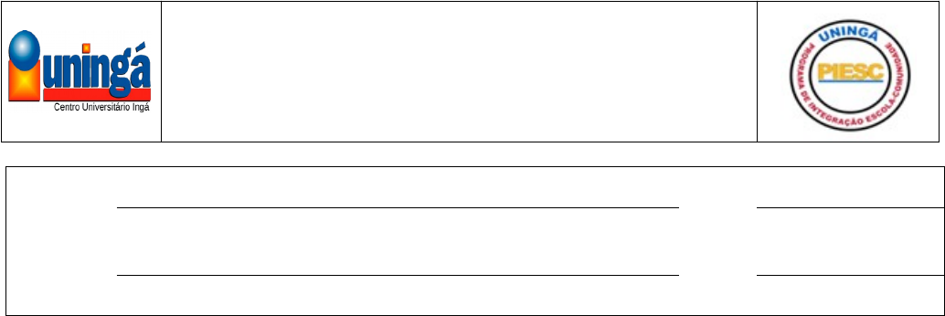 Centro Universitário Ingá Credenciada pela portaria N.º 776/16 MEC de 22 de julho de 2016. Curso: Série: Disciplina: PIESC I – Questões Ambientais e Resíduos Sólidos Data: Aluno: R.A.: RELATÓRIO DA PRÁTICA PIESC I 1 Pesquisa e diagnóstico sobre o tema: Pensar em questões ambientais e educação ambiental é uma necessidade na perspectiva de refletir sobre a responsabilidade social, visando gerar um elo entre meio ambiente, sustentabilidade e educação. Assim, faça uma pesquisa sobre o tema “Questões Ambientais e Resíduos sólidos”. Utilize de cinco a dez parágrafos para resumir sua pesquisa. Cite as referências utilizadas. 2 Ação educativa No PIESC I você teve que confeccionar um objeto a partir de material reciclável e estender essa ação educativa à comunidade. Assim, neste tópico, a proposta é de detalhamento de todos os passos do trabalho, desde sua elaboração até aplicação em determinado contexto. Deixamos a seu critério a subdivisão em outras partes, sendo necessário que apareçam documentadas as fases, por meio de imagens ou vídeos. 3 Referências Todas as referências citadas em seu relatório devem constar neste campo.