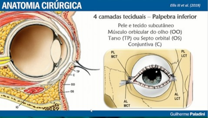 INCISÕES PERIORBITAIS INDICAÇÕES – UTILIZADA PARA ACESSO ÀS MARGENS E PAREDES DA ÓRBITA EX: FT ZIGOMATICO ORBITARIAS; FT DE PAREDES ORBITARIAS; OSTEOTIMAS LE FORT II E III COMPLICAÇÃO = ECTRÓPIO EVERSÃO DA PÁLPEBRA INFERIOR – DEVIDO A CONTRAÇÃO E FORMAÇÃO DE TECIDOS FIBRÓTICOS NA REGIÃO (QUESTÃO DE PROVA) RESULTADO ESTÉTICO RUIM – CRUZAMENTODE LINHAS DE TENSÃO, POSICIONAMENTO MUITO INFERIOR. ANATOMIA CIRÚRGICA 4 CAMADAS TECIDUAIS NA PALPEBRA INFERIOR PELE E TECIDO SUBCUTÂNEO MÚSCULO ORBICULAR DO OLHO TARSO OU SEPTO ORBITAL CONJUNTIVA = NÃO É ABORDADA ALÉM DISSO CUIDADO COM OS LIGAMENTOS CANTAIS. SEQUÊNCIA CIRÚRGICA Passo 1: tarsorrafia – sutura realizada (colchoeiro em U) nas placas tarsais para manter as pálpebras ocluídas – proteção do globo ocular; Passo 2 : demcarcação da pele e vasoconstrição da região a ser incisada (diminuir sangramento) Passo 3: incisão 2 mm abaixo dos cílios, e no max 2cm além do ligamento cantal lateral. Passo 4: dissecação subcutânea Passo 5: -- suborbicular Passo 6 : Incisão entre as partes pré tarsal e pré septal – cuidado com a gordura orbitária – Passo 7: incisão e deslocamento periosteal Passo 8: sutura planos (periósteo e pele) + sutura de frost (suspensória – evitar ectrópio ) Fio na placa tarsal, suspensa na região da testa (48 h) Sutura de frost Envolve só a pálpebra inferior TÉCNICA ALT – ACESSO ESTENDIDO