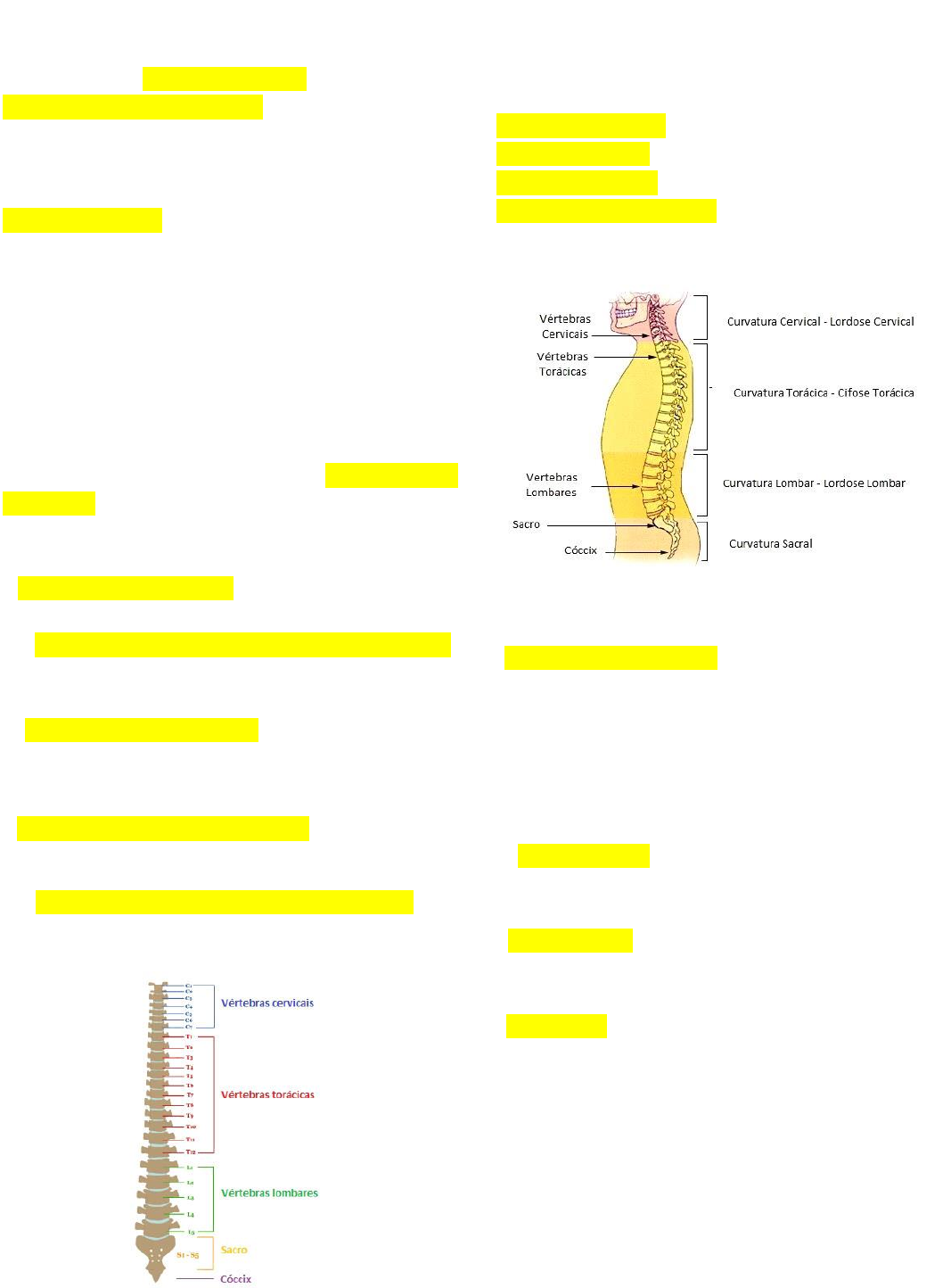 ROTEIRO DE ESTUDO – ANATOMIA CASO CLÍNICO 1 – COLUNA VERTEBRAL Homem, 13 anos, buscou assistência médica acompanhado dos pais com queixa de dor na coluna com piora noturna e cansaço muscular na região aos médios esforços. A inspeção, observou-se cifose torácica associada a lordose cervical e lombar. Ao exame físico foi constatado que a cifose se acentuava com flexão do tronco. Foram solicitados exames de imagem, que confirmaram o diagnóstico de cifose postural. O paciente foi medicado e encaminhado para a fisioterapia. 1-Qual o plano anatômico que se encontra a coluna vertebral? Ela é segmentada em quantas regiões? Especifique quantas vértebras compõem cada uma. Sobre a osteologia, como as vértebras são classificadas? A coluna vertebral se localiza no plano sagital posterior do corpo. É constituída por 33 vértebras intercaladas por discos intervertebrais, se divide em: - 7 vértebras cervicais: proporcionam suporte à cabeça; - 12 vértebras dorsais ou torácicas: garantem suporte para a cavidade torácica e estão conectadas às costelas; - 5 vértebras lombares: garantem suporte para a cavidade abdominal e também proporcionam movimento entre a parte torácica e a pelve; - 5 vértebras fundidas sacrais: é formado por cinco vértebras fundidas e une a coluna à cintura pélvica; - 4 vértebras fundidas coccígeas: é constituído por quatro vértebras e garante o suporte do assoalho pélvico. 2- Curvaturas na coluna são apenas fisiológicas ou apenas patológicas? Justifique e traga um exemplo de anormalidade relacionado a curvatura. As curvaturas na coluna podem ser tanto fisiológicas quanto patológica. Vista lateralmente, a coluna vertebral apresenta 4 curvaturas consideradas fisiológicas, ou seja, naturais: - Lordose cervical (concavidade posterior); - Cifose torácica (concavidade anterior); - Lordose lombar (concavidade posterior); - Cifose sacrococcígea(concavidade anterior). Cifoses são curvaturas primárias, enquanto lordoses são curvaturas secundárias. Algumas patologias estão associadas a coluna vertebral. São elas: - Hipercifose torácica: abaulamento (forma curva, arqueada) das costas provocado pelo aumento exagerado da curvatura posterior dessa parte da coluna. Para compensá-la, ombros, pescoço e cabeça são projetados para frente, o que favorece o aparecimento da lordose cervical. - Hiperlordose: aumento excessivo da curvatura da coluna para dentro do corpo, na direção da frente do abdômen - Hipolordose: quando existe redução da curvatura da coluna a ponto de provocar retificação nas regiões cervical e lombar - Escoliose: é uma curvatura anormal da coluna para um dos lados do tronco, determinada pela rotação das vértebras, que adquire um formato de "s" ou "c". 3- Quais as funções destas curvaturas e os movimentos relacionados realizados por cada um dos segmentos da coluna (cervical, torácica e lombar)? As curvaturas da coluna vertebral desempenham um papel crucial na absorção de impactos e distribuição de cargas durante atividades diárias e movimentos específicos. A lordose cervical e lombar, bem como a cifose torácica, apresentam uma orientação côncava e convexa, respectivamente, que auxilia na dissipação das forças geradas pelo peso do corpo, movimentos e posturas. A interação entre as curvaturas também é fundamental para a estabilidade do tronco, proporcionando uma base sólida para a movimentação de membros superiores e inferiores. Além disso, essas curvaturas contribuem para a manutenção do equilíbrio e a prevenção de desalinhamentos posturais, os quais podem levar a condições patológicas e disfunções musculoesqueléticas. A coluna é capaz de realizar seis movimentos: - Flexão (inclinação para frente) - Extensão (inclinação para trás) - Flexão lateral (direita / esquerda) - Extensão lateral (retorno ao normal a partir da flexão lateral) - Rotação (torção). Todos estes movimentos são influenciados pelas articulações, ligamentos e pelos músculos torácicos e do dorso. Os movimentos nas regiões da coluna cervical e da coluna lombar são mais livres do que os torácicos e os sacrais. 4- Descreva o nome da articulação relacionada a cabeça e o pescoço e quem está intimamente relacionada a estas estruturas anatômicas. Existem dois grupos de articulações craniovertebrais, as articulações atlantoccipitais, formadas entre o atlas (vértebra C I) e o occipital no crânio, e as articulações atlantoaxiais, entre o atlas e o áxis (vértebra C II). A palavra grega atlanto refere-se ao atlas (vértebra C I). As articulações craniovertebrais são articulações sinoviais que não têm discos intervertebrais. Sua arquitetura permite uma amplitude de movimento maior do que a do restante da coluna vertebral. A articulações incluem os côndilos occipitais, o atlas e o áxis. 5- Como as vértebras podem ser definidas? Pontue quem são? Descreve os acidentes anatômicos identificados. A coluna vertebral é uma haste óssea, firme e flexível formada por várias estruturas sobrepostas denominadas de vértebras. Cada vértebra une-se por meio de discos intervertebrais, uma estrutura fibrocartilaginosa. Além disso, a coluna vertebral é sustentada pela presença de ligamentos e músculos resistentes. Não há duas vértebras idênticas. Eles variam em tamanho e características, especialmente de uma região para outra. No entanto, todas elas têm a seguinte estrutura básica: Corpo vertebral - a grande parte cilíndrica localizada anteriormente que dá força à coluna. Estão envolvidos na sustentação de peso. Seu tamanho aumenta à medida que se desce na coluna vertebral. Os corpos vertebrais adjacentes são separados por discos intervertebrais. Arco vertebral - a estrutura localizada posteriormente ao corpo. Consiste em dois pedículos e duas lâminas. Os pedículos contêm incisuras vertebrais (superiores, inferiores) que formam o forame intervertebral. Este permit