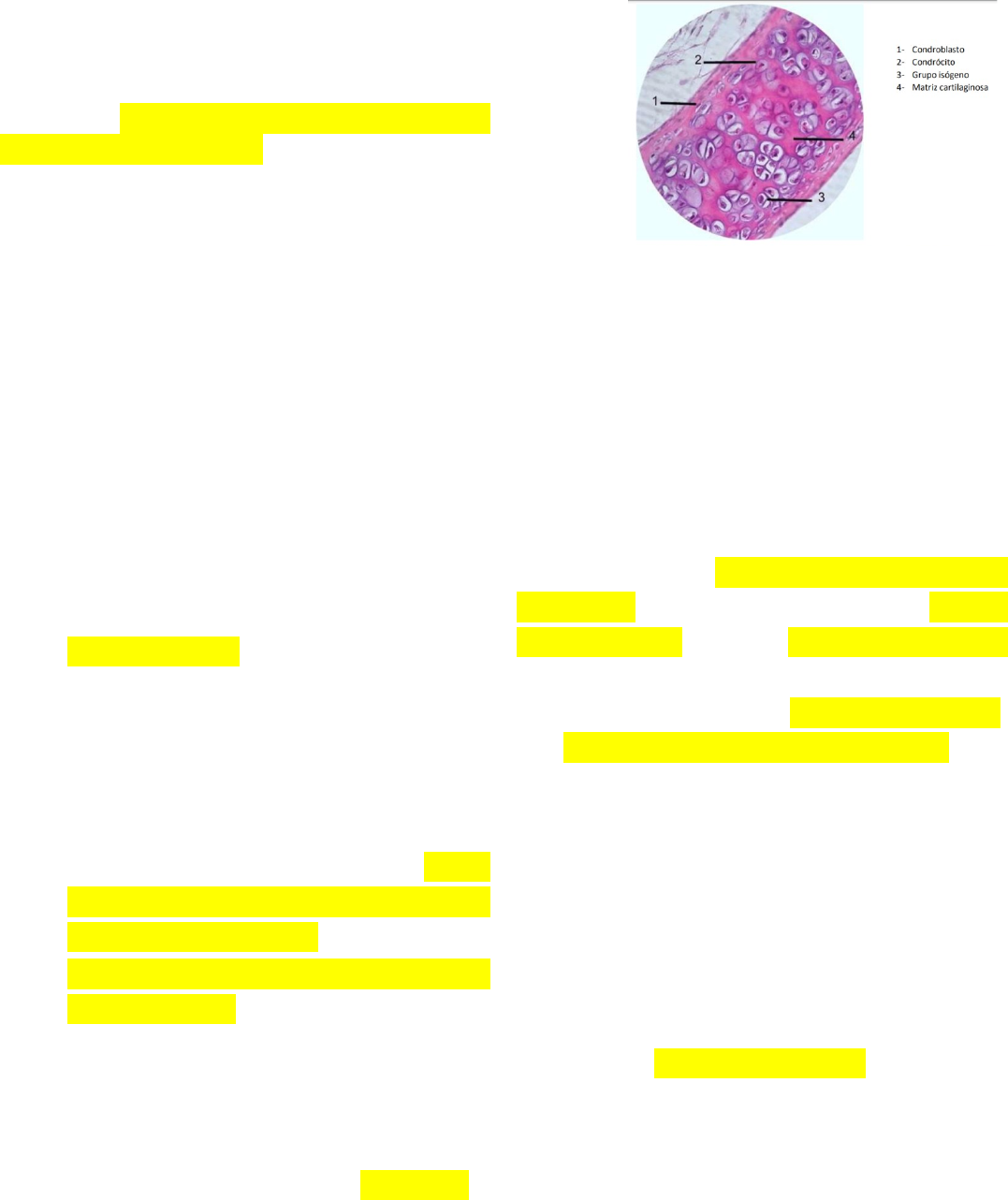 Tecido Cartilaginoso É uma forma especializada de tecido conjuntivo de consistência rígida. A cartilagem é essencial para a formação e o crescimento dos ossos longos, na vida intrauterina e depois do nascimento. · Funções · Suporte de tecidos moles · Reveste superfícies articulares, em que absorve choques · Facilita o deslizamento dos ossos nas articulações · Características · Contém células, os condrócitos · Abundante material extracelular, que constitui a matriz. · As cavidades da matriz, ocupadas pelos condrócitos, são chamadas lacunas. Uma lacuna pode conter um ou mais condrócitos. · Não contém vasos sanguíneos, sendo nutrido pelos capilares do conjuntivo envolvente (pericôndrio). Em alguns casos, vasos sanguíneos atravessam as cartilagens, indo nutrir outros tecidos - difusão. · As cartilagens que revestem a superfície dos ossos nas articulações móveis não têm pericôndrio e recebem nutrientes do líquido sinovial das cavidades articulares. · É desprovido de vasos linfáticos e de nervos. Conforme as diversas necessidades funcionais do organismo, as cartilagens se diferenciam em três tipos: cartilagem hialina, cartilagem elástica e cartilagem fibrosa. O que as diferencia é o tipo de fibra presente em maior quantidade na matriz extracelular. · Matriz É formada por fibrilas de colágeno tipo II associadas ao ácido hialurônico, proteoglicanas (glicosaminoglicanas associada à um bastão proteico) e glicoproteinas. O alto conteúdo de água de solvatação das moléculas de glicosaminoglicanas atua como um sistema de absorção de choques mecânicos, de grande significado funcional, principalmente nas cartilagens articulares. Outra componente importante é a glicoproteina estrutural condronectina uma macromolécula com sitio de ligação para condrócitos e fibrilas de colágeno tipo II e glicosaminoglicanas. Assim a condronectina, participa da associação do arcabouço macromolecular da matriz com os condrócitos. · Pericôndrio Todas as cartilagens hialinas, exceto as cartilagens articulares, são envolvidas por uma camada de tecido conjuntivo, denso na sua maior parte, denominado pericôndrio. Além de ser uma fonte de novos condrócitos para o crescimento, o pericôndrio é responsável pela nutrição, oxigenação e eliminação dos refugos metabólicos da cartilagem, porque nele está localizado vasos sangüineos e linfáticos, inexistentes no tecido cartilaginoso. O pericôndrio é formado por tecido conjuntivo muito rico em fibras colágeno tipo I na parte mais superficial - pericôndrio fibroso, porém gradativamente mais rico em células à medida que se aproxima da cartilagem - pericôndrio celular. As células do pericôndrio são semelhantes aos fibroblastos, porém às situadas mais próximas a cartilagem, podem se multiplicar por mitose caracterizando-se assim, como condroblasto. · Condroblastos e condrócitos Na periferia da cartilagem hialina observamos os condroblastos, são células jovens com alto poder de síntese, apresentam forma alongada e sintetizam os elementos da cartilagem. Mais profundamente, encontramos os condrócitos, são arredondados e aparecem em grupos de até oito células, chamados grupos isógenos, porque suas células são originadas de um único condrócito. Os condroblastos são células secretoras de colágeno, principalmente do tipo II, e da substância fundamental (proteoglicanas, glicosaminoglicanas e as glicoproteinas de adesão, como a condronectina. Os nutrientes trazidos pelo sangue atravessam o pericôndrio, penetram na matriz da cartilagem e vão ate os condrócitos mais profundos. Isto ocorre por difusão através da água de solvatação e o bombeamento promovido pelas forças de compressão e descompressão exercidas sobre a cartilagem. A falta de capilares sangüineos limita a espessura máxima das cartilagens. O funcionamento dos condrócitos depende de um balanço hormonal adequado. · Histogênese No embrião, os esboços das cartilagens surgem no mesênquima. A primeira modificação observada é o arredondamento das células mesenquimatosas. As células que se formam são o condroblasto em seguida começa a síntese da matriz pelos condroblastos, o que afasta essas células uma das outras. A diferenciação das cartilagens dá-se do centro para a periferia, de modo que as células mais centrais já apresentam as características de condrócitos, enquanto as mais periféricas são condroblastos típicos. O mesênquima superficial vai formar o pericôndrio. ] · Crescimento O crescimento da cartilagem deve-se a dois processos: - O crescimento intersticial, por divisão mitótica dos condrócitos preexistentes; - O crescimento aposicional, que se faz a partir das células do pericôndrio. Nos dois casos, os novos condrócitos formados logo produzem fibrilas colágenas e a substância fundamental, de modo que o crescimento real é muito maior do que o produzido pelo aumento do número de células. O crescimento intersticial é menos importante e quase só ocorre nas primeiras fases da vida da cartilagem. À medida que a matriz se torna cada vez mais rígida, o crescimento intersticial deixa de ser viável e a cartilagem passa a crescer somente por aposição. Células da parte mais profunda do pericôndrio multiplicam-se e diferenciam-se em condroblastos, que são adicionados à cartilagem. A parte superficial das cartilagens em crescimento mostra transições entre as células do pericôndrio e os condroblastos. · Tipos de cartilagem · Cartilagem hialina É o tipo mais frequente encontrado no corpo humano. Apresenta pericôndrio. Forma o primeiro esqueleto do embrião, que posteriormente é substituído por um esqueleto ósseo. Entre a diáfise e a epífise dos ossos longos em crescimento observa-se o disco epifisário, de cartilagem hialina, que é responsável pelo crescimento do osso em extensão. No adulto, a cartilagem hialina é encontrada na parede das fossas nasais, t
