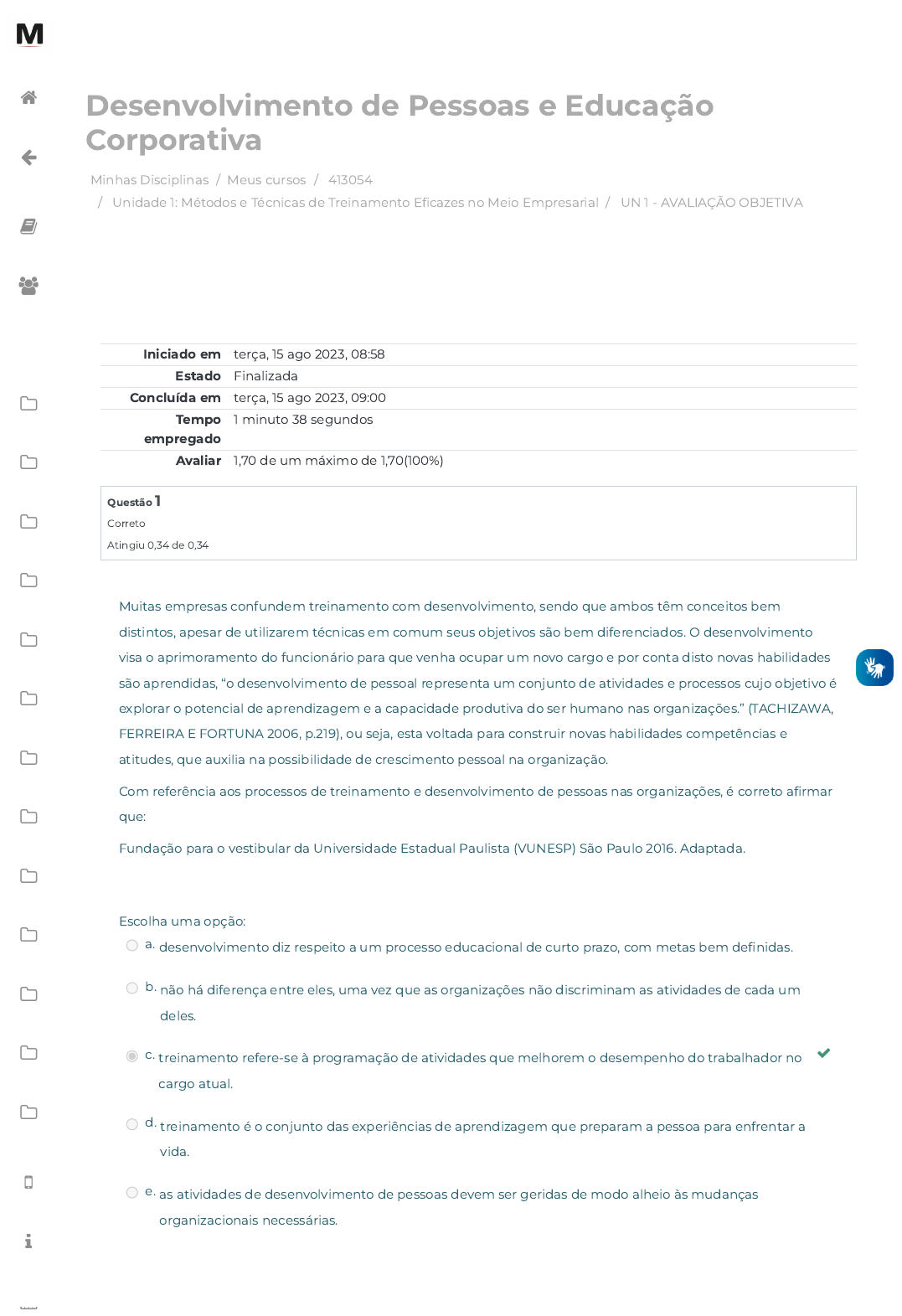 15/08/2023, 09:21 UN 1 - AVALIAÇÃO OBJETIVA: Revisão da tentativa https://avap.multivix.edu.br/mod/quiz/review.php?attempt=3615245&cmid=1523961 1/5 Minhas Disciplinas / Meus cursos / 413054 / Unidade 1: Métodos e Técnicas de Treinamento E�cazes no Meio Empresarial / UN 1 - AVALIAÇÃO OBJETIVA Desenvolvimento de Pessoas e Educação Corporativa Iniciado em terça, 15 ago 2023, 08:58 Estado Finalizada Concluída em terça, 15 ago 2023, 09:00 Tempo empregado 1 minuto 38 segundos Avaliar 1,70 de um máximo de 1,70(100%) Questão 1 Correto Atingiu 0,34 de 0,34 Muitas empresas confundem treinamento com desenvolvimento, sendo que ambos têm conceitos bem distintos, apesar de utilizarem técnicas em comum seus objetivos são bem diferenciados. O desenvolvimento visa o aprimoramento do funcionário para que venha ocupar um novo cargo e por conta disto novas habilidades são aprendidas, “o desenvolvimento de pessoal representa um conjunto de atividades e processos cujo objetivo é explorar o potencial de aprendizagem e a capacidade produtiva do ser humano nas organizações.” (TACHIZAWA, FERREIRA E FORTUNA 2006, p.219), ou seja, esta voltada para construir novas habilidades competências e atitudes, que auxilia na possibilidade de crescimento pessoal na organização. Com referência aos processos de treinamento e desenvolvimento de pessoas nas organizações, é correto a�rmar que: Fundação para o vestibular da Universidade Estadual Paulista (VUNESP) São Paulo 2016. Adaptada. Escolha uma opção: a. desenvolvimento diz respeito a um processo educacional de curto prazo, com metas bem de�nidas. b. não há diferença entre eles, uma vez que as organizações não discriminam as atividades de cada um deles. c. treinamento refere-se à programação de atividades que melhorem o desempenho do trabalhador no cargo atual. d. treinamento é o conjunto das experiências de aprendizagem que preparam a pessoa para enfrentar a vida. e. as atividades de desenvolvimento de pessoas devem ser geridas de modo alheio às mudanças organizacionais necessárias. https://avap.multivix.edu.br/my/ https://avap.multivix.edu.br/course/view.php?id=23617 https://avap.multivix.edu.br/course/view.php?id=23617§ion=2 https://avap.multivix.edu.br/mod/quiz/view.php?id=1523961 https://avap.multivix.edu.br/my/ https://avap.multivix.edu.br/course/view.php?id=23617 https://avap.multivix.edu.br/user/index.php?id=23617 https://avap.multivix.edu.br/course/view.php?id=23617§ion=1 https://avap.multivix.edu.br/course/view.php?id=23617§ion=2 https://avap.multivix.edu.br/course/view.php?id=23617§ion=3 https://avap.multivix.edu.br/course/view.php?id=23617§ion=4 https://avap.multivix.edu.br/course/view.php?id=23617§ion=5 https://avap.multivix.edu.br/course/view.php?id=23617§ion=6 https://avap.multivix.edu.br/course/view.php?id=23617§ion=7 https://avap.multivix.edu.br/course/view.php?id=23617§ion=8 https://avap.multivix.edu.br/course/view.php?id=23617§ion=9 https://avap.multivix.edu.br/course/view.php?id=23617§ion=10 https://avap.multivix.edu.br/course/view.php?id=23617§ion=11 https://avap.multivix.edu.br/course/view.php?id=23617§ion=12 https://avap.multivix.edu.br/course/view.php?id=23617§ion=13 https://avap.multivix.edu.br/hooks/portal/ https://avap.multivix.edu.br/mod/page/view.php?id=1252%2F%22%20target%3D%22_blank https://avap.multivix.edu.br/calendar/view.php/ https://avap.multivix.edu.br/ 15/08/2023, 09:21 UN 1 - AVALIAÇÃO OBJETIVA: Revisão da tentativa https://avap.multivix.edu.br/mod/quiz/review.php?attempt=3615245&cmid=1523961 2/5 Questão 2 Correto Atingiu 0,34 de 0,34 Com relação aos conceitos de treinamento, desenvolvimento e educação, considere as a�rmativas abaixo. I A avaliação da aprendizagem diz respeito à avaliação das diferenças de desempenho dos treinandos antes e depois do treinamento, em termos de objetivos instrucionais. II No processo de transferência de aprendizagem, a retenção e a generalização são mensuradas nas avaliações de reação. III Desenvolvimento organizacional é um programa educacional de curto prazo orientado no sentido de melhorar os processos de resolução de problemas e de renovação de uma organização. IV As avaliações sistemáticas de necessidades de treinamento, quando implementadas, devem estar relacionadas às competências organizacionais e ao alinhamento às estratégias organizacionais. Estão CORRETAS as a�rmativas: Escolha uma opção: I, II, III e IV I, II e IV, somente. I e IV, somente. I e III, somente. II, III e IV, somente. https://avap.multivix.edu.br/my/ https://avap.multivix.edu.br/course/view.php?id=23617 https://avap.multivix.edu.br/user/index.php?id=23617 https://avap.multivix.edu.br/course/view.php?id=23617§ion=1 https://avap.multivix.edu.br/course/view.php?id=23617§ion=2 https://avap.multivix.edu.br/course/view.php?id=23617§ion=3 https://avap.multivix.edu.br/course/view.php?id=23617§ion=4 https://avap.multivix.edu.br/course/view.php?id=23617§ion=5 https://avap.multivix.edu.br/course/view.php?id=23617§ion=6 https://avap.multivix.edu.br/course/view.php?id=23617§ion=7 https://avap.multivix.edu.br/course/view.php?id=23617§ion=8 https://avap.multivix.edu.br/course/view.php?id=23617§ion=9 https://avap.multivix.edu.br/course/view.php?id=23617§ion=10 https://avap.multivix.edu.br/course/view.php?id=23617§ion=11 https://avap.multivix.edu.br/course/view.php?id=23617§ion=12 https://avap.multivix.edu.br/course/view.php?id=23617§ion=13 https://avap.multivix.edu.br/hooks/portal/ https://avap.multivix.edu.br/mod/page/view.php?id=1252%2F%22%20target%3D%22_blank https://avap.multivix.edu.br/calendar/view.php/ https://avap.multivix.edu.br/ 15/08/2023, 09:21 UN 1 - AVALIAÇÃO OBJETIVA: Revisão da tentativa https://avap.multivix.edu.br/mod/quiz/review.php?attempt=3615245&cmid=1523961 3/5 Questão 3 Correto Atingiu 0,34 de 0,34 Com relação a treinamento e desenvolvimento de pessoas, relacione as numerações 1 e 2 para a