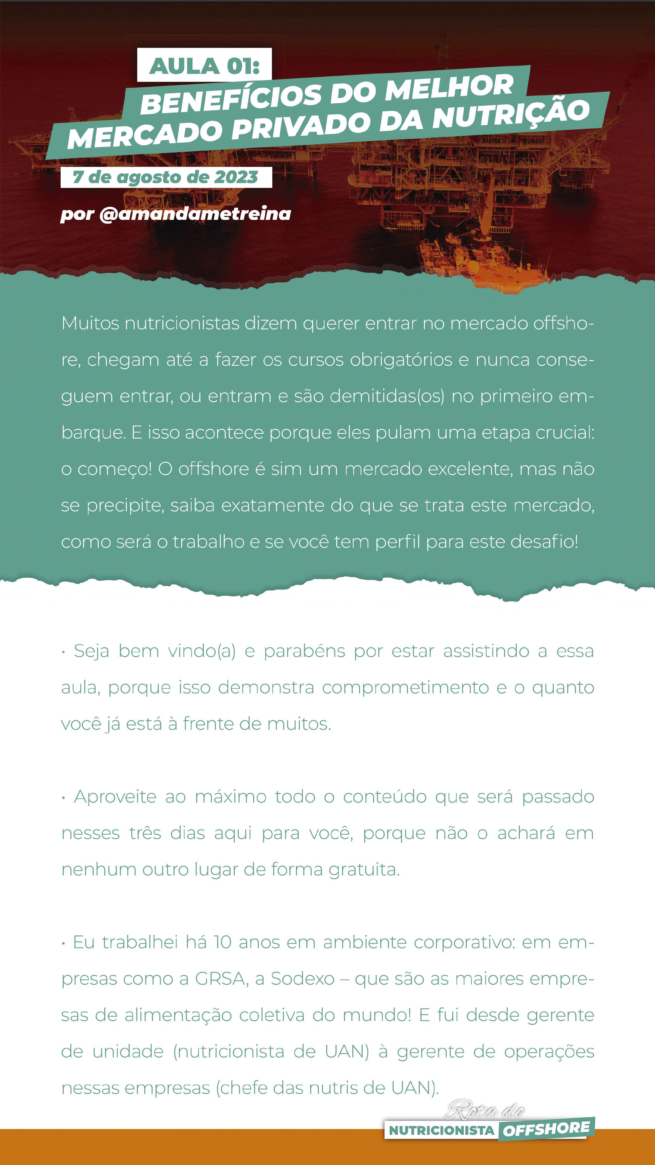 • Gostaria de deixar claro que não existe conflito de interesses nas aulas, isso quer dizer, que atualmente não trabalho para nenhuma empresa... Eu saí do offshore em 2018 e abri minha própria empresa, sendo mentora de nutricionistas e atenden- do em clínica como nutricionista. • Eu optei por sair do offshore, por motivos pessoais, mas eu não queria engavetar todo o meu conhecimento de anos neste segmento, foi daí que surgiu o @amandametreina, as minhas capacitações e todos os meus cursos. O OFFSHORE, É SEM DÚVIDAS, O MELHOR MERCADO PRIVA- DO (CLT) DA NUTRIÇÃO – NÃO EXISTE NENHUM OUTRO EM- PREGO DE CARTEIRA ASSINADA QUE TE PAGARÁ DE 5-6 MIL REAIS POR MÊS PARA VOCÊ TRABALHAR 14 DIAS NO MÊS E TER 42 DIAS DE FÉRIAS. A MAIORIA DOS EMPREGOS CLT PARA NUTRICIONISTAS ESTÁ PAGANDO O PISO SALARIAL, QUE A DEPENDER DO ESTADO É DOIS MIL E POUCO REAIS. • Quanto melhores os seus ganhos, mais qualidade de vida você vai ter! • Você é privilegiado por estar assistindo à essas aulas porque poderá se organizar da maneira correta para entrar no merca- do de trabalho offshore sem gastar tempo, energia e dinheiro de forma desnecessária. NUTRICIONISTA OFFSHORENUTRICIONISTA OFFSHORE Rota do • A única parte da história que você acha por aí é que tem que fazer os cursos de CBSP e HUET. Só que esses cursos têm vali- dade de 5 anos. Muita gente faz achando que este é o primei- ro passo a ser tomado, mas não é! Não basta fazer CBSP e HUET para entrar no mercado. Mas esse é um erro muito comum na classe: 99,9% dos nutricionistas que desejam entrar no offshore o cometem. • Com as informações corretas que eu vou passar aqui para você não haverá perda de tempo nem de dinheiro, porque você vai saber a coisa certa a se fazer a partir de agora. Primei- ro você vai se preparar, para depois investir nos cursos e aí sim aplicar para a candidatura das vagas. ME APRESENTANDO... • Meu nome é Amanda Chagas, sou nutricionista formada há 11 anos pela UFF, tenho pós-graduação em Gestão Integrada de QSMS e pósgraduação em Nutrição Clínica; falo inglês fluente, tenho certificação TOEFL (certificação internacional), cheguei a cursar alguns períodos de Engenharia de Produ- ção, mas larguei a partir do momento em que decidi sair do mundo corporativo, passei a ver que a engenharia não faria mais sentido para mim, nesse caso. • Trabalhei 8 anos dentro do segmento offshore, iniciando em 2010 e saindo em 2018. Na GRSA ganhei um prêmio chamado “Estrelas” – prêmio de melhor gestão à nível Brasil com apenas 8 meses de empresa. O offshore da GRSA nunca NUTRICIONISTA OFFSHORE apenas 8 meses de empresa. O offshore da GRSA nunca NUTRICIONISTA OFFSHORE Rota do tinha ganhado esse prêmio na história da empresa. • Sai do offshore em 2018 como gerente de operações e por questões pessoais: eu tenho o valor do crescimento e eu não me enxergava mais crescendo dentro do ambiente corporati- vo, era como se eu já tivesse atingido um teto. Reavaliei algu- mas coisas na minha vida e optei por sair do offshore e abrir a minha própria empresa. • No meu perfil do Instagram – o @amandametreina eu falo sobre assuntos que ninguém fala na Nutrição, assuntos estes que te levarão ao sucesso profissional! Confere lá • Nutri de UAN não é somente nutri de cozinha, existe um im- pério por trás das grandes empresas de alimentação coletiva que fatura bilhões! E é exatamente isso que eu quero mostrar a vocês! • Qual o impacto que eu quero causar em vocês ao final destas 3 aulas? Que vocês estarão a frente de 99% dos nutri- cionistas! • Vocês terão a informação que “Google” nenhum dá de como entrar neste mercado! • Quero que vocês conheçam um mercado que paga bem e que possibilita ter qualidade de vida! • Antes dos meus 30 anos de idade eu já tinha a minha casa NUTRICIONISTA OFFSHORE • Antes dos meus 30 anos de idade eu já tinha a minha casa NUTRICIONISTA OFFSHORE Rota do própria quitada, o meu carro, já havia realizado várias viagens in- ternacionais e nunca precisei passar sufoco no final do mês... Além do mais é um mercado que possibilita que você cresça dentro da empresa! • O nutricionista de alimentação coletiva é um gestor, sua função não se resume à cozinha! EU SAÍ DO OFFSHORE GANHANDO 12 MIL REAIS POR MÊS! • Quero que vocês evitem a frustração ao longo dos anos. O mer- cado da Nutrição está inchando e saturando cada vez mais e de pessoas despreparadas! Quando você cai no mercado sem orientação acaba se submetendo a condições que nenhum pro- fissional deveria se sujeitar. Eu quero evitar que vocês sofram de frustrações e desemprego daqui há 10 anos. SOBRE O OFFSHORE... • “Offshore” é o termo que se refere as plataformas e navios de petróleo e traduzindo esse termo de forma literal quer dizer “fora da costa”. • Nutricionista não passa dieta e nem trata doentes na plataforma, ele é como se fosse um gerente de hotel. Lá existe a estrutura de NUTRICIONISTA OFFSHORENUTRICIONISTA OFFSHORE Rota do um hotel onde os trabalhadores ficam confinados por 14 dias e outros até mais... Existem vestuários, quartos, lavanderia, acade- mia, cozinha e por isso precisa haver um serviço que vá dar conta de atender a todas essas demandas. Quem gerencia todo esse serviço hoteleiro é o nutricionista e existe uma equipe abaixo dele que cumpre com várias funções, como cozinheiro, taifeiros, estoquista... O tamanho da equipe vai variar de acordo com o tamanho da plataforma ou navio, quanto maior mais fun- cionários têm. Como você só passa 14 dias lá tem uma outra nutri que divide a escala com você, a qual chamamos de back. Quando eu falo gerenciar é fazer pedido, preencher docu- mentação, fazer faturamento, participar de auditorias, relacio- namento com cliente, treinamento de equipe... É uma gestão de um negócio inteiro! • A empresa não vai te treinar, você tem que chegar
