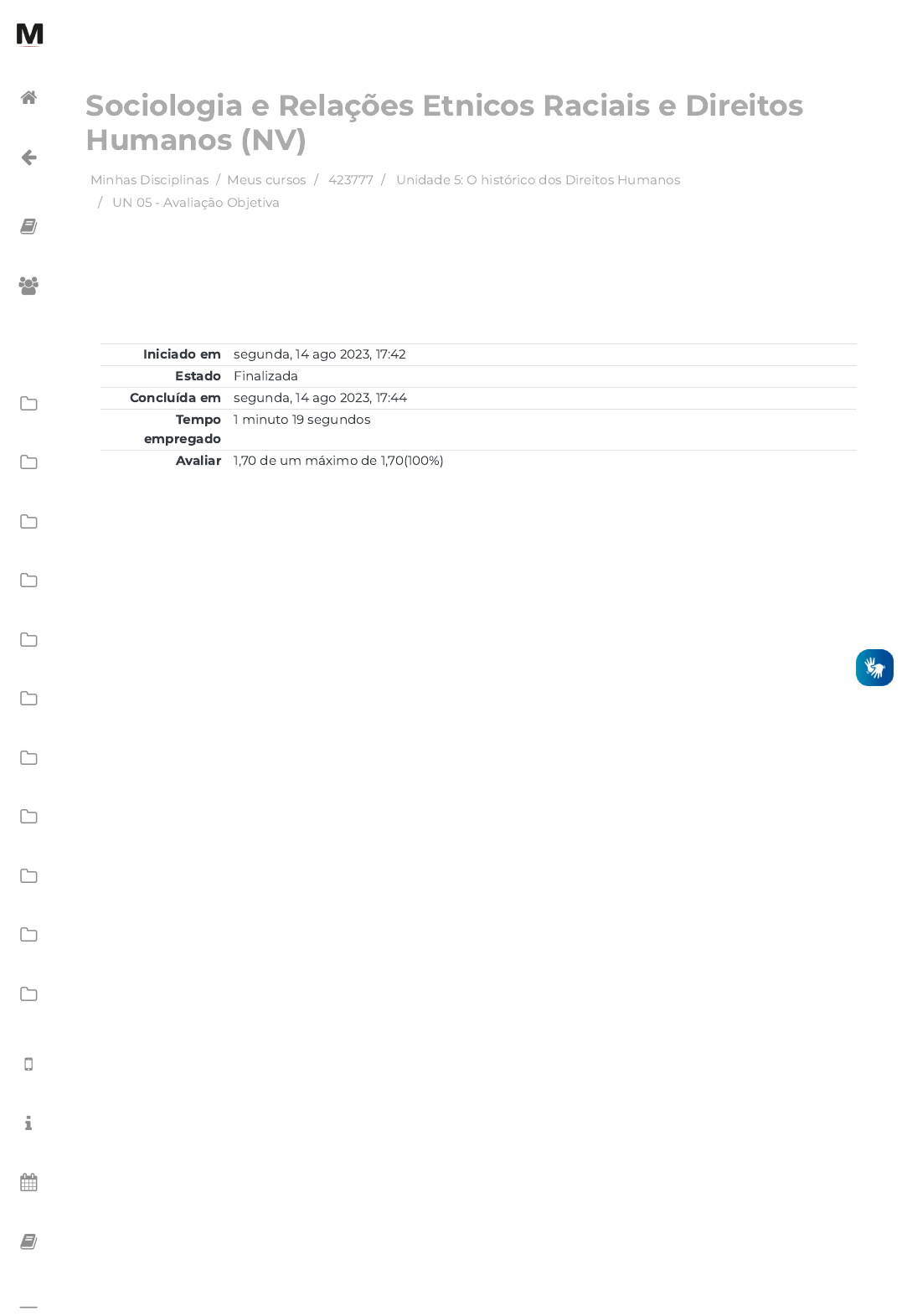 14/08/23, 17:44 UN 05 - Avaliação Objetiva: Revisão da tentativa https://avap.multivix.edu.br/mod/quiz/review.php?attempt=3611788&cmid=1540477 1/5 Minhas Disciplinas / Meus cursos / 423777 / Unidade 5: O histórico dos Direitos Humanos / UN 05 - Avaliação Objetiva Sociologia e Relações Etnicos Raciais e Direitos Humanos (NV) Iniciado em segunda, 14 ago 2023, 17:42 Estado Finalizada Concluída em segunda, 14 ago 2023, 17:44 Tempo empregado 1 minuto 19 segundos Avaliar 1,70 de um máximo de 1,70(100%) https://avap.multivix.edu.br/my/ https://avap.multivix.edu.br/course/view.php?id=24133 https://avap.multivix.edu.br/course/view.php?id=24133§ion=6 https://avap.multivix.edu.br/mod/quiz/view.php?id=1540477 https://avap.multivix.edu.br/my/ https://avap.multivix.edu.br/course/view.php?id=24133 https://avap.multivix.edu.br/user/index.php?id=24133 https://avap.multivix.edu.br/course/view.php?id=24133§ion=1 https://avap.multivix.edu.br/course/view.php?id=24133§ion=2 https://avap.multivix.edu.br/course/view.php?id=24133§ion=3 https://avap.multivix.edu.br/course/view.php?id=24133§ion=4 https://avap.multivix.edu.br/course/view.php?id=24133§ion=5 https://avap.multivix.edu.br/course/view.php?id=24133§ion=6 https://avap.multivix.edu.br/course/view.php?id=24133§ion=7 https://avap.multivix.edu.br/course/view.php?id=24133§ion=8 https://avap.multivix.edu.br/course/view.php?id=24133§ion=9 https://avap.multivix.edu.br/course/view.php?id=24133§ion=10 https://avap.multivix.edu.br/course/view.php?id=24133§ion=11 https://avap.multivix.edu.br/hooks/portal/ https://avap.multivix.edu.br/mod/page/view.php?id=1252%2F%22%20target%3D%22_blank https://avap.multivix.edu.br/calendar/view.php/ https://avap.multivix.edu.br/local/staticpage/view.php?page=biblioteca https://multivix.edu.br/office-365/ https://avap.multivix.edu.br/ 14/08/23, 17:44 UN 05 - Avaliação Objetiva: Revisão da tentativa https://avap.multivix.edu.br/mod/quiz/review.php?attempt=3611788&cmid=1540477 2/5 Questão 1 Correto Atingiu 0,34 de 0,34 O Plano Nacional de Educação em Direitos Humanos (PNEDH) é fruto do compromisso do Estado com a concretização dos direitos humanos e de uma construção histórica da sociedade civil organizada. Fonte: http://portal.mec.gov.br/index.php?option=com_docman&view=download&alias=2191-plano-nacional- pdf&Itemid=30192 Considerando o PNDE, avalie as a�rmações a seguir. Busca o desenvolvimento dos direitos humanos. Tem o intuito de promover um processo educativo baseado nos direitos humanos. Não trata sobre a questão da segurança. O direito a memória é uma das suas pautas. Foi homologado junto com a Constituição Federal. É correto apenas o que se a�rma em Escolha uma opção: I, II e IV. II e III. III, IV e V. I e IV. I, II, III e IV. http://portal.mec.gov.br/index.php?option=com_docman&view=download&alias=2191-plano-nacional-pdf&Itemid=30192 https://avap.multivix.edu.br/my/ https://avap.multivix.edu.br/course/view.php?id=24133 https://avap.multivix.edu.br/user/index.php?id=24133 https://avap.multivix.edu.br/course/view.php?id=24133§ion=1 https://avap.multivix.edu.br/course/view.php?id=24133§ion=2 https://avap.multivix.edu.br/course/view.php?id=24133§ion=3 https://avap.multivix.edu.br/course/view.php?id=24133§ion=4 https://avap.multivix.edu.br/course/view.php?id=24133§ion=5 https://avap.multivix.edu.br/course/view.php?id=24133§ion=6 https://avap.multivix.edu.br/course/view.php?id=24133§ion=7 https://avap.multivix.edu.br/course/view.php?id=24133§ion=8 https://avap.multivix.edu.br/course/view.php?id=24133§ion=9 https://avap.multivix.edu.br/course/view.php?id=24133§ion=10 https://avap.multivix.edu.br/course/view.php?id=24133§ion=11 https://avap.multivix.edu.br/hooks/portal/ https://avap.multivix.edu.br/mod/page/view.php?id=1252%2F%22%20target%3D%22_blank https://avap.multivix.edu.br/calendar/view.php/ https://avap.multivix.edu.br/local/staticpage/view.php?page=biblioteca https://multivix.edu.br/office-365/ https://avap.multivix.edu.br/ 14/08/23, 17:44 UN 05 - Avaliação Objetiva: Revisão da tentativa https://avap.multivix.edu.br/mod/quiz/review.php?attempt=3611788&cmid=1540477 3/5 Questão 2 Correto Atingiu 0,34 de 0,34 A Declaração Universal dos Direitos Humanos (DUDH) é um documento marco na história dos direitos humanos. Elaborada por representantes de diferentes origens jurídicas e culturais de todas as regiões do mundo, a Declaração foi proclamada pela Assembleia Geral das Nações Unidas em Paris, em 10 de dezembro de 1948, por meio da Resolução 217 A (III) da Assembleia Geral como uma norma comum a ser alcançada por todos os povos e nações. Ela estabelece, pela primeira vez, a proteção universal dos direitos humanos. Fonte: https://nacoesunidas.org/direitoshumanos/declaracao/ Considerando a DUDH, avalie as a�rmações a seguir. Foi elaborada no contexto de pós guerra. Estabelece direitos universais a todos os seres humanos Reconhece que todos os seres humanos devam ter acesso a trabalho, educação e saúde. Compreende que homens e mulheres tem direitos iguais Obriga todas as nações do mundo a seguir os direitos universais. É correto apenas o que se a�rma em Escolha uma opção: I e IV. I, II, IV e V. II e V. I, II, III e IV. III, IV e V. https://nacoesunidas.org/direitoshumanos/declaracao/ https://avap.multivix.edu.br/my/ https://avap.multivix.edu.br/course/view.php?id=24133 https://avap.multivix.edu.br/user/index.php?id=24133 https://avap.multivix.edu.br/course/view.php?id=24133§ion=1 https://avap.multivix.edu.br/course/view.php?id=24133§ion=2 https://avap.multivix.edu.br/course/view.php?id=24133§ion=3 https://avap.multivix.edu.br/course/view.php?id=24133§ion=4 https://avap.multivix.edu.br/course/view.php?id=24133§ion=5 https://avap.multivix.edu.br/course/view.php?id=24133§ion=6 https://avap.multivix.edu.br/course/view.php?id=24133§ion=7 https://avap.multivix.edu.br/course/view.php?id=24133§ion=8 https://avap.multivix.edu.br/course/view.
