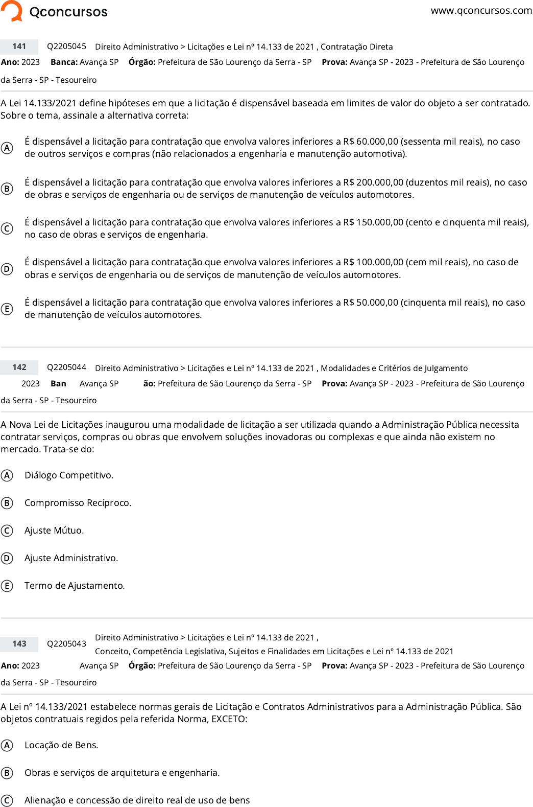 www.qconcursos.com Ano: 2023 Banca: Avança SP Órgão: Prefeitura de São Lourenço da Serra - SP A Lei 14.133/2021 de�ne hipóteses em que a licitação é dispensável baseada em limites de valor do objeto a ser contratado. Sobre o tema, assinale a alternativa correta: A É dispensável a licitação para contratação que envolva valores inferiores a R$ 60.000,00 (sessenta mil reais), no caso de outros serviços e compras (não relacionados a engenharia e manutenção automotiva). B É dispensável a licitação para contratação que envolva valores inferiores a R$ 200.000,00 (duzentos mil reais), no caso de obras e serviços de engenharia ou de serviços de manutenção de veículos automotores. C É dispensável a licitação para contratação que envolva valores inferiores a R$ 150.000,00 (cento e cinquenta mil reais), no caso de obras e serviços de engenharia. D É dispensável a licitação para contratação que envolva valores inferiores a R$ 100.000,00 (cem mil reais), no caso de obras e serviços de engenharia ou de serviços de manutenção de veículos automotores. E É dispensável a licitação para contratação que envolva valores inferiores a R$ 50.000,00 (cinquenta mil reais), no caso de manutenção de veículos automotores. Ano: 2023 Banca: Avança SP Órgão: Prefeitura de São Lourenço da Serra - SP A Nova Lei de Licitações inaugurou uma modalidade de licitação a ser utilizada quando a Administração Pública necessita contratar serviços, compras ou obras que envolvem soluções inovadoras ou complexas e que ainda não existem no mercado. Trata-se do: A Diálogo Competitivo. B Compromisso Recíproco. C Ajuste Mútuo. D Ajuste Administrativo. E Termo de Ajustamento. Ano: 2023 Banca: Avança SP Órgão: Prefeitura de São Lourenço da Serra - SP A Lei nº 14.133/2021 estabelece normas gerais de Licitação e Contratos Administrativos para a Administração Pública. São objetos contratuais regidos pela referida Norma, EXCETO: A Locação de Bens. B Obras e serviços de arquitetura e engenharia. C Alienação e concessão de direito real de uso de bens 141 Q2205045 >Direito Administrativo Licitações e Lei nº 14.133 de 2021 , Contratação Direta Prova: Avança SP - 2023 - Prefeitura de São Lourenço da Serra - SP - Tesoureiro 142 Q2205044 >Direito Administrativo Licitações e Lei nº 14.133 de 2021 , Modalidades e Critérios de Julgamento Prova: Avança SP - 2023 - Prefeitura de São Lourenço da Serra - SP - Tesoureiro 143 Q2205043 >Direito Administrativo Licitações e Lei nº 14.133 de 2021 , Conceito, Competência Legislativa, Sujeitos e Finalidades em Licitações e Lei nº 14.133 de 2021 Prova: Avança SP - 2023 - Prefeitura de São Lourenço da Serra - SP - Tesoureiro https://www.qconcursos.com/ https://www.qconcursos.com/questoes-de-concursos/bancas/avanca-sp https://www.qconcursos.com/questoes-de-concursos/institutos/prefeitura-de-sao-lourenco-da-serra-sp https://www.qconcursos.com/questoes-de-concursos/bancas/avanca-sp https://www.qconcursos.com/questoes-de-concursos/institutos/prefeitura-de-sao-lourenco-da-serra-sp https://www.qconcursos.com/questoes-de-concursos/bancas/avanca-sp https://www.qconcursos.com/questoes-de-concursos/institutos/prefeitura-de-sao-lourenco-da-serra-sp https://www.qconcursos.com/questoes-de-concursos/questoes/4d2ad79d-1c https://www.qconcursos.com/questoes-de-concursos/disciplinas/direito-direito-administrativo https://www.qconcursos.com/questoes-de-concursos/disciplinas/direito-direito-administrativo/licitacoes-e-lei-n-14-133-de-2021 https://www.qconcursos.com/questoes-de-concursos/disciplinas/direito-direito-administrativo/contratacao-direta https://www.qconcursos.com/questoes-de-concursos/provas/avanca-sp-2023-prefeitura-de-sao-lourenco-da-serra-sp-tesoureiro https://www.qconcursos.com/questoes-de-concursos/questoes/4d282b75-1c https://www.qconcursos.com/questoes-de-concursos/disciplinas/direito-direito-administrativo https://www.qconcursos.com/questoes-de-concursos/disciplinas/direito-direito-administrativo/licitacoes-e-lei-n-14-133-de-2021 https://www.qconcursos.com/questoes-de-concursos/disciplinas/direito-direito-administrativo/modalidades-e-criterios-de-julgamento https://www.qconcursos.com/questoes-de-concursos/provas/avanca-sp-2023-prefeitura-de-sao-lourenco-da-serra-sp-tesoureiro https://www.qconcursos.com/questoes-de-concursos/questoes/4d25836e-1c https://www.qconcursos.com/questoes-de-concursos/disciplinas/direito-direito-administrativo https://www.qconcursos.com/questoes-de-concursos/disciplinas/direito-direito-administrativo/licitacoes-e-lei-n-14-133-de-2021 https://www.qconcursos.com/questoes-de-concursos/disciplinas/direito-direito-administrativo/conceito-competencia-legislativa-sujeitos-e-finalidades-em-licitacoes-e-lei-n-14-133-de-2021 https://www.qconcursos.com/questoes-de-concursos/provas/avanca-sp-2023-prefeitura-de-sao-lourenco-da-serra-sp-tesoureiro D Concessão de Serviços de Transporte Público e Rodovias. E Contratação de tecnologia da informado e de comunicação. Ano: 2023 Banca: Creative Group Órgão: Prefeitura de Itá - SC Em conformidade com a lei 14.133/21, os fundos especiais e as demais entidades controladas direta ou indiretamente pela Administração Pública estão abrangidos pela lei licitatória, assim como: A as empresas públicas. B as sociedade de economia mista. C as autarquias. D as ONGS. Ano: 2023 Banca: Creative Group Órgão: Prefeitura de Itá - SC De acordo com a lei 14.133/2021, a quinta fase do processo licitatória é o (a) : A homologação B habilitação C julgamento D apresentação de propostas e lance Ano: 2023 Banca: Avança SP Órgão: Prefeitura de São Lourenço da Serra - SP Acerca das hipóteses de contratação direta previstas na Lei nº 14.133/2021, avalie as a�rmativas a seguir, julgando-as entre verdadeira (V) ou falsa (F) e assinale a alternativa que contém a sequência correta. ( ) As contratações levadas a cabo por meio de Inexigib