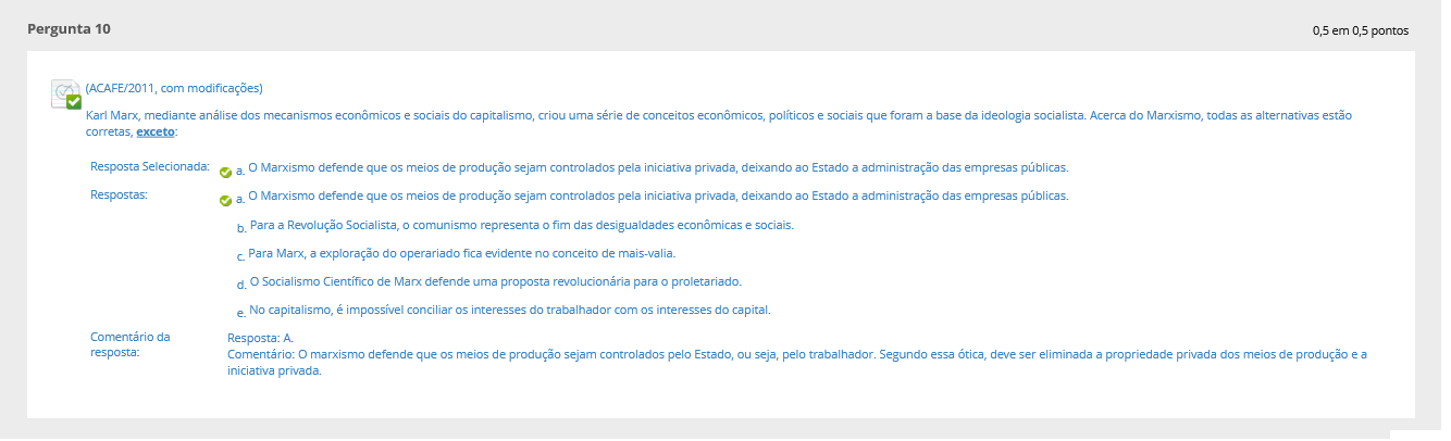 PERGUNTA 1 0,5 pont (ACAFE/2011, com modificações) Karl Marx, mediante análise dos mecanismos econômicos e sociais do capitalismo, criou uma série de