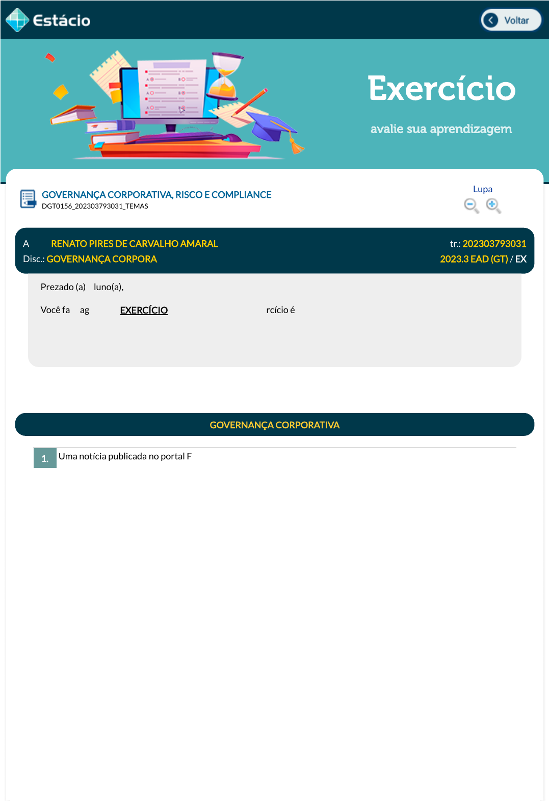15/08/2023, 18:15 Estácio: Alunos https://simulado.estacio.br/alunos/ 1/6 Exercício avalie sua aprendizagem Uma notícia publicada no portal FGV pelo professor da Escola Brasileira de Educação Pública e de Empresas, professor Joaquim Rubens Fontes Filho, sobre economia no tempo de COVID-19, destaca: "Governança corporativa tem papel fundamental em tempos de crise". "É importante que controladores, conselheiros e administradores tenham um bom canal de relacionamento explicando claramente a sociedade e seus pequenos acionistas o que está ocorrendo e o que está sendo feito para melhorar a situação da empresa pelo menos no médio prazo", Joaquim Rubens destaca que, nesse momento a governança corporativa assume um papel fundamental, pois trata da relação entre os sócios e com a própria sociedade. Ele lembra de dois grupos importantes nessa estrutura. O primeiro deles são os pequenos investidores, que, com menos possibilidade de diversi�carem suas aplicações, serão severamente impactados pela crise. Ele destaca que a saída desses agentes pode trazer problemas de liquidez para as empresas, que terão muito mais di�culdades de captar recursos. Outro grupo importante são os empregados, que fazem parte do conjunto fundamental de stakeholders de uma empresa. "Governança corporativa signi�ca equidade de tratamento dos sócios e transparência nas relações. É importante então que controladores, conselheiros e administradores tenham um bom canal de relacionamento explicando claramente a sociedade e seus pequenos acionistas o que está ocorrendo e o que está sendo feito para melhorar a situação da empresa pelo menos no médio prazo", destaca. Disponível em https://portal.fgv.br/noticias/governanca-corporativa-tem-papel-fundamental-tempos-crise-destaca-especialista. acesso em 13/09/20 (adaptado) Sobre Governança Corporativa, analise os itens abaixo e assinale a única alternativa correta. I - Sistema que, usando principalmente o conselho de administração, a auditoria externa e o conselho �scal, estabelece regras e poderes para conselhos, comitês, diretoria e outros gestores, procurando prevenir abusos de poder e criando instrumentos de �scalização, princípios e regras que possibilitem uma gestão e�ciente e e�caz. II - As boas práticas de Governança Corporativa têm a �nalidade de aumentar o valor da sociedade, facilitar seu acesso ao capital e contribuir para sua perenidade. GOVERNANÇA CORPORATIVA, RISCO E COMPLIANCE Lupa DGT0156_202303793031_TEMAS Aluno: RENATO PIRES DE CARVALHO AMARAL Matr.: 202303793031 Disc.: GOVERNANÇA CORPORA 2023.3 EAD (GT) / EX Prezado (a) Aluno(a), Você fará agora seu EXERCÍCIO! Lembre-se que este exercício é opcional, mas não valerá ponto para sua avaliação. O mesmo será composto de questões de múltipla escolha. Após responde cada questão, você terá acesso ao gabarito comentado e/ou à explicação da mesma. Aproveite para se familiarizar com este modelo de questões que será usado na sua AV e AVS. GOVERNANÇA CORPORATIVA 1. javascript:voltar(); javascript:voltar(); javascript:diminui(); javascript:aumenta(); 15/08/2023, 18:15 Estácio: Alunos https://simulado.estacio.br/alunos/ 2/6 III - Sistema para recuperar e garantir a con�abilidade em uma determinada empresa para os seus acionistas, criando um conjunto e�ciente de mecanismos, tanto de incentivos como de monitoramento, a �m de assegurar que o comportamento dos executivos esteja sempre alinhado com o interesse dos acionistas, cujas ações serão executadas pelo Conselho de Administração. IV - Contribui para um desenvolvimento econômico sustentável, proporcionando melhorias no desempenho das empresas. Por estes motivos, torna-se tão importante ter conselheiros indicados pelo fundador, por questão de con�ança, independente da quali�cação, e sistemas de Governança Corporativa de qualidade, evitando-se assim diversos fracassos empresariais como abusos de poder, erros e fraudes. Em uma sociedade empresária foi realizada a análise SWOT, com isso, foi constatada uma crise sanitária (pandemia) capaz de provocar prejuízos �nanceiros em virtude da legislação que obrigou o fechamento das empresas por um longo período. Com base nesse diagnóstico da análise SWOT, pode-se a�rmar que se trata de um caso de Ética empresarial e governança corporativa são conceitos distintos, mas relacionados. Sobre eles podemos a�rmar que: Os itens I, II e IV estão corretos. Os itens I e II estão corretos. Os itens III e IV estão corretos. Apenas o item I está correto. Apenas o item II está correto. Data Resp.: 15/08/2023 18:04:45 Explicação: Sobre o conselho de administração, é um órgão deliberativo, não de execução; sobre a indicação dos componentes do conselho, estes devem ser pessoas quali�cadas, não por ser indicado pelo fundador, se for o caso. 2. oportunidade. compliance. ameaça. fraqueza. força. Data Resp.: 15/08/2023 18:08:25 Explicação: As ameaças representam os cenários alheios à organização que podem trazer-lhe algum tipo de risco ou danos. São aqueles produtos ou serviços ofertados por concorrentes que se assemelham às atividades da empresa. Elas também podem indicar as possibilidades de novos entrantes no mercado ou de novas regulações e leis. 3. Determinam os padrões de desempenho operacional, gestão centralizadora e consideram as prioridades organizacionais acima das demandas da sociedade. Embora a ética empresarial não seja um princípio da governança corporativa, representa a base que sustenta sua prática nas organizações. Têm como objetivos demarcar os princípios que guiarão as ações a serem realizadas e em quanto tempo o resultado será alcançado. Visam o planejamento de longo prazo e abordam a responsabilidade dos níveis mais altos da administração em formular e reformular suas estratégias empresariais. É uma ferramenta de gestão fundamental para a realização da aná
