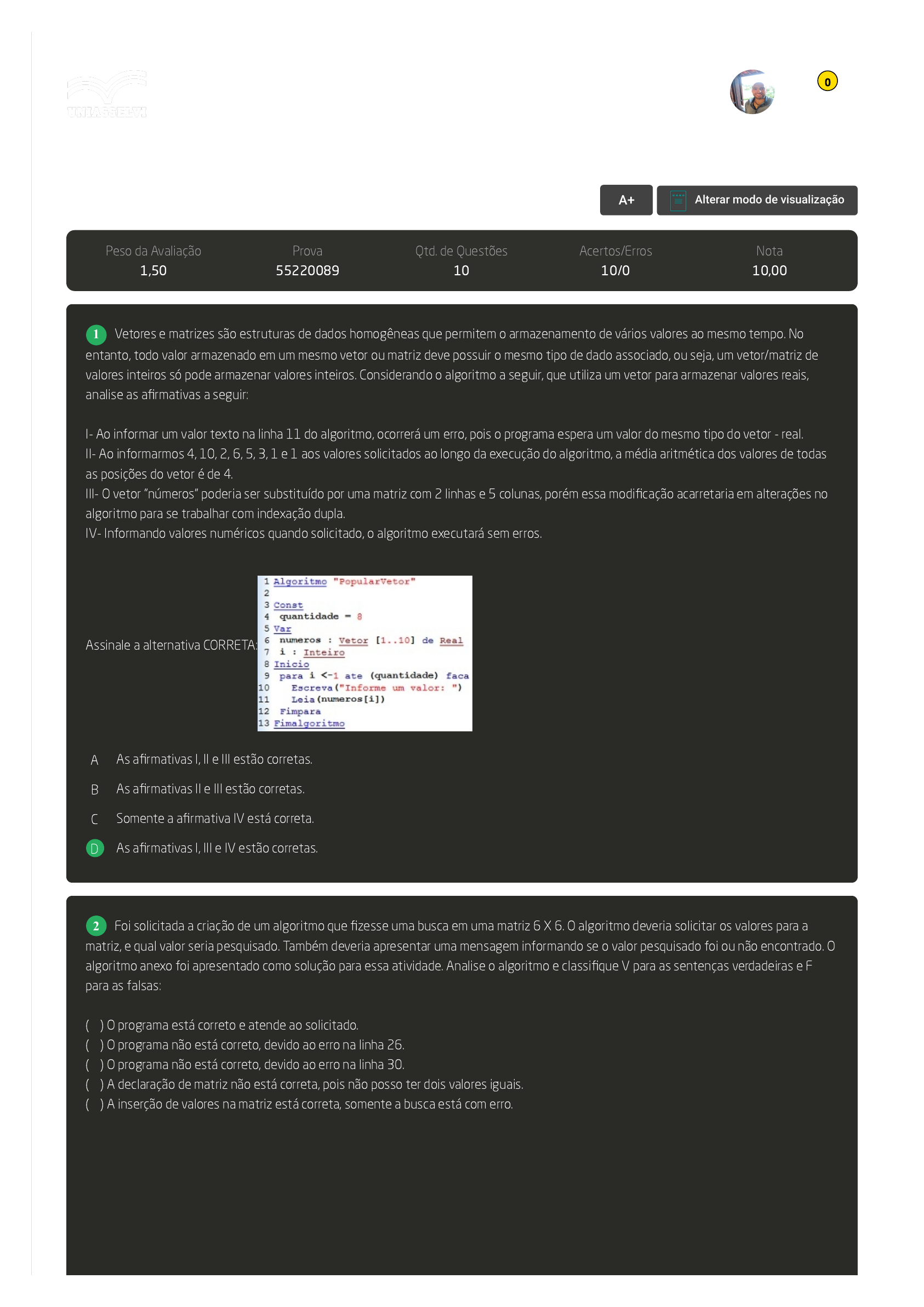 algoritmo anexo foi apresentado como solução para essa atividade. Analise o algoritmo e classifique V para as sentenças verdadeiras e F