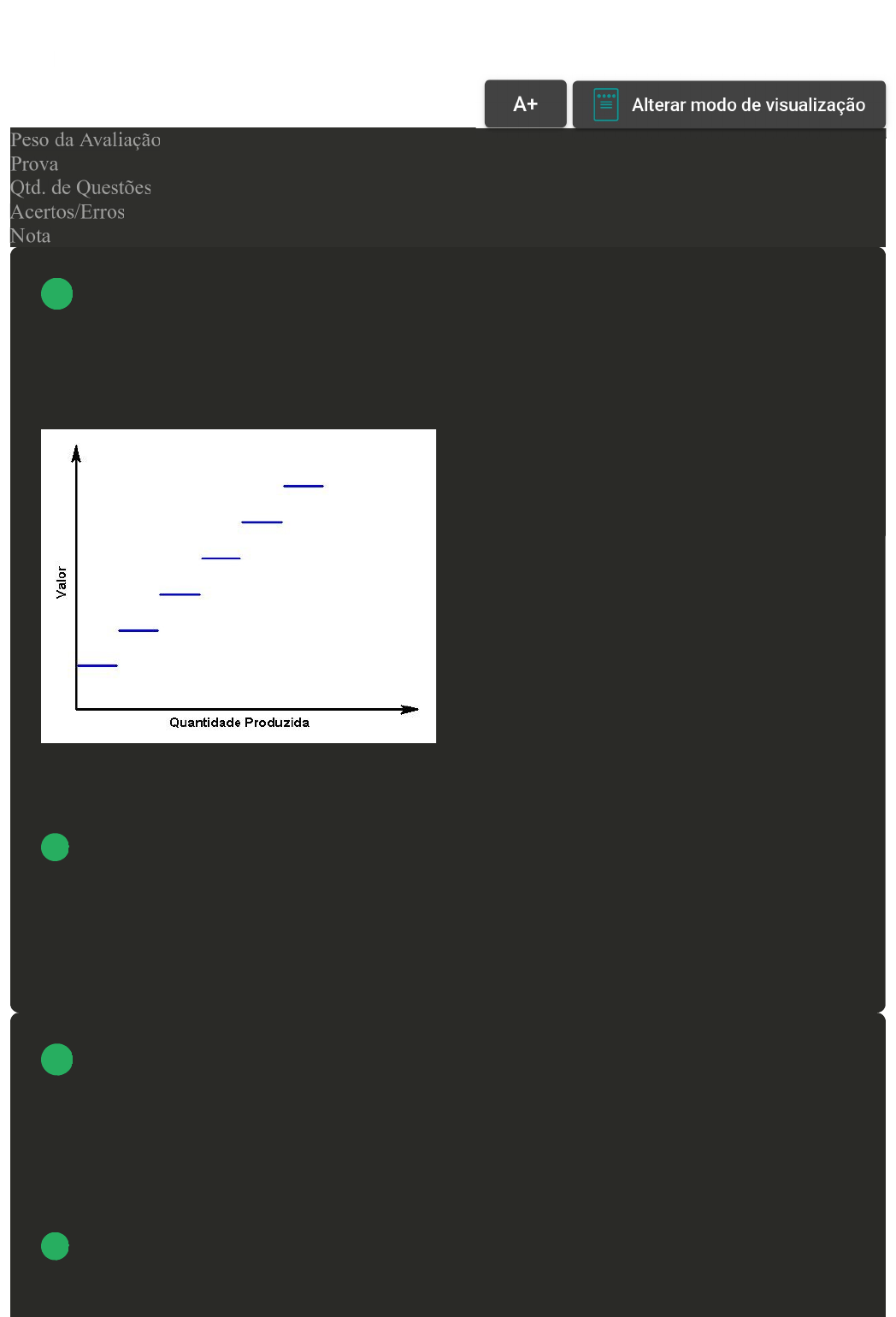 Prova Impressa GABARITO | Avaliação I - Individual (Cod.:883559) 1,50 68143352 10 9/1 9,00 Existem gastos cujo comportamento apresenta um escalonamento em relação à quantidade de bens produzidos ou serviço prestado, sofrendo alterações abruptas de valor em função dessas quantidades. Ou seja, se mantêm inalterados dentro de um determinado patamar de produção, mas, ao ser rompido este patamar, haverá alteração de valor que se manterá até que o patamar seja novamente rompido. Observe esse comportamento no gráfico a seguir: Qual a designação correta para este tipo de gastos? A Custos Semifixos. B Custos Semivariáveis. C Despesas Semivariáveis. D Despesas Semifixas. Compreendem os gastos necessários para a fabricação dos produtos, os quais, pela própria natureza, não se enquadram como materiais ou como mão de obra. São gastos como aluguéis, energia elétrica, serviços de terceiros, manutenção da fábrica, depreciação das máquinas, seguro contra roubo e incêndio, material de higiene e limpeza, óleos e lubrificantes para as máquinas, pequenas peças para reposição, telefones, comunicação etc. De que gastos estamos falando? A Gastos gerais de fabricação. B Material direto aplicado. 1 2 Avaliação I - Individual https://ava2.uniasselvi.com.br/subject/grades-and-tests/answer-book/... 1 of 5 15/08/2023, 20:26 C Mão de obra direta. D Custos indiretos de fabricação. Considere uma empresa que adquire um material direto a ser usado na fabricação de produtos, com os impostos (IPI e ICMS) recuperáveis, com os seguintes dados: Total da Nota Fiscal = $ 55.000,00. Valor do IPI (10%) = $ 5.000,00. ICMS (12%) = $ 6.000,00.Qual o custo que a empresa deve considerar? A R$ 49.000,00. B R$ 44.000,00. C R$ 55.000,00. D R$ 50.000,00. As empresas industriais passaram a produzir em grande quantidade, por meio do uso de máquinas. A apuração do custo do produto vendido deveria incluir todos os elementos empregados na fabricação do produto. Conforme essa afirmação, classifique V para as sentenças verdadeiras e F para as falsas: ( ) Basicamente, os componentes do custo industrial podem ser resumidos em três elementos: Material direto aplicado – MD, Mão de obra direta empregada na fabricação do produto e Custos indiretos de fabricação – CIF (e demais gastos fabris). ( ) Os principais elementos que influenciam no resultado de qualquer entidade são representados por meio de receitas auferidas, dos custos, diretos ou indiretos, e despesas incorridas. ( ) Gastos Gerais de Fabricação compreendem os demais gastos necessários para a fabricação dos produtos. ( ) Os materiais diretos compreendem a matéria-prima (componente físico que sofre a transformação, como tecido, por exemplo) e materiais secundários (botão de um avental, por exemplo) e embalagem. Assinale a alternativa que apresenta a sequência CORRETA: A F - F - V - V. B F - F - F - V. C V - F - V - F. D V - V - V - V. 3 4 5 Avaliação I - Individual https://ava2.uniasselvi.com.br/subject/grades-and-tests/answer-book/... 2 of 5 15/08/2023, 20:26 Os gastos que uma empresa realiza com o objetivo de obter resultado positivo classificam-se inicialmente como investimentos, custou ou despesas. Os custos serão reconhecidos e reclassificados de acordo com seu comportamento, que por sua vez pode ser direto ou indireto, fixo ou variável. Com base no comportamento dos custos, assinale a alternativa CORRETA que apresenta apenas custos variáveis em uma empresa que tem como atividade a fabricação de roupas: A Linha, botão, tecido e material de limpeza. B Linha, botões, produtividade das costureiras e tecido. C Tecido, salário fixo das costureiras, botões, aluguel. D Tecido, energia elétrica, aluguel e botões. São aqueles que podemos identificar com precisão o seu real consumo por produto. Geralmente, para essa identificação, temos um controle de medida, uma receita, uma ficha técnica de produto, um controle interno. Nesse controle, temos a quantidade precisa dos componentes integrantes do produto. A que estamos nos referindo? A Custos diretos. B Materiais diretos. C Custos indiretos. D Materiais indiretos. Geralmente, os estoques que são bastante numerosos em termos de itens e menos representativos em unidade de valor são inventariados ao final do período, no momento do balanço. Como esses estoques são conhecidos? A Estoques itens B. B Estoques itens B e C. C Estoques itens A. D Estoques itens C. 6 7 8 Avaliação I - Individual https://ava2.uniasselvi.com.br/subject/grades-and-tests/answer-book/... 3 of 5 15/08/2023, 20:26 Considerando os dados a seguir, mensure o custo unitário dos produtos A e B, utilizando a mão se obra direta como critério de rateio. No arredondamento, considere sempre duas casas após a vírgula. Descrição Produto A Produto B matéria-prima R$ 40.000,00 R$ 30.000,00 mão de obra direta R$ 15.000,00 R$ 18.000,00 custos indiretos R$ 50.000,00 volume de produção 400 400 horas- máquina 315 385 Em seguida, assinale a alternativa CORRETA: A R$ 190,00 e R$ 180,00. B R$ 315,00 e R$ 385,00. C R$ 204,25 e R$ 178,25. D R$ 194,32 e R$ 188,18. A Contabilidade financeira preocupa-se com as leis e normas e é obrigatória para as entidades legalmente estabelecidas. Seu objetivo maior está associado ao passado, e seus atos e práticas são estabelecidos por meio de regras normativas que, muitas vezes, comprometem a tomada de decisões. Algumas dessas “regras” recebem a denominação de princípios fundamentais da Contabilidade. Entre os princípios fundamentais da Contabilidade aplicados em custos, assinale a alternativa INCORRETA: A Uniformidade (consistência). B Entidade (pertences). C Prudência (conservadorismo). D Competência (da realização). Os custos são os gastos que ocorrem no ambiente produtivo, e existem diversas nomenclaturas com visões conceituais distintas para cada tipo de custo. Pode-se citar os custos de transformação, custos primários, c