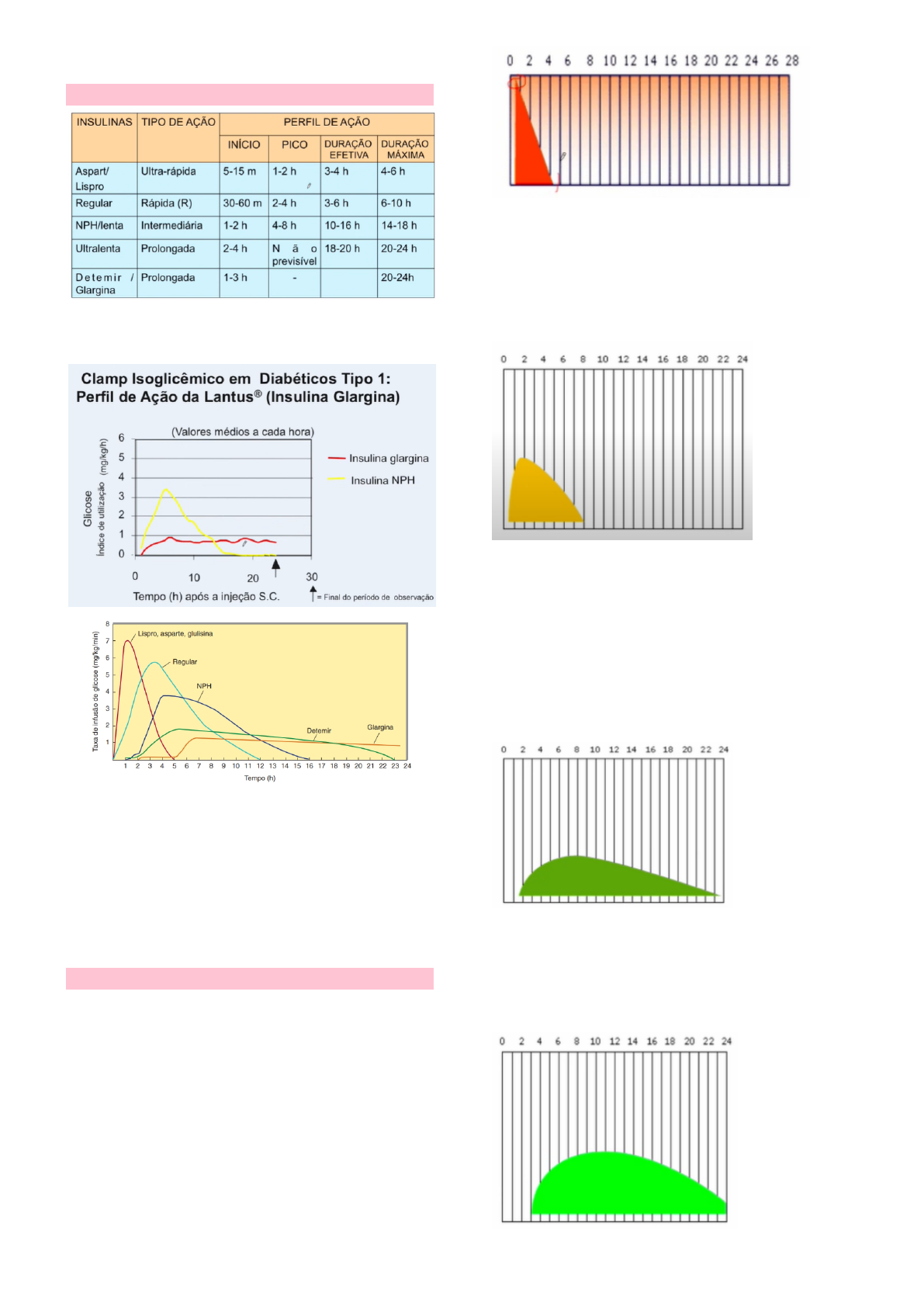 Insulinoterapia Tipos de insulina Insulina humana: polipeptídeo com 2 cadeias de aminoácidos, 1 alfa e 1 beta, ligadas por pontes de sulfeto. Extensão e duração de ação de vários tipos de insulina, conforme indicado pelas taxas de infusão de glicose (mg/kg/min) necessárias para se manter uma concentração constante de glicose. As ações duram o indicado para uma dose média de 0,2 a 0,3 U/kg. A duração da insulina regular e da NPH aumenta consideravelmente quando se aumenta a dose. Preparações de insulina Insulina de ação ultra-rápida (lispro): insulina monomérica produzida por tecnologia recombinante em que a prolina e a lisina tem suas posições invertidas. Obtém-se uma insulina cujo início de ação é mais rápido e a duração mais curta do que a insulina humana regular, isso permite que seja aplicada antes ou após as refeições. Indicada em situações emergenciais, antes ou após refeições Insulina de ação rápida (regular): produzida por tecnologia de DNA recombinante e igual a insulina humana. Uma injeção deve ser acompanhada de uma refeição ou lanche contendo carboidratos dentro de 30 minutos. É indicada nos casos de diabetes descompensada, choque e infecções. Minutos antes da refeição. Insulina de ação intermediária: insulina NPH, início de ação retardado por ser combinada com protamina. Após administração por via subcutânea, as enzimas proteolíticas degrdam a protamina, permitindo a absorção da insulina. Efeito máximo de 4-12 horas, duração de 24 horas, aplicação pela manhã antes do café e a noite antes do jantar ou ao deitar. Não é indicada em ceto-acidose ou situações emergenciais. Insulina de ação longa: - insulina ultra-lenta (insulina zínquica estendida); associada com acetato de zinco, dificultando a absorção da insulina, promovendo maior tempo de ação Glargina: ponto isoelétrico menor que a insulina humana, levando à precipitação no local da injeção, o que prolonga sua ação. Administrada no tecido subcutâneo, tem pH muito inferior, fazendo com que ela precipite formando depósitos de insulina que serão degradados aos poucos → absorvidos lentamente pela corrente sanguínea. Insulina pré-mistura: combinação de insulina rápida e de ação intermediária em proporções padrão. A proporção de 30% de insulina rápida para 70% de insulina de ação intermediária é a mais utilizada. Esquemas de tratamento para reposição de insulina Efeitos adversos Hipoglicemia - Suor frio, palidez, nervosismo ou tremor, ansiedade, cansaço ou fraqueza incomum, confusão, dificuldade de concentração, sonolência, fome excessiva, alteração temporária da visão, dor de cabeça, náusea e palpitação. Edema de extremidades Reações de hipersensibilidade local ou generalizada. Lipodistrofia pode ocorrer no local de aplicação das injeções como uma consequência da aplicação frequente das injeções no mesmo local. Material necessário: Agulhas: A aplicação com agulhas mais curtas está especialmente recomendada para crianças e adolescentes, além de adultos com IMC< 25 kg/m2. Canetas e seringas: Doses muito baixas de insulina (ou crianças): canetas que apresentam graduação de 0,5U. Demais, seringas de 30 U ou 50 U, graduadas em 0,5U ou 1U. Perfil do tempo de ação pós-absorção INSULINOTERAPIA PARA PESSOAS COM DM1 Contém 51 aminoácidos dispostos em duas cadeias (A e B) unidas por pontes de dissulfeto. As preparações de insulina comerciais diferem em diversos aspectos, como diferenças nas técnicas de produção por DNA recombinante, sequência de aminoácidos, concentração, solubilidade e tempo de início e duração de sua ação biológica. Insulina sérica fisiológica média de 24 horas e níveis de glicose plasmática em indivíduos não diabéticos. Insulina humana: DNA recombinante Insulina análoga: alterações na cadeia de a.a. para melhoria no tempo de ação (maior meia vida) Iniciar o tratamento com insulina imediatamente após o diagnóstico clínico, para prevenir a descompensação metabólica e a cetoacidose diabética. Estratégia de reposição mimetizar a secreção fisiológica. Necessidades diárias no DM1: 0,4 U/kg/dia a 1,0 U/kg/dia. 50% da secreção como componente basal, ao longo de todo o dia insulinas basais múltiplas doses (MDI) ou infusão contínua (SICI). 50% restantes como componente prandial, em resposta às refeições preferentemente análogos de rápida ou ultrarrápida ação, com MDI ou SICI. Insulina é um polipeptídeo: degradada no TGI se for administrada por via oral → deve ser administrada por via subcutânea. Em uma emergência hiperglicêmica, a insulina regular é injetada por via IV. Liberação de insulina A insulina é liberada em 2 fases: 1. Bôlus (grande quantidade de insulina liberada em pouco tempo): estimulada por glicose, aminoácidos, fármacos hipoglicemiantes (sulfonilureia), glucagon, hormônios gastrointestinais (incretinas); isso libera a insulina estocada nas células beta. Fase II: liberação lenta; quantidade de insulina liberada é menor → insulina basal; formação de um platô. Tratamento do diabetes tipo I busca simular esse gráfico Hipoglicemiantes orais Ação dependente da integridade das células beta do pâncreas. Drogas que só tem indicação no diabetes tipo II (não insulina dependente) Sulfonilureias Aumentam a secreção de insulina (secretagogos) Secretagogos = liberação de insulina das células β do pâncreas. Estimulam as células beta a produzirem mais insulina. Conforme aumentam as gerações, aumenta a potência relativa de estimular as células beta. Bloqueia canais de potássio, impedindo que ele saia → despolarização → abertura de canais de cálcio → liberação de insulina. As sulfonilureias de uso corrente são as de segunda geração (>potência): Glibenclamida (insuficiência renal: aumentar a duração de ação e aumentar significativamente o risco de hipoglicemia, 