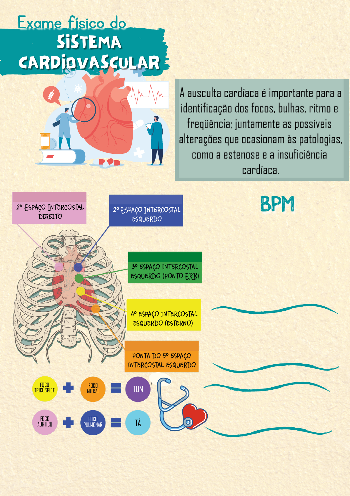 (Batimentos por minuto) 60 a 100 - normocardia > 100 - taquicardia < 60 - bradicardia PALPAÇÃO: Investigar precórdio, ictus cordis, avaliar pulsos. Ausculta Cardíaca INSPEÇÃO: Aspecto geral do tórax, turgência de jugular, visibilidade do ictus cordis FOCO AÓRTICO FOCO PULMONAR AÓRTICO ACESSÓRIO FOCO TRICÚSPIDE FOCO MITRAL (Respiração por minuto) dificuldade - dispnéia 12 a 20 - eupnéia < 12 - bradipnéia > 20 - taquipnéia 0 - apnéia PALPAÇÃO: Investigar as estruturas da parede torácica, expansibilidade e frêmito toracovocal. Pontos de Ausculta Sequência de Ausculta Ausculta Pulmonar Permite a audição dos ruídos normais ou patológicos. SONS NORMAIS: Som traqueal, respiração brônquica,murmúrio vesicular. SONS ANORMAIS: estertores, crepitações, roncos, sibilos, estridor e atrito pleural. INSPEÇÃO: Observar aspecto, simetria e movimentação torácica