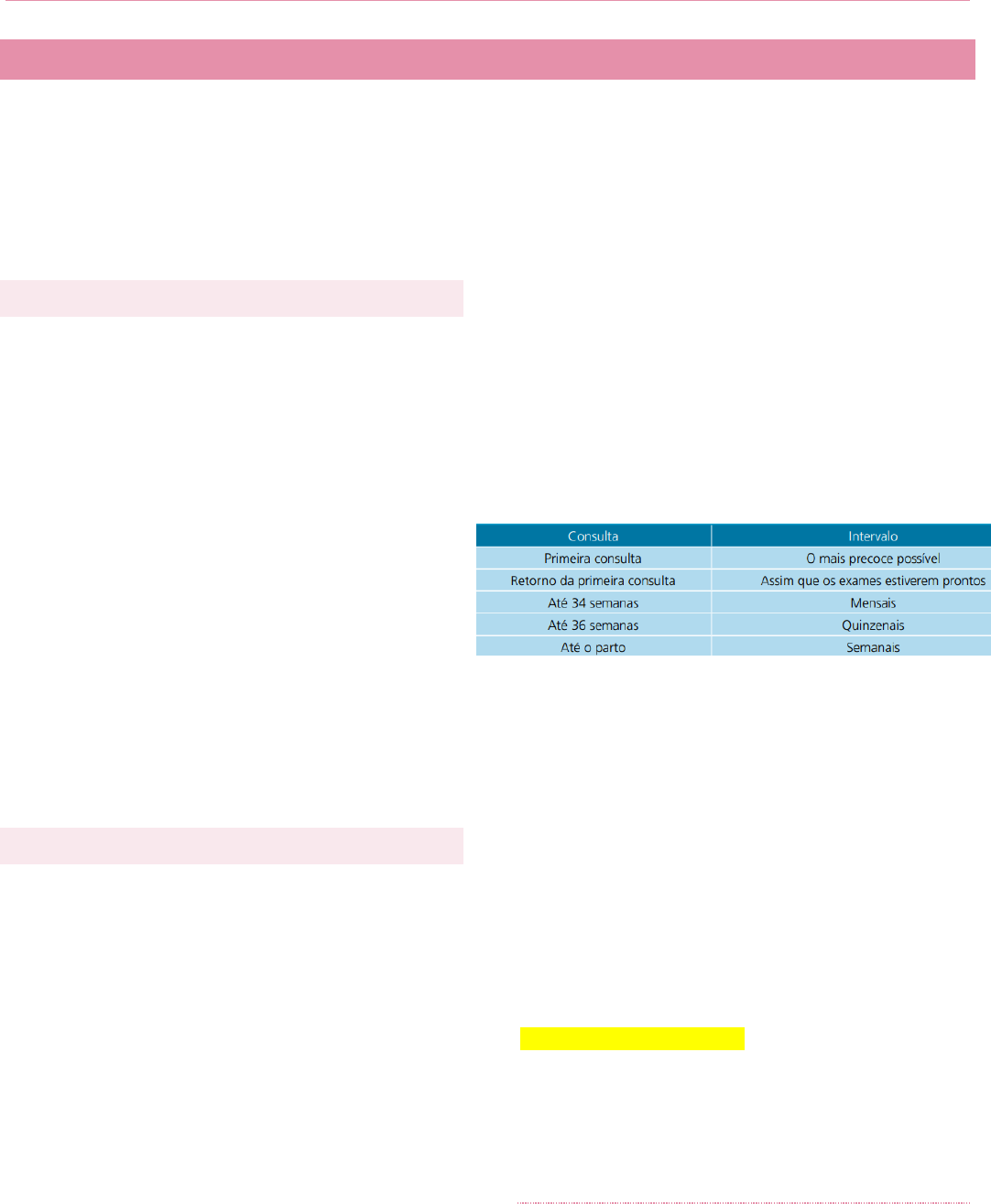 APG 20 - GINECOLOGIA E OBSTETRÍCIA PRÉ-NATAL Magny Emanuele Lima – Medicina Objetivos 1. Discutir a assistência do Pré-natal. 2. Compreender os exames solicitados no pré-natal. 3. Compreender as orientações nutricionais e suplementação na gestação. Assistência ao pré-natal O Ministério da Saúde assegura a mulher o direito ao planejamento reprodutivo e atenção humanizada à gravidez, ao parto e ao puerpério (pós-parto) e, às crianças, o direito ao nascimento seguro e ao crescimento e desenvolvimento saudáveis. Os avanços na medicina contribuíram efetivamente para reduzir os índices de mortalidade, tanto materno como perinatal. A assistência pré-natal é um conjunto de medidas de natureza médica, social, psicológica e de cuidados gerais que visa propiciar à mulher gestante o desenvolvimento saudável da gravidez. A realização do pré-natal representa papel fundamental para a prevenção e/ou detecção precoce de patologias, tanto maternas como fetais, permitindo o desenvolvimento saudável do feto e reduzindo os riscos para a gestante. Consultas O pré-natal deve começar assim que a mulher descobre que está grávida. No Brasil, a partir desse momento, o Ministério da Saúde recomenda que sejam realizadas no mínimo seis consultas (uma no primeiro trimestre da gravidez, duas no segundo e três no terceiro), sendo ideal que a primeira consulta aconteça no primeiro trimestre e que, até a 34ª semana, sejam realizadas consultas mensais. Entre a 34ª e 38ª semanas, o indicado seria uma consulta a cada duas semanas (15 dias) e, a partir da 38ª semana, consultas toda semana até o parto, que geralmente acontece na 40ª semana, mas pode durar até 42 semanas. O atendimento proporcionado nessas consultas deve ser registrado e monitorado no Cartão da Gestante, pelos profissionais envolvidos, utilizado nas unidades básicas de Saúde e também pelos profissionais que a atenderão no parto. Por meio desse monitoramento, é possível fazer o acompanhamento, o diagnóstico e o tratamento de doenças pré-existentes ou das que podem surgir durante a gravidez. Durante o pré-natal, a gestante deve receber informações sobre seus direitos, hábitos saudáveis de vida (alimentação, exercícios) medicamentos necessários e os que devem ser evitados e as mudanças que ocorrem durante a gravidez. Também tem de receber informações sobre sinais de risco em cada etapa da gravidez, como lidar com dificuldades de humor, temores em relação à sua saúde e a saúde do bebê, enjoos, inchaço, manchas na pele, sinais de parto etc. A consulta pré-natal é composta de anamnese, exame físico e avaliação dos exames complementares. Nas gestantes de baixo risco, após a realização da primeira consulta, o retorno é agendado para 15 dias depois para avaliação dos exames complementares solicitados. As mulheres com gestações complicadas – como com gêmeos ou diabetes – costumam necessitar de consultas a intervalos de 1 a 2 semanas. Divisão dos trimestres: O primeiro trimestre estende-se até o final de 14 semanas, o segundo, até 28 semanas, e o terceiro começa com 29 semanas e vai até 42 semanas de gestação. Assim, cada um é formado por 14 semanas. Primeira consulta O ideal é iniciar o pré-natal mais precocemente possível. Quanto mais cedo o risco gestacional (baixo e alto) for calculado, mais rapidamente a gestante poderá efetivar as eventuais correções APG 20 - GINECOLOGIA E OBSTETRÍCIA PRÉ-NATAL Magny Emanuele Lima – Medicina necessárias e usufruir dos benefícios da assistência pré-natal precoce, já sabendo se será um pré- natal de baixo ou alto risco. Por isso, a primeira consulta deve objetivar determinar de forma adequada o estado atual da gestante, bem como fazer o diagnóstico de doenças preexistentes e estabelecer seus tratamentos. Assim, teria caráter preventivo e de orientação. Rastrear processos patológicos latentes, como cardiopatia, endocrinopatias e erros posturais, é de extrema importância. A presença do parceiro sexual na primeira consulta traz significativo diferencial. Não havendo possibilidade da presença do parceiro, um familiar também ajuda, dando confiança à gestante. O atendimento deve ser sempre realizado em ambiente que garanta segurança, privacidade e sigilo a gestante e parceiro, com escuta aberta e não julgadora, acolhimento das expectativas, conforto e apoio para resolução de conflitos. Anamnese Deve ser bem elaborada! Identificação: nome da gestante e do acompanhante, idade, etnia, estado civil, profissão, religião, nacionalidade, naturalidade e procedência, escolaridade. ! Nos extremos da vida reprodutiva (adolescência e após os 35 anos), as complicações obstétricas e a mortalidade perinatal são maiores. As gestantes adolescentes (menor que 19 anos) têm maior incidência de anemias, doença hipertensiva específica da gestação, prematuridade, menor adesão ao pré-natal, baixo peso ao nascer e desproporção cefalopélvica. A idade materna acima dos 35 anos está associada à maior incidência de malformações fetais e aneuploidias. Certas doenças apresentam maior incidência em mulheres negras (a exemplo da pré-eclâmpsia e da anemia falciforme). Algumas atividades laborais são consideradas de risco gestacional e fetal. Estatísticas demonstram maior morbimortalidade materna e fetal entre as solteiras. As informações sobre a naturalidade e a procedência podem orientar o médico no sentido de rastrear a possibilidade de enfermidades capazes de influir consideravelmente na gestação (como doença de Chagas, esquistossomose, malária, Zika). HMA: Perguntar sobre a percepção da paciente a respeito de sua saúde atual, sua certeza de gravidez, e buscar eventuais queixas. Principais queixas: Náuseas e vômitos: são queixas comuns na primeira metade da gestação. Recomenda-se refeições em pequenas quantidades e fracionadas. O agravamento do quadro pode provocar desidra