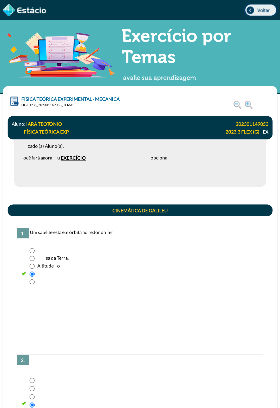 16/08/2023, 14:46 Estácio: Alunos https://simulado.estacio.br/alunos/ 1/5 Exercício por Temas avalie sua aprendizagem Um satélite está em órbita ao redor da Terra em um movimento circular uniforme. Qual das grandezas físicas abaixo pode ser calculada diretamente a partir da velocidade angular do satélite? Um corpo tem sua posição registrada de acordo com a função S(t) = 2 + 100t- 5t2. O instante em que o móvel atinge o ponto de repouso é? FÍSICA TEÓRICA EXPERIMENTAL - MECÂNICA Lupa DGT0985_202301149053_TEMAS Aluno: IARA TEOTÔNIO Matr.: 202301149053 Disc.: FÍSICA TEÓRICA EXP 2023.3 FLEX (G) / EX Prezado (a) Aluno(a), Você fará agora seu EXERCÍCIO! Lembre-se que este exercício é opcional, mas não valerá ponto para sua avaliação. O mesmo será composto de questões de múltipla escolha. Após responde cada questão, você terá acesso ao gabarito comentado e/ou à explicação da mesma. Aproveite para se familiarizar com este modelo de questões que será usado na sua AV e AVS. CINEMÁTICA DE GALILEU 1. Raio da órbita. Massa da Terra. Altitude do satélite. Período da órbita. Temperatura na superfície da Terra. Data Resp.: 16/08/2023 09:54:27 Explicação: No Movimento Circular Uniforme (MCU), a velocidade angular está diretamente relacionada ao período da órbita. Quanto maior a velocidade angular, menor é o período da órbita. As outras grandezas físicas listadas não estão diretamente relacionadas à velocidade angular do satélite em órbita. 2. 8s 4s 6s 10s javascript:voltar(); javascript:voltar(); javascript:diminui(); javascript:aumenta(); 16/08/2023, 14:46 Estácio: Alunos https://simulado.estacio.br/alunos/ 2/5 Considere que um móvel se locomove em linha reta com velocidade constante percorrendo 30m em 1,8s. Agora, considere o grá�co abaixo e assinale a opção que representa a equação horária de deslocamento do móvel. Considere um corpo qualquer caindo de uma altura de 2000m. Ao chegar à altura de 1000m, atinge a sua velocidade limite e passa a se locomover à velocidade constante. Se esta velocidade é de 135km/h, em quanto tempo este corpo atingirá o solo? 2s Data Resp.: 16/08/2023 09:56:27 Explicação: A resposta correta é: 10s 3. Data Resp.: 16/08/2023 09:59:38 Explicação: A resposta correta é: 4. 25,2s 25,0s 20,5s 22,5s 23,5s S(t) = 40 + t 50 3 S(t) = 40 + 50t S(t) = −40 + 3t S(t) = 40 + 3t S(t) = −40 + t 50 3 S(t) = 40 + t 50 3 16/08/2023, 14:46 Estácio: Alunos https://simulado.estacio.br/alunos/ 3/5 Um estudante de física está analisando o movimento de um carro em uma estrada reta e deseja representar gra�camente as informações que ele coletou. Qual dos grá�cos abaixo representa melhor o movimento desse carro? Considere uma partícula se locomovendo em linha reta de acordo com a função horária S(t) = -3t + 4. Assinale a alternativa que apresenta na ordem a posição inicial e a velocidade dessa partícula. As unidades estão no SI. Um objeto é lançado para cima com uma velocidade inicial de 10 m/s. Qual é a altura máxima atingida pelo objeto? (Considere g = 10 m/s²). Data Resp.: 16/08/2023 10:00:26 Explicação: A resposta correta é: 25,2s 5. Grá�co de velocidade em função do tempo para o MRUV. Grá�co de velocidade em função do tempo para o MRU. Grá�co de posição em função do tempo para o MRUV. Grá�co de aceleração em função do tempo para o MRU. Grá�co de posição em função do tempo para o MRU. Data Resp.: 16/08/2023 10:03:07 Explicação: Como o movimento ocorre em uma estrada reta, o grá�co que melhor representa o movimento do carro é o grá�co de posição em função do tempo, que é uma linha reta para um MRU e uma parábola para um MRUV. 6. 4m e 3m/s -3m e 4m/s 3m e 4m/s 4m e -3m/s -3m e -4m/s Data Resp.: 16/08/2023 10:03:55 Explicação: A resposta correta é: 4m e -3m/s 7. 10 m 5 m 25 m 50 m 20 m Data Resp.: 16/08/2023 10:06:02 Explicação: A altura máxima é atingida quando a velocidade do objeto se torna zero. Usando a equação de Torricelli, podemos encontrar a altura máxima: 16/08/2023, 14:46 Estácio: Alunos https://simulado.estacio.br/alunos/ 4/5 Um carro está se movendo com uma velocidade de 20 m/s e acelera a uma taxa de 5 m/s² por 10 segundos. Qual é a velocidade �nal do carro? Um automóvel de 1000 kg está parado em um sinal de trânsito. No instante em que o sinal abre, o automóvel começa a se mover com uma aceleração constante de 4,0 m/s2. No mesmo instante, um caminhão de 2000 kg, movendo-se no mesmo sentido com velocidade constante de 8,0 m/s, ultrapassa oautomóvel. Qual é a distância entre o CM do sistema carro-caminhão e o sinal de trânsito em t = 3,0 s? Qual é a velocidade do CM nesse instante? onde e (a aceleraçäo é negativa porque está na direçäo oposta à velocidade). Substituindo os valores, temos: 8. 50 m/s 60 m/s 40 m/s 30 m/s 70 m/s Data Resp.: 16/08/2023 10:06:44 Explicação: Podemos usar a equação da velocidade para encontrar a velocidade �nal do carro: onde é a velocidade �nal, é a velocidade inicial , é a aceleração e é o tempo s). Substituindo os valores, temos: 9. 22m e 9,3 m/s 22m e 10,7m/s 25m e 12m/s 20m e 9,3m/s 20m e 10,7m/s Data Resp.: 16/08/2023 10:07:33 Explicação: m1=1000Kg; a1=4m/s2 v 2 = v20 + 2aΔS v = 0, v0 = 10 m/s a = −10 m/s2 v 2 = v20 + 2aΔS 02 = 102 + 2(−10)ΔS ΔS = 5m v = v0 + at v v0 (20 m/s) a (5 m/s2) t (10 v = v0 + at v = 20 + 5(10) v = 70 m/s 16/08/2023, 14:46 Estácio: Alunos https://simulado.estacio.br/alunos/ 5/5 Um automóvel foi visto no quilômetro 3 de uma rodovia, 0,5h após o início de sua viagem, e no quilômetro 98, 1h após ter passado pelo quilômetro 3. A velocidade média de locomoção desse automóvel e a função horária do seu deslocamento médio são? Considere o trajeto retilíneo. m2=2000Kg; v2=8m/s M=3000Kg CM1 = (0,0) (no sinal) p/t=3s carro: x-xo=vo.t+at2/2 = x = at2/2 = 4 x 3^2 / 2 = 18m v = vot+a.t v = a.t = 12m/s caminhão: x 