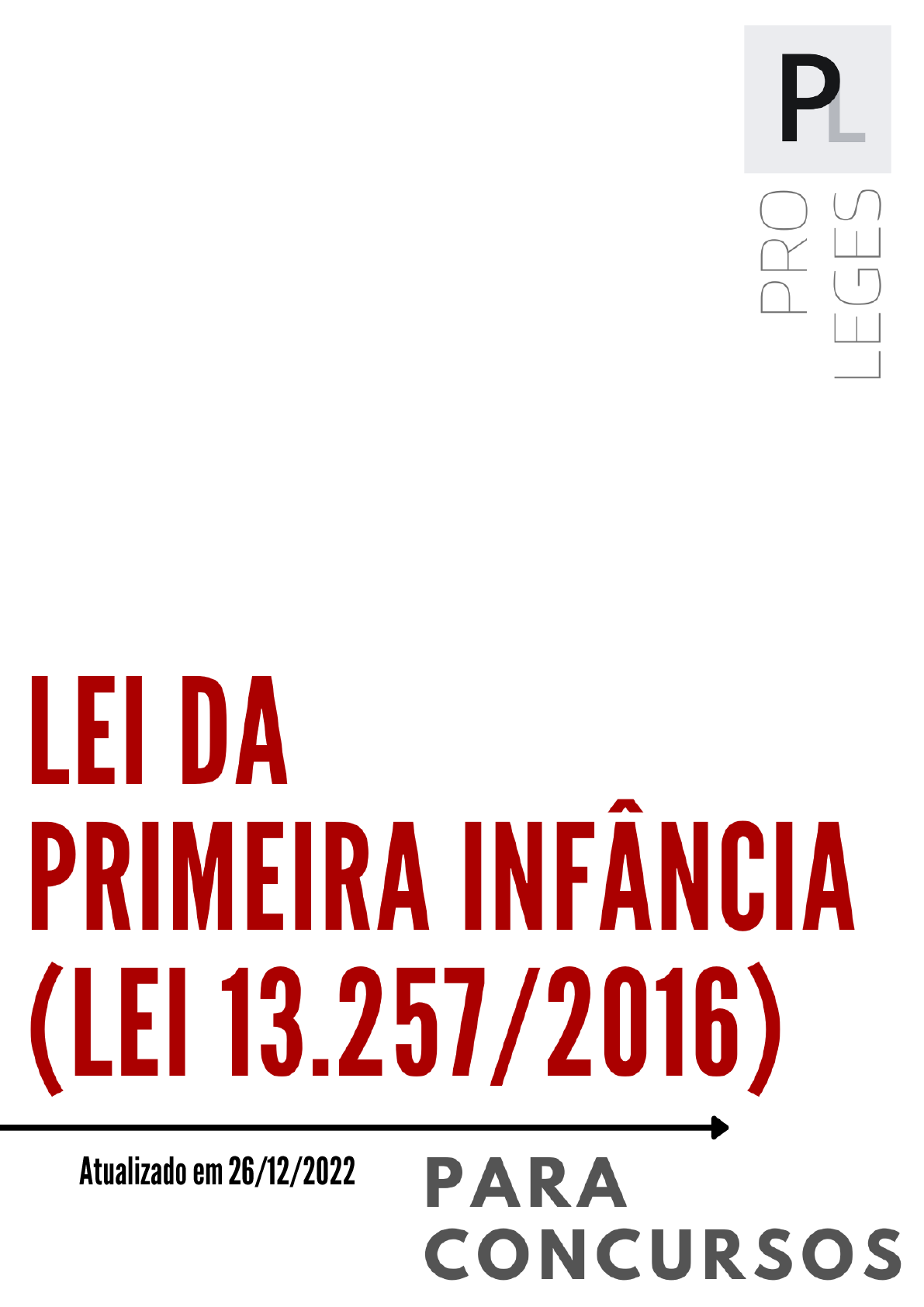 Pág. 1 de 10 www.proleges.com.br SUMÁRIO DIREITO DA CRIANÇA E DO ADOLESCENTE ................................................................................................................................. 2 LEI DA PRIMEIRA INFÂNCIA: LEI 13.257/2016 ........................................................................................................................................................ 2 Legenda dos grifos: AMARELO – DESTAQUE VERDE – EXCEÇÃO, VEDADO ou ALGUMA ESPECIFICIDADE AZUL – GÊNERO, PALAVRA-CHAVE ou EXPRESSÃO LARANJA – SUJEITOS, PESSOAS OU ENTES CINZA – MEUS COMENTÁRIOS DENTRO DO ARTIGO Para saber se o material foi atualizado, clique aqui e confira a data da capa (se for posterior a 26/12/2022, houve alteração no conteúdo): Link: https://drive.google.com/file/d/1tPFzaCgdIRLlBc30gbf5N_UoNdTU88rT/view?usp=sharing https://drive.google.com/file/d/1tPFzaCgdIRLlBc30gbf5N_UoNdTU88rT/view?usp=sharing Pág. 2 de 10 www.proleges.com.br DIREITO DA CRIANÇA E DO ADOLESCENTE LEI DA PRIMEIRA INFÂNCIA: LEI 13.257/2016 QConcursos (questões de concurso): https://bit.ly/3YMewxY. Comentários do Dizer o Direito ➔ Comentários à Lei 13.257/2016 (Lei da Primeira Infância, Marco Legal da Primeira Infância ou Estatuto da Primeira Infância). Disponível em: https://bit.ly/3hVKJON. Art. 1º Esta Lei estabelece princípios e diretrizes para a formulação e a implementação de políticas públicas para a primeira infância em atenção à especificidade e à relevância dos primeiros anos de vida no desenvolvimento infantil e no desenvolvimento do ser humano, em consonância com os princípios e diretrizes da Lei nº 8.069, de 13 de julho de 1990 (Estatuto da Criança e do Adolescente); altera a Lei nº 8.069, de 13 de julho de 1990 (Estatuto da Criança e do Adolescente); altera os arts. 6º, 185, 304 e 318 do Decreto-Lei nº 3.689, de 3 de outubro de 1941 (Código de Processo Penal) ; acrescenta incisos ao art. 473 da Consolidação das Leis do Trabalho (CLT), aprovada pelo Decreto-Lei nº 5.452, de 1º de maio de 1943 ; altera os arts. 1º, 3º, 4º e 5º da Lei nº 11.770, de 9 de setembro de 2008 ; e acrescenta parágrafos ao art. 5º da Lei nº 12.662, de 5 de junho de 2012. Art. 2º Para os efeitos desta Lei, considera-se primeira infância o período que abrange os primeiros 6 (seis) anos completos ou 72 (setenta e dois) meses de vida da criança. Questão (Promotor MPEAP 2021 Cespe correta) Para efeitos do Estatuto da Primeira Infância (Lei n.º 13.257/2016), considera-se primeira infância o perí- odo que abrange os primeiros seis anos completos ou setenta e dois meses de vida da criança. (Promotor MPESC 2019 Consulplan correta) Para os efeitos da Lei n. 13.257/2016 (Marco Legal da Pri- meira Infância), considera-se primeira infância o pe- ríodo que abrange os primeiros 6 (seis) anos comple- tos ou 72 (setenta e dois) meses de vida da criança. Art. 3º A prioridade absoluta em assegurar os direitos da criança, do adolescente e do jovem, nos termos do art. 227 da Constituição Federal e do art. 4º da Lei nº 8.069, de 13 de julho de 1990 , implica o dever do Estado de estabelecer políticas, planos, programas e serviços para a primeira infância que atendam às especificidades dessa faixa etária, visando a garantir seu desenvolvimento integral. Art. 4º As políticas públicas voltadas ao atendimento dos direitos da criança na primeira infância serão elaboradas e executadas de forma a: I - atender ao interesse superior da criança e à sua condição de sujeito de direitos e de cidadã; II - incluir a participação da criança na definição das ações que lhe digam respeito, em conformidade com suas características etárias e de desenvolvimento; III - respeitar a individualidade e os ritmos de desenvolvimento das crianças e valorizar a diversidade da infância brasileira, assim como as diferenças entre as crianças em seus contextos sociais e culturais; IV - reduzir as desigualdades no acesso aos bens e serviços que atendam aos direitos da criança na primeira infância, priorizando o investimento público na promoção da justiça social, da equidade e da inclusão sem discriminação da criança; V - articular as dimensões ética, humanista e política da criança cidadã com as evidências científicas e a prática profissional no atendimento da primeira infância; VI - adotar abordagem participativa, envolvendo a sociedade, por meio de suas organizações representativas, os profissionais, os pais e as crianças, no aprimoramento da qualidade das ações e na garantia da oferta dos serviços; VII - articular as ações setoriais com vistas ao atendimento integral e integrado; VIII - descentralizar as ações entre os entes da Federação; IX - promover a formação da cultura de proteção e promoção da criança, com apoio dos meios de comunicação social. Parágrafo único. A participação da criança na formulação das políticas e das ações que lhe dizem respeito tem o objetivo de promover sua inclusão social como cidadã e dar-se-á de acordo com a especificidade de sua idade, devendo ser realizada por profissionais qualificados em processos de escuta adequados às diferentes formas de expressão infantil. Art. 5º Constituem áreas prioritárias para as políticas públicas para a primeira infância a saúde, a alimentação e a nutrição, a educação infantil, a convivência familiar e comunitária, a assistência social à família da criança, a cultura, o brincar e o lazer, o espaço e o meio ambiente, bem como a proteção contra toda forma de violência e de pressão consumista, a prevenção de acidentes e a adoção de medidas que evitem a exposição precoce à comunicação mercadológica. Questão (Defensor DPEMT 2022 FCC correta) O Marco Legal da Primeira Infância (Lei nº 13.257/2016) define como uma das áreas prioritárias para as políticas pú- blicas para a primeira infância a proteção cont