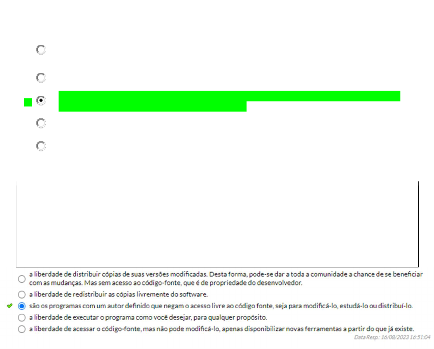(AVALIA/2023) Existem vários tipos de softwares no mercado, alguns são livres e outros proprietários. É correto afirmar que é uma característica do software proprietário: a liberdade de distribuir cópias de suas versões modificadas. Desta forma, pode-se dar a toda a comunidade a chance de se beneficiar com as mudanças. Mas sem acesso ao código-fonte, que é de propriedade do desenvolvedor. a liberdade de redistribuir as cópias livremente do software. são os programas com um autor definido que negam o acesso livre ao código fonte, seja para modificá-lo, estudá-lo ou distribuí-lo. a liberdade de executar o programa como você desejar, para qualquer propósito. a liberdade de acessar o código-fonte, mas não pode modificá-lo, apenas disponibilizar novas ferramentas a partir do que já existe. Data Resp.: 16/08/2023 16:51:04 Explicação: A resposta correta é "são os programas com um autor definido que negam o acesso livre ao código fonte, seja para modificá-lo, estudá-lo ou distribuí-lo." Isso é uma característica dos softwares proprietários, onde o código-fonte não é disponibilizado para que outras pessoas possam modificá-lo ou utilizá-lo. A propriedade intelectual é protegida e restrita ao autor ou a uma empresa.