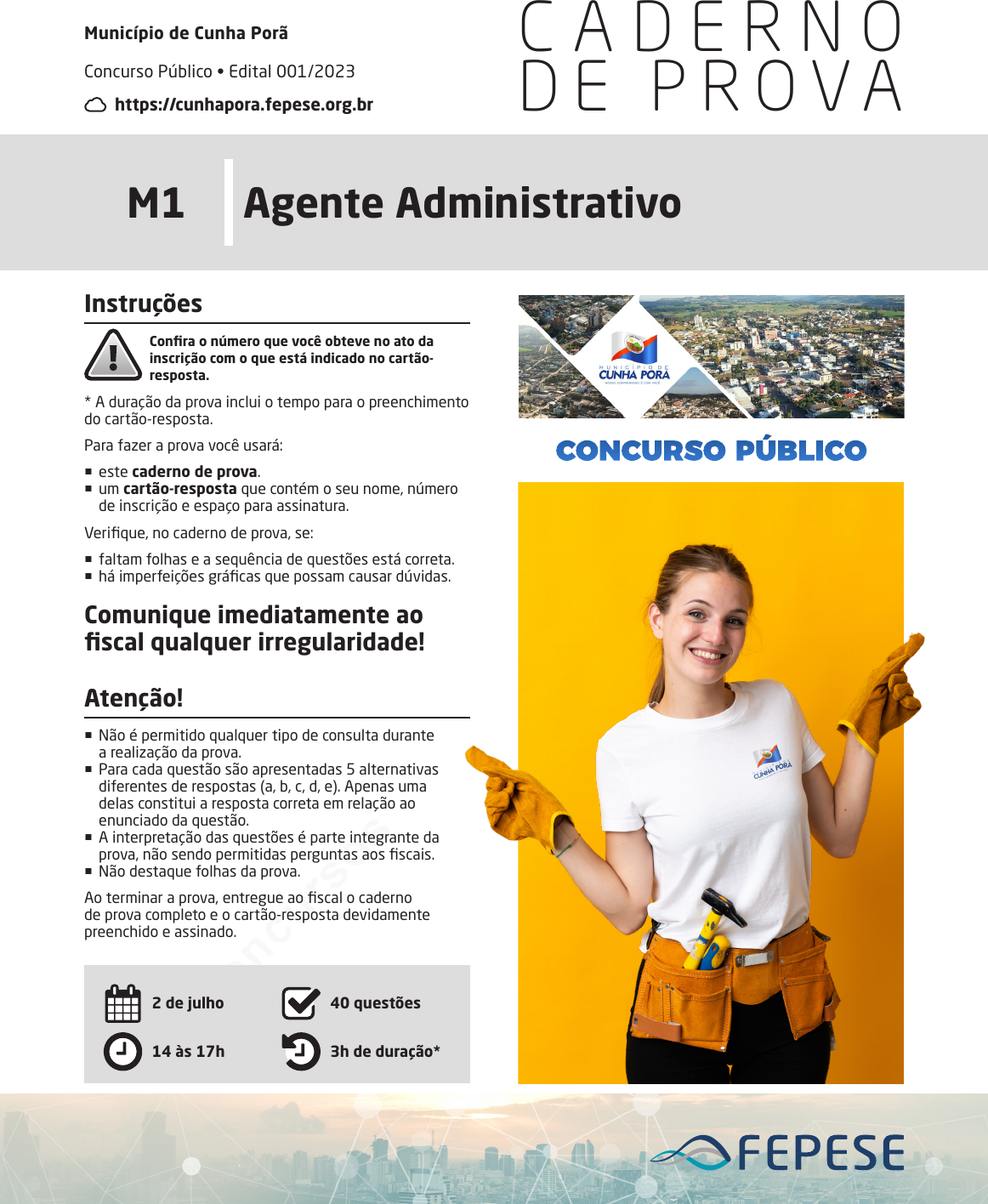 pcimarkpci MDAwMDowMDAwOjAwMDA6MDAwMDowMDAwOmZmZmY6Yzk0NzowNDUw:V2VkLCAxNiBBdWcgMjAyMyAxOTowNDo0MiAtMDMwMA== www.pciconcursos.com.br C A D E R N O D E P R O V A M1 Agente Administrativo Município de Cunha Porã Concurso Público • Edital 001/2023 https://cunhapora.fepese.org.br Instruções Confira o número que você obteve no ato da inscrição com o que está indicado no cartão-resposta. * A duração da prova inclui o tempo para o preenchimento do cartão-resposta. Para fazer a prova você usará: � este caderno de prova. � um cartão-resposta que contém o seu nome, número de inscrição e espaço para assinatura. Verifique, no caderno de prova, se: � faltam folhas e a sequência de questões está correta. � há imperfeições gráficas que possam causar dúvidas. Comunique imediatamente ao fiscal qualquer irregularidade! Atenção! � Não é permitido qualquer tipo de consulta durante a realização da prova. � Para cada questão são apresentadas 5 alternativas diferentes de respostas (a, b, c, d, e). Apenas uma delas constitui a resposta correta em relação ao enunciado da questão. � A interpretação das questões é parte integrante da prova, não sendo permitidas perguntas aos fiscais. � Não destaque folhas da prova. Ao terminar a prova, entregue ao fiscal o caderno de prova completo e o cartão-resposta devidamente preenchido e assinado. 2 de julho 14 às 17h 40 questões 3h de duração* pcimarkpci MDAwMDowMDAwOjAwMDA6MDAwMDowMDAwOmZmZmY6Yzk0NzowNDUw:V2VkLCAxNiBBdWcgMjAyMyAxOTowNDo0MiAtMDMwMA== www.pciconcursos.com.br . pcimarkpci MDAwMDowMDAwOjAwMDA6MDAwMDowMDAwOmZmZmY6Yzk0NzowNDUw:V2VkLCAxNiBBdWcgMjAyMyAxOTowNDo0MiAtMDMwMA== www.pciconcursos.com.br Página 3 Município de Cunha Porã Concurso Público • Edital 001/2023 M1 Agente Administrativo 1. Identifique abaixo as afirmativas verdadeiras ( V ) e as falsas ( F ) de acordo com o texto. ( ) A pesquisa mencionada no texto foi realizada pela GEM em 2023. ( ) De acordo com o texto, o desejo de viajar pelo país precede o desejo de empreender. ( ) Segundo a pesquisa, na Índia há um maior número de potenciais empreendedores do que no restante do mundo. Assinale a alternativa que indica a sequência correta, de cima para baixo. a. SQUARE V • V • F b. Check-square F • V • V c. SQUARE V • F • V d. SQUARE F • V • F e. SQUARE V • F • F 2. Identifique abaixo as frases que apresentam pala- vras ou expressões de sentido figurado. 1. Minha irmã tem um sorriso iluminado. 2. Paula estava enamorada! 3. Queria que você quebrasse um galho para mim no trabalho. 4. Minha Mãe ficou uma fera quando viu bagunça pela casa toda. Assinale a alternativa que indica todas as afirmativas corretas. a. SQUARE É correta apenas a afirmativa 3. b. SQUARE São corretas apenas as afirmativas 1 e 3. c. SQUARE São corretas apenas as afirmativas 2 e 4. d. Check-square São corretas apenas as afirmativas 1, 3 e 4. e. SQUARE São corretas apenas as afirmativas 2, 3 e 4. 3. Complete as lacunas da frase abaixo de acordo com a norma-padrão. muito tempo Helena não ia casa de sua avó. Quando lá chegou oito horas da noite, ficou frente frente com seu passado, feliz por haver retornado que foi sua pri- meira casa. Assinale a alternativa que completa correta e sequen- cialmente as lacunas do texto. a. SQUARE À • a • as • a • aquela b. SQUARE À • à • as • a • aquela c. SQUARE A • à • às • à • aquela d. SQUARE Há • a • as • à • àquela e. Check-square Há • à • às • a • àquela Língua Portuguesa 5 questões Leia atentamente o texto abaixo. Empreender é o segundo maior sonho do brasileiro A vontade de ter o próprio negócio voltou a ser o segundo maior sonho do brasileiro. De acordo com a Global Entrepreneurship Monitor (GEM), a cada 10 pes- soas, 6 querem empreender no nosso país. Os núme- ros foram divulgados pelo Sebrae, que pontuou que o investimento em políticas públicas é essencial para impulsionar o empreendedorismo no país. A pesquisa foi feita entre junho e agosto do ano passado, com 2 mil pessoas entre 18 e 64 anos. Dos entrevistados, 60% citaram ter uma empresa como um dos seus maiores desejos. Em primeiro lugar, ficou a vontade de viajar pelo país, com 61%. Ao comparar com o resultado de 2021, houve um cres- cimento de 14 pontos percentuais – naquele ano, 46% das pessoas manifestaram o desejo de empreender. Entre os motivos está a escassez de empregos (82%), a construção de riqueza (64%) e a continuidade de uma tradição familiar (44%). Além disso, a pesquisa apontou que 67% da popula- ção brasileira está envolvida em empreendedorismo, o que corresponderia a 93 milhões de brasileiros. Des- ses, 42 milhões já são empreendedores – ou seja, já têm um negócio –, enquanto que 51 milhões seriam potenciais empreendedores – aqueles que não têm um empreendimento, mas que gostariam de ter um em até 3 anos. Este último número estabelece o Brasil como a segunda maior população absoluta de potenciais empreendedo- res no mundo, ficando atrás apenas da Índia. AMORIM, Luana. Revista nscDC: Santa Catarina, ano38, n 12.207, Maio, adaptado. pcimarkpci MDAwMDowMDAwOjAwMDA6MDAwMDowMDAwOmZmZmY6Yzk0NzowNDUw:V2VkLCAxNiBBdWcgMjAyMyAxOTowNDo0MiAtMDMwMA== www.pciconcursos.com.br Página 4 Município de Cunha Porã Concurso Público • Edital 001/2023 M1 Agente Administrativo 4. Analise as orações a seguir, quanto à concordân- cia e assinale a alternativa correta de acordo com a norma-padrão. a. Check-square Faz mais de dois meses que eu estive lá. b. SQUARE Alexandra anda meia preocupada nestes últi- mos dias. c. SQUARE Ao sair, feliz com o presente, ele gritou: - Muito obrigada! d. SQUARE Os Estados Unidos nunca viu uma guerra como aquela. e. SQUARE Mais de um dos convidados se entreolhou com espanto. 5. Analise as frases abaixo quanto ao uso dos prono- mes segundo a norma-padrão. 1. Quando sentiu-se enganado, foi embora dali im
