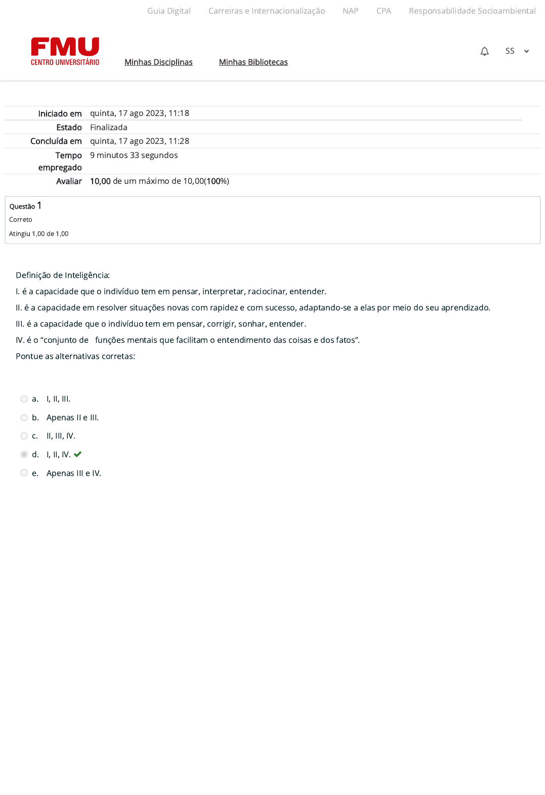 17/08/2023, 11:29 Atividade 2 (A2): Revisão da tentativa https://ambienteacademico.com.br/mod/quiz/review.php?attempt=2746678&cmid=1072656 1/6 Iniciado em quinta, 17 ago 2023, 11:18 Estado Finalizada Concluída em quinta, 17 ago 2023, 11:28 Tempo empregado 9 minutos 33 segundos Avaliar 10,00 de um máximo de 10,00(100%) Questão 1 Correto Atingiu 1,00 de 1,00 De�nição de Inteligência: I. é a capacidade que o indivíduo tem em pensar, interpretar, raciocinar, entender. II. é a capacidade em resolver situações novas com rapidez e com sucesso, adaptando-se a elas por meio do seu aprendizado. III. é a capacidade que o indivíduo tem em pensar, corrigir, sonhar, entender. IV. é o “conjunto de funções mentais que facilitam o entendimento das coisas e dos fatos”. Pontue as alternativas corretas: a. I, II, III. b. Apenas II e III. c. II, III, IV. d. I, II, IV. e. Apenas III e IV. Guia Digital Carreiras e Internacionalização NAP CPA Responsabilidade Socioambiental Minhas Disciplinas Minhas Bibliotecas SS https://codely-fmu-content.s3.amazonaws.com/Moodle/GuiaDigital/Guia+digital/index.html https://carreiras.fmu.br/ https://codely-fmu-content.s3.amazonaws.com/Moodle/NAP/inicial/nap/fmu/index.html https://codely-fmu-content.s3.amazonaws.com/Moodle/CPA/landing_CPA/index.html https://portal.fmu.br/sustentabilidade https://ambienteacademico.com.br/ https://ambienteacademico.com.br/ https://ambienteacademico.com.br/course/view.php?id=236 17/08/2023, 11:29 Atividade 2 (A2): Revisão da tentativa https://ambienteacademico.com.br/mod/quiz/review.php?attempt=2746678&cmid=1072656 2/6 Questão 2 Correto Atingiu 1,00 de 1,00 Questão 3 Correto Atingiu 1,00 de 1,00 Para ajudar na re�exão sobre o motivo de “sermos o que somos”, Soto (2005) referencia três grandes fatores: I. genético II. ambiente III. situacional IV. comportamental V. organizacional Sinalize as alternativas que são verdadeiras e falsas: a. F,F,V,V,F. b. V,V,V,F,F. c. V,F,V,F,V. d. F,V,F,V,F. e. F,F,F,F,F. De�nição de Grau de Assertividade: I. varia conforme a situação em que a pessoa estiver envolvida. Pode ser alto ou baixo. II. ter um baixo grau, não signi�ca que a pessoa é passiva, mas sim que, dependendo da situação, pode agir com um comportamento passivo (abrindo mão de seus direitos), ou mesmo agressivo, sendo in�exível e rígido. III. quanto existe alto grau de assertividade, o indivíduo procura não se deixar levar pela pressão da situação. IV. pensa antes de falar, procura a melhor opção, tem um controle emocional mais re�nado, sabe escutar e ouvir e sabe ser �exível quando necessário. a. I, II, III. b. Todas são corretas. c. I, IV, V. d. III, IV, IV. e. II, III, IV. Guia Digital Carreiras e Internacionalização NAP CPA Responsabilidade Socioambiental Minhas Disciplinas Minhas Bibliotecas SS https://codely-fmu-content.s3.amazonaws.com/Moodle/GuiaDigital/Guia+digital/index.html https://carreiras.fmu.br/ https://codely-fmu-content.s3.amazonaws.com/Moodle/NAP/inicial/nap/fmu/index.html https://codely-fmu-content.s3.amazonaws.com/Moodle/CPA/landing_CPA/index.html https://portal.fmu.br/sustentabilidade https://ambienteacademico.com.br/ https://ambienteacademico.com.br/ https://ambienteacademico.com.br/course/view.php?id=236 17/08/2023, 11:29 Atividade 2 (A2): Revisão da tentativa https://ambienteacademico.com.br/mod/quiz/review.php?attempt=2746678&cmid=1072656 3/6 Questão 4 Correto Atingiu 1,00 de 1,00 Questão 5 Correto Atingiu 1,00 de 1,00 Segundo Goleman (2007), estudiosos do tema apontam habilidades a serem consideradas na Inteligência Social. Sobre a de�nição de Comunicação verbal e não verbal: a. Saber dar e receber feedback é uma arte. Um feedback deve ser transmitido de forma assertiva e em um processo que envolve relações de con�ança mútua. O líder que domina a arte de dar, receber e agir com base nos feedbacks, sem dúvida tem a I.S. mais evoluída. b. essa habilidade é tão importante que destacamos ela em um tópico especí�co neste capítulo. É um comportamento objetivo, franco, honesto e direto, tanto na postura quanto nas ações, que é percebido facilmente pelas pessoas. c. essas habilidades, ligadas à apresentação pessoal proposta por Goleman(2007), são fundamentais para estabelecer o relacionamento. Dominar as emoções e a expressão corporal correspondente ao que se sente é uma forma de domínio pessoal, e que será como as pessoas serão percebidas. d. é a forma em que a pessoa se apresenta, de forma a causar a impressão que deseja. O carisma é parte integrante de uma autoapresentação e�caz, haja vista que atua como um agente transmissor de emoção, e seu público o receptor, gerando a sincronicidade. e. conforme já mencionamos ao falar sobre emoções e I.E., a empatia é uma qualidade em saber entender o sentimentos e emoções do outro, mas não “sofrer” com o outro ou pelo outro. É com base nesse entendimento que ações assertivas poderão ser realizadas, com ética e buscando a justiça. De�nição de comportamento passivo: I. comportamento em que a pessoa abre mão de seus desejos em favor do desejo de outros. II. indivíduos direcionados por outras pessoas. III. demonstram carência de liberdade de escolhas. IV. como demonstram pouca iniciativa, geralmente dizem “sim” para quem lhe pede algo e, consequentemente, “não” para si mesmo. V. essa dicotomia gera um con�ito interno, o qual pode levar para a infelicidade. Sinalize a alternativa verdadeira: a. Apenas I e V. b. Apenas II e IV. c. Todas são verdadeiras. d. Apenas III. e. Apenas IV e V. Guia Digital Carreiras e Internacionalização NAP CPA Responsabilidade Socioambiental Minhas Disciplinas Minhas Bibliotecas SS https://codely-fmu-content.s3.amazonaws.com/Moodle/GuiaDigital/Guia+digital/index.html https://carreiras.fmu.br/ https://codely-fmu-content.s3.amazonaws.com/Moodle/NAP/inicial/nap/fmu/index.html https://codely-fmu-content.s3.amazonaws.c