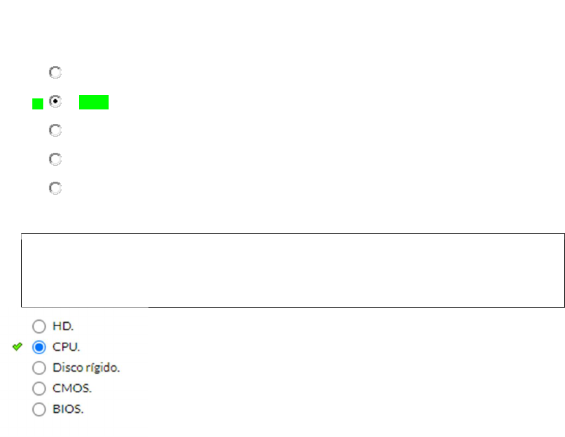 (OBJETIVA/2022 - Adaptada) O componente do hardware, considerado o "cérebro" do computador, responsável pela execução de instruções programadas e procedimentos fornecidos pelos usuários, é chamado: HD. CPU. Disco rígido. CMOS. BIOS. Data Resp.: 17/08/2023 12:38:15 Explicação: CPU também chamada de processador, é uma espécie de cérebro. É a CPU quem, de fato, processa instruções.