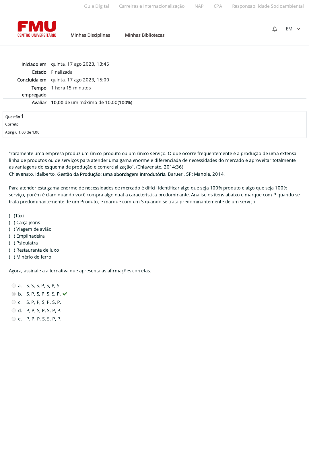17/08/2023 15:00 Atividade 2 (A2): Revisão da tentativa https://ambienteacademico.com.br/mod/quiz/review.php?attempt=2747087&cmid=1071795 1/8 Iniciado em quinta, 17 ago 2023, 13:45 Estado Finalizada Concluída em quinta, 17 ago 2023, 15:00 Tempo empregado 1 hora 15 minutos Avaliar 10,00 de um máximo de 10,00(100%) Questão 1 Correto Atingiu 1,00 de 1,00 "raramente uma empresa produz um único produto ou um único serviço. O que ocorre frequentemente é a produção de uma extensa linha de produtos ou de serviços para atender uma gama enorme e diferenciada de necessidades do mercado e aproveitar totalmente as vantagens do esquema de produção e comercialização". (Chiavenato, 2014:36) Chiavenato, Idalberto. Gestão da Produção: uma abordagem introdutória. Barueri, SP: Manole, 2014. Para atender esta gama enorme de necessidades de mercado é difícil identi�car algo que seja 100% produto e algo que seja 100% serviço, porém é claro quando você compra algo qual a característica predominante. Analise os itens abaixo e marque com P quando se trata predominantemente de um Produto, e marque com um S quando se trata predominantemente de um serviço. ( )Táxi ( ) Calça jeans ( ) Viagem de avião ( ) Empilhadeira ( ) Psiquiatra ( ) Restaurante de luxo ( ) Minério de ferro Agora, assinale a alternativa que apresenta as a�rmações corretas. a. S, S, S, P, S, P, S. b. S, P, S, P, S, S, P. c. S, P, P, S, P, S, P. d. P, P, S, P, S, P, P. e. P, P, P, S, S, P, P. Guia Digital Carreiras e Internacionalização NAP CPA Responsabilidade Socioambiental Minhas Disciplinas Minhas Bibliotecas EM https://codely-fmu-content.s3.amazonaws.com/Moodle/GuiaDigital/Guia+digital/index.html https://carreiras.fmu.br/ https://codely-fmu-content.s3.amazonaws.com/Moodle/NAP/inicial/nap/fmu/index.html https://codely-fmu-content.s3.amazonaws.com/Moodle/CPA/landing_CPA/index.html https://portal.fmu.br/sustentabilidade https://ambienteacademico.com.br/ https://ambienteacademico.com.br/ https://ambienteacademico.com.br/course/view.php?id=236 17/08/2023 15:00 Atividade 2 (A2): Revisão da tentativa https://ambienteacademico.com.br/mod/quiz/review.php?attempt=2747087&cmid=1071795 2/8 Questão 2 Correto Atingiu 1,00 de 1,00 “A posição de um processo em um espectro volume-variedade molda seu projeto global e a abordagem geral para gerenciar suas atividades. Essas “abordagens gerais” para projetar e gerenciar processos são denominadas tipos de processo. Diferentes termos são usados para identificar os tipos de processo, dependendo de serem predominantemente processos de produção ou de serviço, e há alguma variação nos termos usados. Por exemplo, não é incomum encontrar termos de “manufatura” usados em setores de serviço” Slack, Brandon-Jones e Johnston (2018:207) Figura: tipos diferentes de processo implicam características diferentes de volume-variedade para o processo Slack, Brandon-Jones e Johnston (2018:207) Slack, Nigel, Alistair Brandon-Jones, e Robert Johnston. Administração da produção. São Paulo: Atlas, 2018. Com base no seu conhecimento, relacione os diferentes tipos de operações (processos) listados abaixo com o bens e serviços a seguir. (1) Processos de Projeto (2) Processos de Tarefa (jobbing) (3) Processos de Lote (4) Processos em massa (5) Processos contínuos (6) Serviços profissionais (7) Lojas de serviços (8) Serviços de massa ( )Peças de carros ( ) Produção de móveis customizados ( ) Locadora de automóveis ( ) Desenvolvimento de software ( ) Atendimento de call-center ( ) Geladeira ( ) Gasolina ( ) Cirurgia plástica Selecione a alternativa com a sequência correta a. . 4; 2; 6; 1; 8; 3; 5; 7 b. . 3; 2; 7; 1; 8; 4; 5; 6 c. . 3; 2; 7; 8; 1; 4; 5; 6 d. . 4; 1; 6; 2; 7; 5; 3; 8 e. . 2; 3; 1; 7; 4; 8; 6; 5 Guia Digital Carreiras e Internacionalização NAP CPA Responsabilidade Socioambiental Minhas Disciplinas Minhas Bibliotecas EM https://codely-fmu-content.s3.amazonaws.com/Moodle/GuiaDigital/Guia+digital/index.html https://carreiras.fmu.br/ https://codely-fmu-content.s3.amazonaws.com/Moodle/NAP/inicial/nap/fmu/index.html https://codely-fmu-content.s3.amazonaws.com/Moodle/CPA/landing_CPA/index.html https://portal.fmu.br/sustentabilidade https://ambienteacademico.com.br/ https://ambienteacademico.com.br/ https://ambienteacademico.com.br/course/view.php?id=236 17/08/2023 15:00 Atividade 2 (A2): Revisão da tentativa https://ambienteacademico.com.br/mod/quiz/review.php?attempt=2747087&cmid=1071795 3/8 Questão 3 Correto Atingiu 1,00 de 1,00 Questão 4 Correto Atingiu 1,00 de 1,00 O tipo de operação da produção indica a maneira que a empresa organiza seus processos e realiza suas operações de produção adotando um interdependência lógica entre todas as etapas do processo produtivo. A classificação dos tipos de operação auxilia o entendimento do impacto desta decisão nas saídas do processo produtivo. Com base no seu conhecimento, relacione os diferentes tipos de operações (processos) listados abaixo com as suas características a seguir. (1) Processos de Projeto (2) Processos de Tarefa (jobbing) (3) Processos de Lote (4) Processos em massa (5) Processos contínuos ( ) apesar da alta variedade e baixo volume, os produtos compartilham recursos, que são processados em série ( ) utilizado por empresas que produzem apenas depois de recebido pedido ou encomenda. São caracterizados por baixos volumes e alta customização e contato com cliente ( ) são caracterizados uso de capital intensivo e fluxo rígido, produzindo com alto volume e pouca variedade ( ) tem como característica um alvo volume e pouca variedade, com processos repetitivos ( ) com grau de variedade e volume médio, permite um flexibilidade produtiva, sendo utilizado por um infinidade de indústrias Selecione a alternativa com a sequência correta a. . 5; 3; 1; 2; 4 b. . 5; 3; 4; 1; 2 c. . 1; 2; 5; 3; 4 d. . 2; 1; 5; 4; 3 e. . 4; 2; 5; 1; 5 “apuramos que melhorar o desempenho de um 