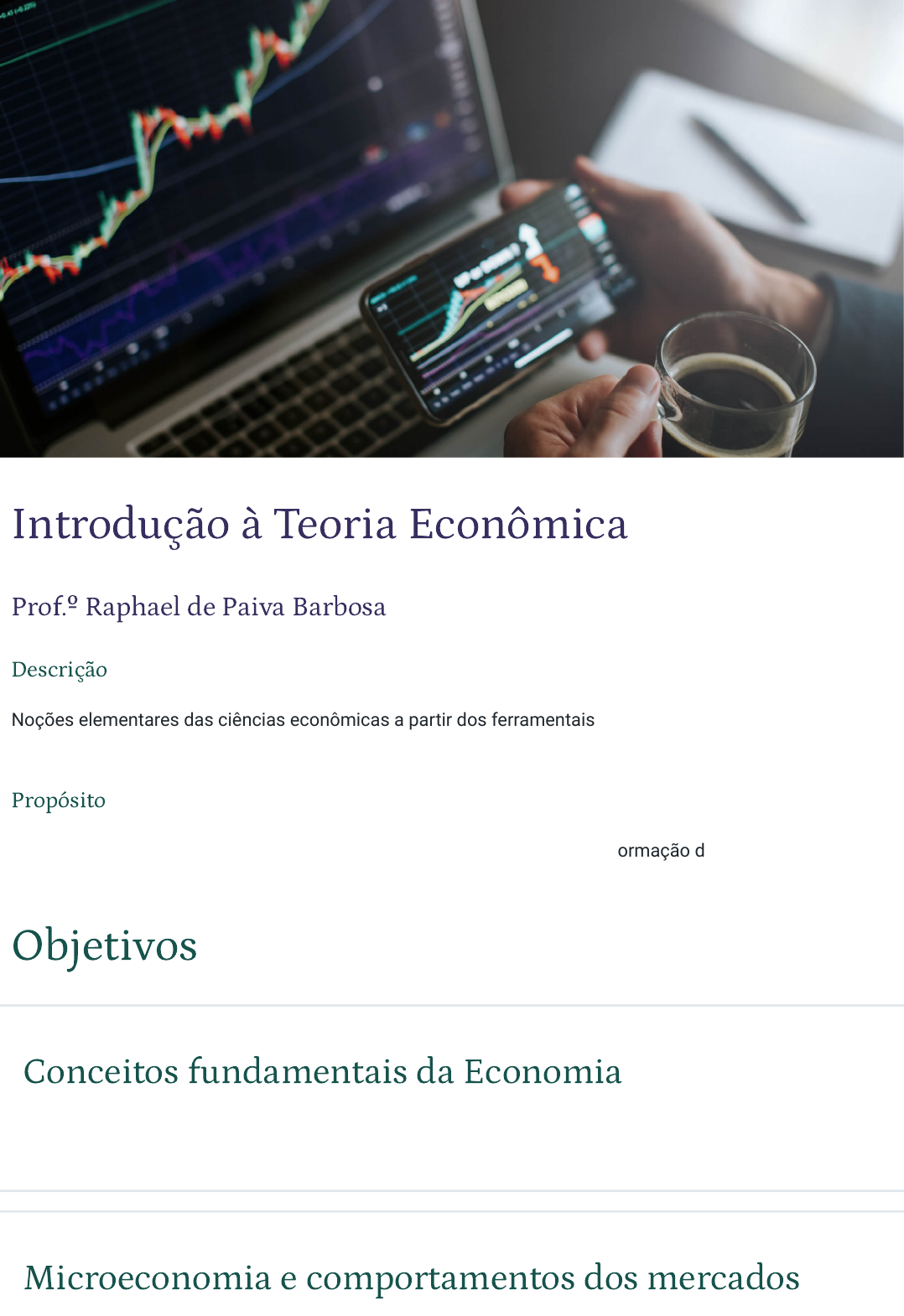 Introdução à Teoria Econômica Prof.º Raphael de Paiva Barbosa Descrição Noções elementares das ciências econômicas a partir dos ferramentais da Microeconomia, da Macroeconomia e do desenvolvimento econômico. Propósito Apresentar o funcionamento das firmas, a composição dos mercados e a formação dos grandes agregados econômicos, além dos reflexos dessas variáveis no cotidiano das organizações. Objetivos Módulo 1 Conceitos fundamentais da Economia Reconhecer os conceitos fundamentais da Economia. Módulo 2 Microeconomia e comportamentos dos mercados Identificar os ferramentais básicos da Microeconomia na compreensão do comportamento de mercados distintos. Módulo 3 Agregados macroeconômicos Reconhecer os principais agregados macroeconômicos. Introdução Certamente em algum momento de sua vida você já se deparou com alguns dos questionamentos da próxima imagem. Todos esses questionamentos se referem ao campo de estudos da Economia, que estuda o funcionamento das atividades econômicas da sociedade global. Para compreender essa área de conhecimento, é necessário conhecer os conceitos fundamentais da Economia, os ferramentais básicos da Microeconomia e os principais agregados macroeconômicos. 1 - Conceitos fundamentais da Economia Ao �nal deste módulo, você será capaz de reconhecer os conceitos fundamentais da Economia. Conceitos fundamentais O estudo introdutório da Economia tem o intuito de estimular a busca por respostas para os principais problemas econômicos, demonstrar as principais teorias e correntes econômicas e sua aplicabilidade em questões práticas na vida dos indivíduos e no funcionamento das organizações. Mas você sabe quando a economia moderna surgiu? De acordo com Pinho e Vasconcellos (2017), o marco inicial da economia moderna surgiu entre os séculos XVIII e XIX. Nessa época, foram fundamentados diversos princípios econômicos, desenvolvidos a partir de três tipos de concepções. Veja a seguir: Pinho e Vasconcellos Diva Benevides Pinho é doutora em Economia pela Faculdade de Economia pela FEA-US. Marco Antonio Sandoval de Vasconcellos doutor em Economia pela Faculdade de Economia, Administração e Contabilidade da Universidade de São Paulo (FEA/USP). Mecanicista Os economistas desse grupo explicavam as leis econômicas de maneira similar ao comportamento da Física, empregando, inclusive, a mesma terminologia (estática, dinâmica, elasticidade, fluidez etc.). Organicista Os economistas desse grupo afirmavam que as leis econômicas se comportavam como um órgão vivo e usavam a mesma terminologia da Biologia (órgãos, funções, circulação, fluxos). Humanista Para os economistas desse grupo, a Economia é uma ciência social e reflete as atitudes do ser humano, cheias de aspectos psicológicos, e a preocupação em fixar relações de causa e efeito entre os fenômenos sociais. Como pudemos ver nas três concepções, a Economia possui uma forte inter-relação com outras ciências — Matemática, Estatística, Política, História, Geografia e Sociologia —, embora tenha o seu núcleo de estudo muito bem delimitado. Essa particularidade possibilita ao estudante interagir com vários outros domínios do conhecimento científico, empregando o seu ferramental teórico visto na Economia para avaliar de forma sistemática o comportamento humano em sociedade. Diante de tantas concepções, como podemos de�nir a Economia? Segundo Samuelson e Nordhaus (2004): A Economia pode ser definida como a ciência que estuda a forma como as sociedades utilizam os recursos escassos para produzir bens com valor e de como os distribuem entre os vários indivíduos. Observe que, nessa definição, estão presentes três conceitos fundamentais: amuelson e Nordhaus Paul Anthony Samuelson se formou em Economia, em Chicago e é autor do livro A Teoria Geral do Emprego, do Juro e da Moeda, por meio do qual revolucionou o pensamento econômico. William D. Nordhaus é professor na Universidade de Yale e é o criador do modelo de avaliação integrado, modelo quantitativo que descreve a interação global entre a economia e o clima. Escassez Representa o objeto da economia e consiste em uma restrição física, afinal, temos meios de produção e recursos insuficientes para atender aos desejos e necessidades de todos os seres humanos. E�ciência Está relacionada à combinação ótima dos insumos produtivos (trabalho, capital e terra) para obter a máxima produção e ao uso racional dos meios disponíveis para alcançar um objetivo previamente determinado. Equidade É a distribuição justa da prosperidade econômica entre os membros da sociedade. A desigualdade de renda é consequência de uma baixa equidade. Atualmente, podemos perceber que a equidade talvez seja o grande desafio de ser colocado em prática de forma ampla. Alguns economistas, para explicar a situação da desigualdade de renda, afirmam ser preciso esperar o bolo crescer para depois distribuir, pois não se pode distribuir o que não foi produzido. Mas o que isso signi�ca? Vamos utilizar os três conceitos mencionados para fundamentar a explicação. Para muitos economistas, a relação entre eficiência e equidade no sistema econômico representa um trade-off, situação em que há um conflito de escolha. Nesse caso, para se ter uma distribuição mais justa da renda entre os agentes econômicos, é necessário abrir mão de uma parcela da eficiência produtiva. Sobre esse conflito de escolha, leia o poema Ou isto ou aquilo de Cecília Meireles: Cecília Meireles Nasceu no Rio de Janeiro no dia 7 de novembro de 1901. Foi poetisa, professora, jornalista e pintora brasileira. É considerada a primeira voz feminina de grande expressão na literatura brasileira, com mais de 50 obras publicadas. Ou se tem chuva e não se tem sol, ou se tem sol e não se tem chuva! Ou se calça a luva e não se põe o anel, ou se põe o anel e não se calça a luva! Quem sobe nos ares não