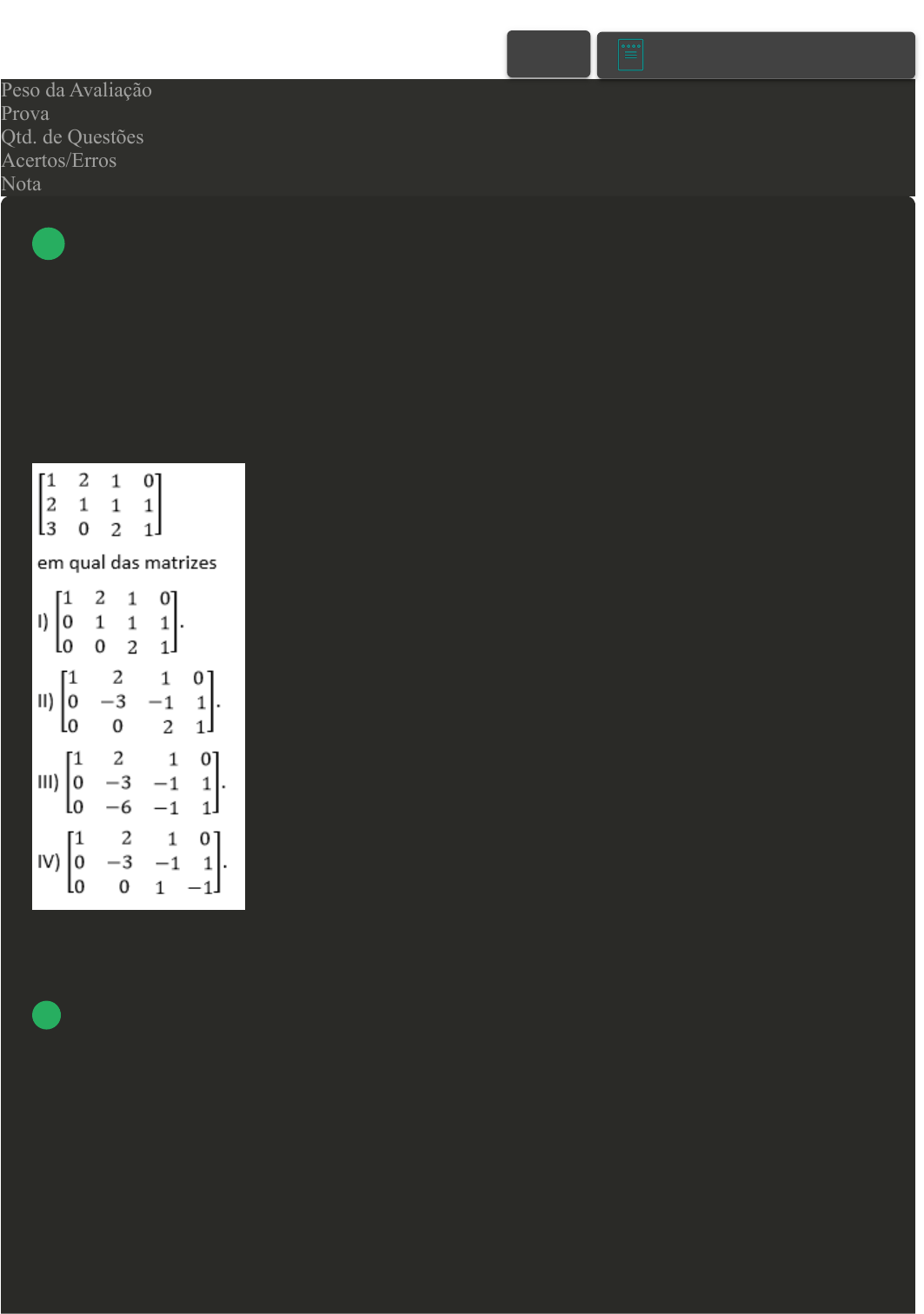 Prova Impressa GABARITO | Avaliação I - Individual (Cod.:823211) Peso da Avaliação 1,50 Prova 60146024 Qtd. de Questões 10 Acertos/Erros 10/0 Nota 10,00 O método de Gauss é um método que transforma a matriz estendida em uma matriz triangular superior, através de operações elementares (pivotamentos), que consistem em trocar uma linha pela linha mais uma constante vezes outra linha. Usando o método de Gauss, transformamos a matriz estendida em uma outra matriz. Com base na matriz apresentada, e em qual matriz ela pode ser transformada, analise as opções a seguir: Assinale a alternativa CORRETA: A Somente a opção IV está correta. B Somente a opção III está correta. C Somente a opção I está correta. VOLTAR A+ Alterar modo de visualização 1 D Somente a opção II está correta. Podemos resolver sistemas lineares através de vários métodos. Um desses métodos é a Regra de Cramer, porém este método só pode ser utilizado para resolver sistemas lineares que tenham o número de equações igual ao número de incógnitas, já que usa determinante no seu desenvolvimento. Considere o sistema linear a seguir: Assinale a alternativa CORRETA: A x = 3 B x = 1 C x = - 1 D x = - 2 Para que uma equação do segundo grau apresente como solução duas raízes reais e distintas, é necessário que o discriminante seja positivo. Dada a equação x² - 4x + 2k = 0, para quais valores de k a equação tem duas raízes reais e distintas? 2 3 Assinale a alternativa CORRETA: A k < 4 B k > 2 C k < 2 D k > 4 Uma equação linear é a combinação linear de várias incógnitas. Quando temos um conjunto de equações lineares dizemos que elas formam um sistema linear. Existem muitos métodos para resolver sistemas lineares, cada um com uma estratégia diferente de resolução. Sobre a relação entre os métodos diretos de resolução e a estratégia de resolução usada por eles, associe os itens, utilizando o código a seguir: I- Regra de Cramer. II- Método de Gauss. III- Método de Gauss - Jordam. IV- Fatoração LU. ( ) Através da decomposição da matriz A em outras duas matrizes, uma triangular inferior e outra triangular superior. ( ) Através de pivotamento, transformar a matriz A numa matriz diagonal, e obedecendo o pivotamento que transforma a matriz A transformar a matriz B. 4 ( ) Através de determinante, determina a solução dos sistemas lineares e, por isso, só pode ser usado em sistemas quadrados. ( ) Através de escalonamento, transforma a matriz estendida numa matriz triangular superior. Assinale a alternativa que apresenta a sequência CORRETA: A IV - II - III - I. B I - II - III - IV. C IV - III - I - II. D I - III - II - IV. Várias áreas da tecnologia necessitam informações onde o número de variáveis não é único. Por exemplo, num sistema de controle valorização de estoque de uma empresa, podemos lidar com preços de vários tipos de itens (muitas vezes vários). Uma das ferramentas existentes para lidar com este tipo de problema são os Sistemas Lineares. Então, sobre métodos de resolução de sistemas lineares, classifique V para as sentenças verdadeiras e F para as falsas: ( ) Os métodos iterativos nos fornecem a solução exata do sistema linear. ( ) O método de fatoração LU consiste em transformar o sistema original em dois sistemas de resolução mais simples. ( ) O método de Gauss consiste em reduzir o problema original em um equivalente, triangular. ( ) Os métodos diretos nos fornecem aproximações para a solução do sistema linear. Assinale a alternativa que apresenta a sequência CORRETA: A F - F - V - V. 5 B V - F - F - V. C V - V - F - F. D F - V - V - F. Mesmo um número decimal finito, quando escrito na forma binária, pode gerar uma dízima infinita. Quando uma operação dessa é feita na calculadora, ocorrerá um erro de arredondamento ou de truncamento dependendo de como a calculadora está programada. Sobre a representação do número decimal 2,12 na forma binária, assinale a alternativa CORRETA: A 10,000111... B 101,00110... C 0,0001111... D 0,1010101... O sistema de numeração de base dois é também conhecido como sistema de numeração binário, onde são utilizados os símbolos: zero (0) e um (1), que são traduzidos por: (1) "passa corrente", (0) "não passa corrente". Este sistema de numeração é utilizado principalmente em computadores, para se comunicarem, facilitando o trabalho de estocagem, organização e difusão de informações. Exemplo: nas caixas de discos magnéticos, vêm impressas informações referentes aos cuidados básicos e necessários a serem tomados, quanto ao manuseio e estocagem dos referidos discos. Efetuando a mudança de base do número 151 para a base dois: 6 7 Assinale a alternativa CORRETA: A Somente a opção II está correta. B Somente a opção IV está correta. C Somente a opção III está correta. D Somente a opção I está correta. A linguagem computacional é uma das principais aplicações dos números binários, como no conjunto dos números decimais podemos definir operações de soma, subtração, multiplicação e divisão no conjunto dos números binários. Lembre-se de que os números binários têm base 2, portanto dois algarismos 0 e 1 e, logo temos as seguintes igualdades: 8 Assinale a alternativa que apresenta a sequência CORRETA: A F - F - V - F. B V - F - F - F. C F - V - V - F. D F - V - V - V. Para que uma equação do segundo grau apresente como solução duas raízes reais e iguais, é necessário que o discriminante seja igual a zero. Dada a equação x² - 4x + k = 0, para qual valor de k a equação tem duas raízes reais e iguais? Assinale a alternativa CORRETA: A K = 16 B k = 4 C K = 8 D k = 2 Ao se tentar representar um fenômeno do mundo físico por meio de um modelo matemático, raramente se tem uma descrição correta desse fenômeno. Normalmente, são necessárias várias simplificações do mundo físico para que se tenha um modelo matemático com o