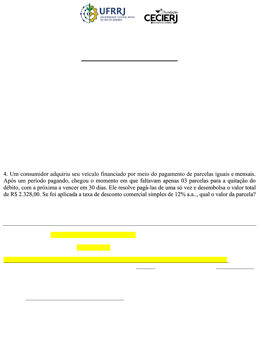 Bacharelado em administração - disciplina: matemática financeira para administração 2º sem 2023 Coordenador de disciplina: Prof. Rodrigo Carlos Marques Pereira Estudante: _____________________________________ Pólo: _________ Matrícula: _____________ ATIVIDADE A DISTÂNCIA 1 – AD1 1. Você, estudante dos cursos de graduação ofertados via Cederj, pretende destinar o valor único de R$ 1.000,00 das economias de seu salário/bolsa de estágio/“mesada” no dia 01/10/2023 numa aplicação financeira que atualmente rende 6% a.a. juros simples, para custear uma viagem de férias. Se seu desejo é resgatar a aplicação quatro meses depois, qual seria valor do rendimento? 2. Um investidor dispõe de R$ 30.000,00. Prevendo mais um pacote econômico do governo, no qual ocorreria o confisco de dinheiro em alguns setores ligados ao ganho de capital, resolve diminuir suas prováveis perdas aplicando seu dinheiro em diferentes operações: 2/5 deste em ouro, cujo rendimento esperado é de 7 % a.m; 1/4 deste em caderneta de poupança, cujo rendimento previsto é de 8 % a.m; e o restante em aplicações a curto prazo, cujo rendimentos previstos são de 8,5 % am. Qual o rendimento total da aplicação após 2 meses? 3. Um título com valor de face de R$ 1.000,00, faltando 3 meses para seu vencimento, é descontado em um banco que utiliza taxa de desconto bancário simples de 5% ao mês. Qual o valor atual deste título? 4. Um consumidor adquiriu seu veículo financiado por meio do pagamento de parcelas iguais e mensais. Após um período pagando, chegou o momento em que faltavam apenas 03 parcelas para a quitação do débito, com a próxima a vencer em 30 dias. Ele resolve pagá-las de uma só vez e desembolsa o valor total de R$ 2.328,00. Se foi aplicada a taxa de desconto comercial simples de 12% a.a.., qual o valor da parcela? 5. Os valores de R$ 60.000,00 e R$90.000,00 pertencem à duas letras de câmbio, que irão vencer em meio ano e dez meses, respectivamente, ambas acabam de sofrer um desconto “por fora” simples, resultando no total de R$120.000,00 equivalentes a soma dos seus valores atuais. Qual foi a taxa de desconto aplicada? Observações: 1-Prazo de entrega: ATÉ 27/08/2023 (domingo) às 23h59 somente na plataforma. Adiante seu trabalho e evite imprevistos; 2- A atividade deverá ser feita MANUSCRITA e a folha de respostas deve conter identificação do estudante, matrícula e pólo. As respostas devem estar num arquivo em formato PDF (preferencialmente), JPG ou ZIP. Se houver problema com tamanho do arquivo, contactar a tutoria antes do final do prazo da atividade; 3- Em todas as questões é necessário o desenvolvimento dos cálculos e recomendável o diagrama de fluxo de caixa; 4- Cada questão vale 2,0 pontos e a atribuição dos pontos depende do raciocínio apresentado na resolução; 5- Evite cálculos intermediários: isole a variável a ser encontrada de um lado e inclua todas as operações na calculadora para evitar arredondamento de dízimas e manter resposta final exata. Ex.: 110 = C x (1 + 0,30 x 1/3) --> C = 110 / (1 + 0,30 x 1/3) 6- Utilize duas casas decimais para as respostas finais e informe a unidade adequadamente em sua resposta final: valor monetário ($ X.XXX,XX), taxa de juros (x % a. período) ou tempo (n períodos); 7- Em caso de dúvidas entre em contato com a equipe de tutores e tutoras após leitura prévia das unidades e tentativas de resolução para melhor aprendizagem. Tempo de resposta de até 48h para esclarecimento de dúvidas. BOM TRABALHO! A persistência é o caminho do êxito." - Charles Chaplin