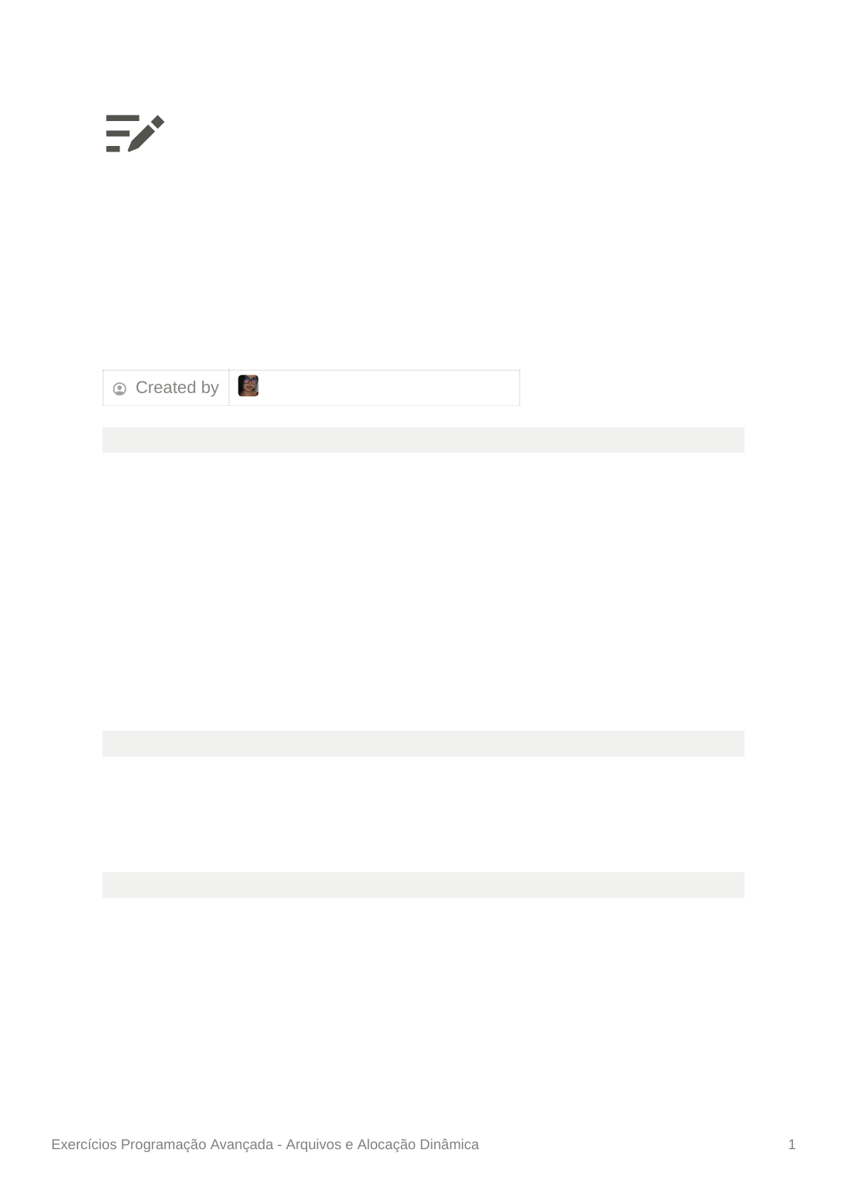 Exercícios Programação Avançada - Arquivos e Alocação Dinâmica 1 Exercícios Programação Avançada - Arquivos e Alocação Dinâmica Created by PALOMA TAINARA LIMA SILVA Exercício 01 Crie um programa que permite , através de funções e por uma quantidade indefinida de vezes realizar as seguintes opções: 1- criar um arquivo 2 - inserir dados no arquivo(sobrescrever) 3 - inserir dados no arquivo(acrescentar) 4 - exibir conteúdo do arquivo 5 - excluir arquivo 6 – sair Exercício 02 Crie um programa que recebe 4 números através de um arquivo e mostra quais os são os números e o resultado da sua soma. Exercício 03 Crie um programa que recebe 4 nomes através de um arquivo e mostra quais os são os nomes Exercícios Programação Avançada - Arquivos e Alocação Dinâmica 2 Exercício 04 Crie um programa para armazenar informações sobre um cliente. As informações são: nome, cidade e estado. Utilize registro(struct) para a resolução. A alocação da memória deve ser dinâmica. Ao final as informações devem ser exibidas. Exercício 05 Utilizando alocação dinâmica, crie um vetor de números inteiros, que receba uma quantidade n de posições. N deve ser informado pelo usuário. Ao final as informações devem ser exibidas. Exercício 06 Utilizando alocação dinâmica, crie uma matriz de números inteiros, que receba uma quantidade n de linhas e colunas. Linhas e colunas devem ser informados pelo usuário. Ao final as informações devem ser exibidas.