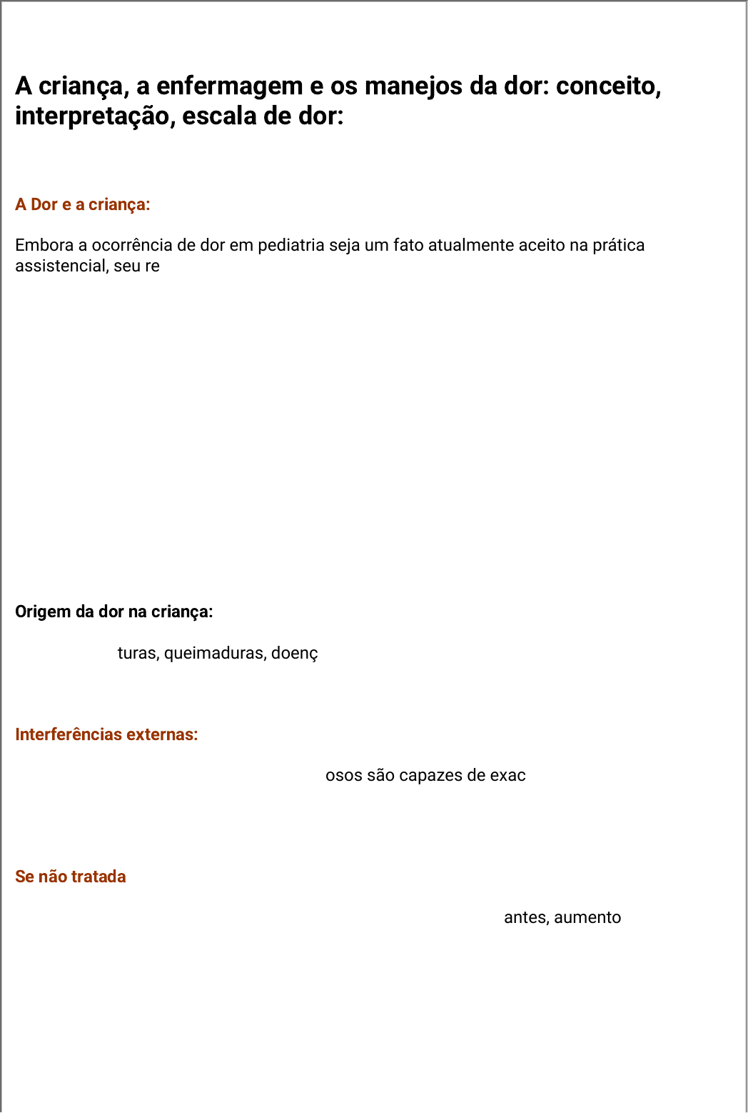 A criança, a enfermagem e os manejos da dor: conceito, interpretação, escala de dor: A Dor e a criança: Embora a ocorrência de dor em pediatria seja um fato atualmente aceito na prática assistencial, seu reconhecimento e tratamento permanecem insuficientes e ineficazes, tanto em função da incapacidade, de neonatos, lactentes e pré-escolares, em relatarem verbalmente a presença de dor, quanto em função da escassa experiência em analgesia pediátrica. Atualmente, sabe-se que recém-nascidos, incluindo-se prematuros, são capazes de experienciar sensações dolorosas. Os receptores sensitivos cutâneos estão presentes na região perioral do feto por volta da 7ª semana gestacional e espalham-se pela face, palmas das mãos e plantas dos pés na 11ª semana de gestação(5º,6º*). Ao final da 30ª semana, as células responsáveis pela percepção dolorosa inicial estão completamente desenvolvidas. Embora os mecanismos de controle e modulação dos estímulos dolorosos sejam imaturos ao nascimento, pode-se afirmar que o feto e o recém-nascido possuem, quase que integralmente, os componentes anatômicos necessários à percepção do estímulo doloroso; Origem da dor na criança: - procedimentos diagnósticos e terapêuticos;doenças infecciosas (otites e amigdalites), acidentes, fraturas, queimaduras, doenças oncológicas e reumáticas, anemia falciforme, procedimentos cirúrgicos, entre outras. Interferências externas: A expressão dolorosa na criança pode ser afetada por múltiplos aspectos, como condições ambientais (estímulos ruidosos ou luminosos são capazes de exacerbar as reações frente à dor), estímulos elaborados, que podem provocar ansiedade e elevar a sensação dolorosa (a visão de uma agulha ou de pessoas vestidas de branco, a sensação do cheiro de álcool), influência comportamental da família, além de aspectos sociais e financeiros. Se não tratada Quando não tratada, a dor provoca inúmeros efeitos deletérios na criança, a exemplo de alterações metabólicas, elevação nos níveis de hormônios circulantes, aumento da susceptibilidade às infecções, alterações do fluxo sangüíneo cerebral e hemorragia ventricular, hipóxia, episódios de apnéia, congestão venosa, utilização de reservas de glicose, alteração dos padrões de sono e vigília e alterações comportamentais frente a outros episódios dolorosos Tratamento da dor: - é fundamental que a dor em crianças seja adequadamente identificada, avaliada e, sobretudo, tratada. A identificação da dor em pediatria pode ser considerada como o principal componente limitante no seu tratamento adequado, uma vez que se considera o relato verbal como a principal fonte indicativa de dor e recém-nascidos, lactentes e crianças pré-verbais são incapazes de verbalizarem a queixa. Por isso que a atenção profissional deve-se voltar para os aspectos não-verbais observados como resultado do estímulo doloroso. Alterações comportamentais são mais freqüentemente associadas à dor em crianças: - choro, mímica facial, movimentação de membros (extensão e flexão), aumento de tônus muscular, rigidez torácica, indisponibilidade para contato visual e auditivo, alteração no padrão alimentar e na relação mãe-e-filho; Alterações fisiológicas e metabólicas: - presentes igualmente em crianças e adultos, incluem: aumento de freqüência cardíaca e da pressão arterial, aumento da freqüência respiratória e alteração do padrão respiratório, queda de saturação de oxigênio, cianose, aumento da pressão intracraniana, dilatação pupilar, suor palmar, tremores, aumento dos níveis séricos de cortisol, epinefrina, norepinefrina, glucagon, hormônio do crescimento, endorfinas, supressão de insulina e aumento na excreção de substâncias nitrogenadas. O relato dos pais ou cuidadores deve ser valorizado na identificação de alterações comportamentais e fisiológicas. Escalas de dor em pediatria: Baseadas nessas alterações, diversas escalas foram desenvolvidas com o objetivo de identificar a dor em crianças incapazes de comunicarem-se, que podem ser utilizadas favorecendo uma avaliação mais precisa. 1) Período neonatal: inclui bebês, do nascimento ao 28º dia de vida, as escalas mais freqüentemente utilizadas são NIPS (Neonatal Infant Pain Scale/ Escala de Dor Neonatal, desenvolvida por Lawrence et al., em 1993), PIPP (Premature Infant Pain Profile/Perfil da Dor do Neonato Prematuro, desenvolvida por Stevens et al., em 1996) e CRIES (Crying, Requires for saturation above 95%, Increased vital signs, Expression e Sleplessness, referente a choro, saturação de oxigênio, dados vitais, expressão facial e estado de alerta, desenvolvida por Krechel & Bildner em 1995, objetivando a avaliação de dor pós-operatória em pediatria), por serem escalas validadas e confiáveis. 3) Crianças com idades entre três e sete anos: é possível utilizar-se escalas que contenham desenhos como meio de quantificar a dor, como, por exemplo, escalas que mostram fotografias ou desenhos de faces de crianças (OUCHER, desenvolvida por Beyer em 1984 e ‘Facial Affective Scale”, desenvolvida por McGrath et al., em 1985), escalas numéricas (como o ‘Pain Thermometer’, com pontuação de 0 a 10, desenvolvido por Szyfelbein et al., em 1985), escala de copos (como a ‘Glasses Rating Scale’, quanto mais cheio o copo, maior a dor, desenvolvida por Waley & Wong, em 1987) e a escala de ‘pedaços de dor’ (‘Poker Chip Tool’, onde a criança quantifica, em no máximo quatro pedaços, a medida de sua dor, desenvolvida por Hester, em 1979) . 4) Crianças com idade superior a oito anos: se capazes de expressarem-se verbalmente, de maneira consistente, o auto-relato torna-se a melhor forma de identificar a dor. A queixa pode basear-se em números (através da escala visual análoga, que pontua a intensidade da dor de 0 a 10), palavras (pouca, moderada, intensa) e ainda desenhos ou fi