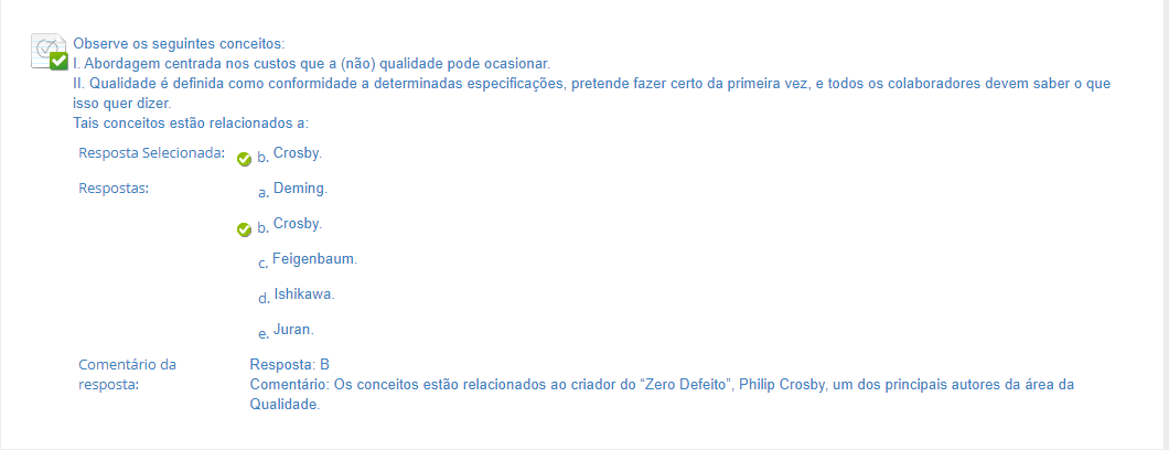 Observe os seguintes conceitos: I. Abordagem centrada nos custos que a (não) qualidade pode II. Qualidade é definida como conformidade a determinadas especificações, pretende fazer certo da primeira e todos os colaboradores devem saber que isso quer Tais conceitos estão relacionados a:
