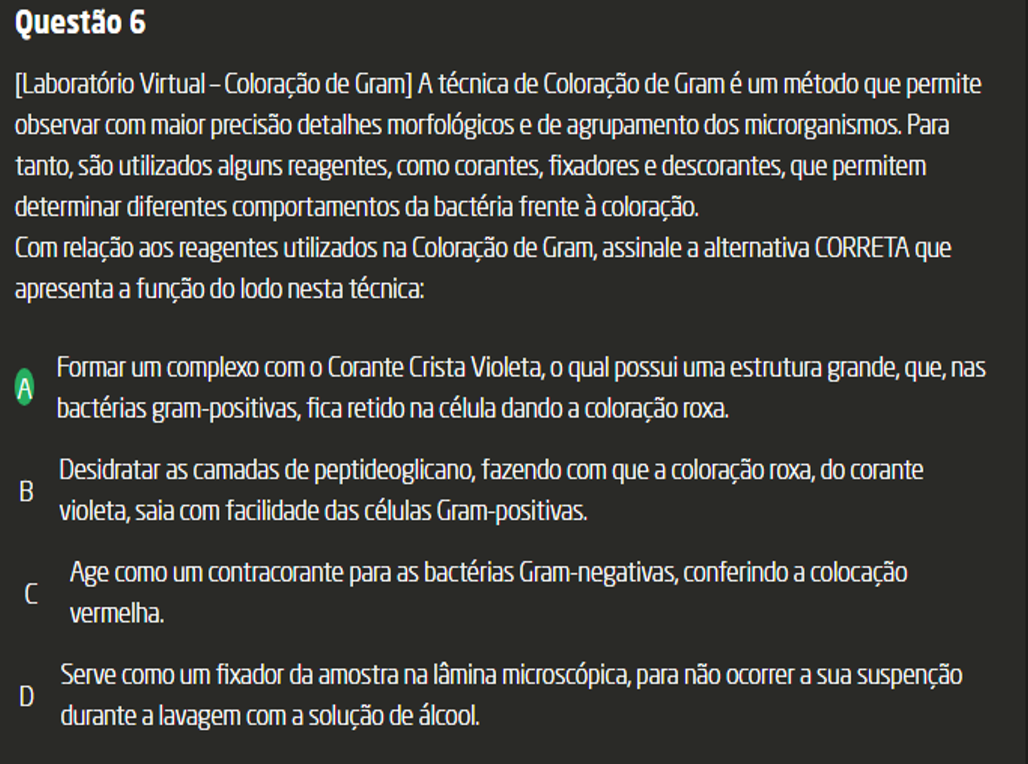Questão 6 [Laboratório Virtual - Coloração de Gram] A técnica de Coloração de Gram é um método que permite observar com maior precisão detalhes morfológicos e de agrupamento dos microrganismos. Para tanto, são utilizados alguns reagentes, como corantes, fixadores e descorantes, que permitem determinar diferentes comportamentos da bactéria frente à coloração. Com relação aos reagentes utilizados na Coloração de Gram, assinale a alternativa CORRETA que apresenta a função do lodo nesta técnica: