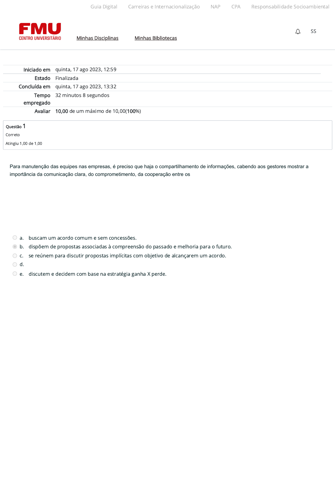 17/08/2023, 13:32 Atividade 3 (A3): Revisão da tentativa https://ambienteacademico.com.br/mod/quiz/review.php?attempt=2746956&cmid=1072667 1/6 Iniciado em quinta, 17 ago 2023, 12:59 Estado Finalizada Concluída em quinta, 17 ago 2023, 13:32 Tempo empregado 32 minutos 8 segundos Avaliar 10,00 de um máximo de 10,00(100%) Questão 1 Correto Atingiu 1,00 de 1,00 Para manutenção das equipes nas empresas, é preciso que haja o compartilhamento de informações, cabendo aos gestores mostrar a importância da comunicação clara, do comprometimento, da cooperação entre os membros das referidas equipes. Quando não há clareza na comunicação e na definição de papeis dentro das equipes, é comum surgirem conflitos e a competição muitas vezes predatória, levando à desestruturação do time de trabalho. Essa situação exigirá que o gerente saiba conduzir o processo de negociação, visando solucionar o conflito instalado na equipe. SCHMIDT, M. C. Gestão de Pessoas. Paraná: IFPR, 2011 (adaptado). A negociação é um processo em que duas ou mais partes, com interesses comuns e antagônicos: a. buscam um acordo comum e sem concessões. b. dispõem de propostas associadas à compreensão do passado e melhoria para o futuro. c. se reúnem para discutir propostas implícitas com objetivo de alcançarem um acordo. d. se juntam aleatoriamente para discutir propostas, que levem a um acordo. e. discutem e decidem com base na estratégia ganha X perde. Guia Digital Carreiras e Internacionalização NAP CPA Responsabilidade Socioambiental Minhas Disciplinas Minhas Bibliotecas SS https://codely-fmu-content.s3.amazonaws.com/Moodle/GuiaDigital/Guia+digital/index.html https://carreiras.fmu.br/ https://codely-fmu-content.s3.amazonaws.com/Moodle/NAP/inicial/nap/fmu/index.html https://codely-fmu-content.s3.amazonaws.com/Moodle/CPA/landing_CPA/index.html https://portal.fmu.br/sustentabilidade https://ambienteacademico.com.br/ https://ambienteacademico.com.br/ https://ambienteacademico.com.br/course/view.php?id=236 17/08/2023, 13:32 Atividade 3 (A3): Revisão da tentativa https://ambienteacademico.com.br/mod/quiz/review.php?attempt=2746956&cmid=1072667 2/6 Questão 2 Correto Atingiu 1,00 de 1,00 Questão 3 Correto Atingiu 1,00 de 1,00 Ser líder é dar sentido às coisas e colocá-las em linguagem significativa para um grande número de pessoas. Em que pese as diferenças individuais entre o líder e seus seguidores, é pela consciência dessas diferenças que a ação do líder, reconhecidamente eficaz, faz sentir a importância da sua presença. Sob esse aspecto, o líder sabe que pode contar com as necessidades interiores, originárias da busca de realização pessoal e da preservação da autoimagem, daqueles que aceitam ser dirigidos por ele. BERGAMINI. C. W. Liderança: a administração dos sentidos. Revista de Administração de Empresas. V.34, n. 3, p.102-114 Mai/Jun. São Paulo,1994. Disponível em www.scielo.br/pdf/rae/v34n3/a09v34n3.pdf Acesso em 26/04/2019. Sobre os estilos de liderança, analise os itens a seguir. I. Teoria caminho X objetivo sustenta que o líder deve conhecer os objetivos pretendidos por seus colaboradores e agir como um facilitador para que eles sejam alcançados. II. O líder diretivo é aquele que demonstra mais sensibilidade para com seus subordinados. III. O líder apoiador anuncia com objetividade o que ele espera do trabalho e das pessoas. IV. O líder participativo consulta seus funcionários para a tomada de decisões. V. O líder da conquista espera o melhor desempenho de seus funcionários em relação às metas desafiadoras. Está correto apenas o que se afirma em: a. I, IV e V. b. V. c. II, III e IV. d. III. e. I e II. Há vários estilos de negociação de conflitos. Em um extremo, existem estilos que dão ênfase ao desejo de satisfazer os próprios interesses e, em outro extremo, estilos que levam em conta os interesses da outra parte. De um lado, uma dimensão assertiva e, de outro, uma dimensão cooperativa. Cabe ao administrador definir o estilo mais adequado para negociação do conflito. CHIAVENATO, I. Gestão de Pessoas: o novo papel dos recursos humanos nas organizações. 4 ed. São Paulo: Manole, 2014 (adaptado). Na fase de execução, os estilos de negociação escolhidos, pelas partes envolvidas no conflito, têm papel fundamental no referido processo. Sobre esses estilos de negociação marque a alternativa cuja afirmação é CORRETA. a. O estilo de evitar prefere negociar, visando evitar con�itos. b. O estilo competitivo foca nos novos negócios que podem ser gerados entre as partes. c. O estilo cooperativo acredita nas relações �rmadas no presente, entre as partes envolvidas. d. O estilo de conciliação procura satisfazer a outra parte. e. O estilo de coopetição não faz concessões, mesmo que receba algo em troca. Guia Digital Carreiras e Internacionalização NAP CPA Responsabilidade Socioambiental Minhas Disciplinas Minhas Bibliotecas SS http://www.scielo.br/pdf/rae/v34n3/a09v34n3.pdf https://codely-fmu-content.s3.amazonaws.com/Moodle/GuiaDigital/Guia+digital/index.html https://carreiras.fmu.br/ https://codely-fmu-content.s3.amazonaws.com/Moodle/NAP/inicial/nap/fmu/index.html https://codely-fmu-content.s3.amazonaws.com/Moodle/CPA/landing_CPA/index.html https://portal.fmu.br/sustentabilidade https://ambienteacademico.com.br/ https://ambienteacademico.com.br/ https://ambienteacademico.com.br/course/view.php?id=236 17/08/2023, 13:32 Atividade 3 (A3): Revisão da tentativa https://ambienteacademico.com.br/mod/quiz/review.php?attempt=2746956&cmid=1072667 3/6 Questão 4 Correto Atingiu 1,00 de 1,00 Questão 5 Correto Atingiu 1,00 de 1,00 Na segunda metade do século XX, pesquisadores passaram a estudar a influência das condições situacionais sobre a liderança. Com isso, surgem quatro principais abordagens: o Modelo de Fiedler, a teoria situacional de Hersey e Blanchard, a Teoria do Caminho-objetivo de House e a Teoria das Trocas