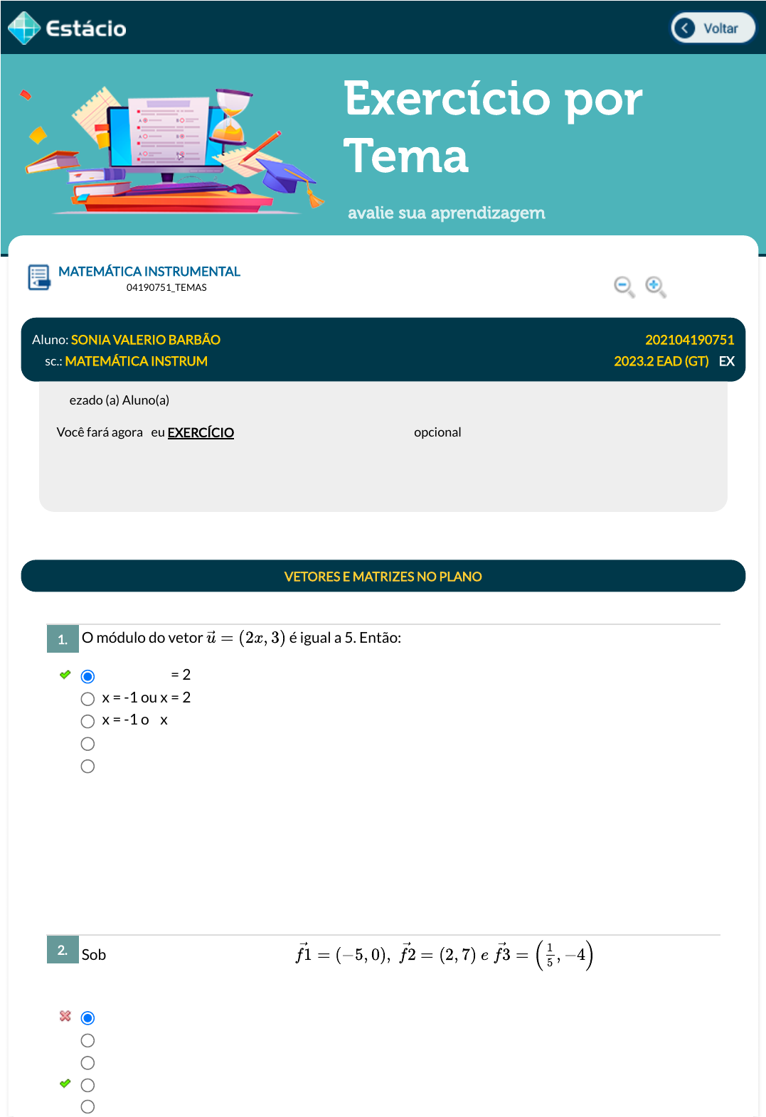 30/07/2023, 18:06 Estácio: Alunos https://simulado.estacio.br/alunos/ 1/3 Exercício por Tema avalie sua aprendizagem O módulo do vetor é igual a 5. Então: Sobre um corpo, atuam as forças . A força resultante sobre esse corpo tem módulo próximo de: MATEMÁTICA INSTRUMENTAL Lupa DGT0118_202104190751_TEMAS Aluno: SONIA VALERIO BARBÃO Matr.: 202104190751 Disc.: MATEMÁTICA INSTRUM 2023.2 EAD (GT) / EX Prezado (a) Aluno(a), Você fará agora seu EXERCÍCIO! Lembre-se que este exercício é opcional, mas não valerá ponto para sua avaliação. O mesmo será composto de questões de múltipla escolha. Após responde cada questão, você terá acesso ao gabarito comentado e/ou à explicação da mesma. Aproveite para se familiarizar com este modelo de questões que será usado na sua AV e AVS. VETORES E MATRIZES NO PLANO 1. x = -2 ou x = 2 x = -1 ou x = 2 x = -1 ou x = 1 x = -2 ou x = 1 x = 1 ou x = 2 Data Resp.: 30/07/2023 19:05:43 Explicação: A resposta correta é: x = -2 ou x = 2 2. 3,5 2,3 5,2 4,1 2,9 →u = (2x, 3) →f1 = (−5, 0), →f2 = (2, 7) e →f3 = ( , −4)1 5 javascript:voltar(); javascript:voltar(); javascript:diminui(); javascript:aumenta(); 30/07/2023, 18:06 Estácio: Alunos https://simulado.estacio.br/alunos/ 2/3 O vetor que representa a força aplicada sobre um corpo tem módulo igual 6 e sua componente horizontal é . Então, o vetor tem coordenadas: Dada as matrizes e e sabendo que A . B = C, o termo C23 da matriz C é: Sabe-se que A . X = B, sendo e . A matriz X que satisfaz as condições apresentadas é: Data Resp.: 30/07/2023 19:05:50 Explicação: A resposta correta é: 4,1 3. (0,6) (4,6) (6,4) Data Resp.: 30/07/2023 19:05:59 Explicação: A resposta correta é: 4. 3 7 0,4 1 0 Data Resp.: 30/07/2023 19:06:04 Explicação: A resposta correta é: 3 5. →F →Fx = (4, 0) →F (0, 2√5) (4, 2√5) (4, 2√5) A = ⎡ ⎢ ⎣ −1 2 3 1 − 2 0 0 3 1 ⎤ ⎥ ⎦ B = ⎡ ⎢ ⎣ 0 − 2 5 −3 1 1 2 3 0 ⎤ ⎥ ⎦ A = [ −1 1 2 − 3 ] B = [ 1 2 ] [−4 5 ] [−5 4 ] [ 5 −4 ] 30/07/2023, 18:06 Estácio: Alunos https://simulado.estacio.br/alunos/ 3/3 Data Resp.: 30/07/2023 19:06:10 Explicação: A resposta correta é: Não Respondida Não Gravada Gravada Exercício inciado em 30/07/2023 19:05:36. [−4 −5 ] [−5 −4 ] [−5 −4 ]