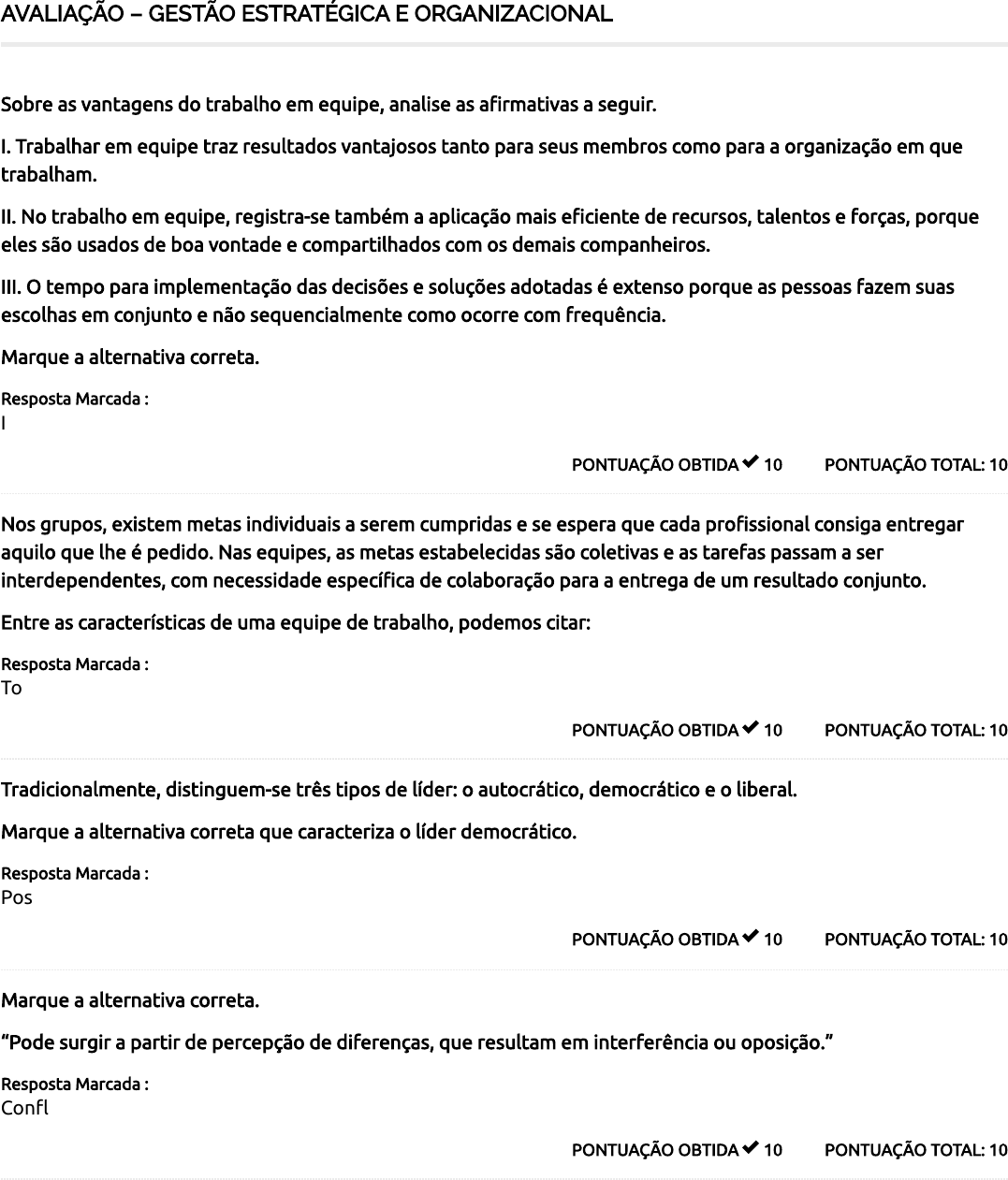 19/08/2023, 14:16 Course Status – Faculdade Educavales https://ava.educavales.universaeducacional.com.br/course-status/ 1/3 AVALIAÇÃO – GESTÃO ESTRATÉGICA E ORGANIZACIONAL PONTUAÇÃO TOTAL: 10PONTUAÇÃO OBTIDA 10 Sobre as vantagens do trabalho em equipe, analise as a�rmativas a seguir. I. Trabalhar em equipe traz resultados vantajosos tanto para seus membros como para a organização em que trabalham. II. No trabalho em equipe, registra-se também a aplicação mais e�ciente de recursos, talentos e forças, porque eles são usados de boa vontade e compartilhados com os demais companheiros. III. O tempo para implementação das decisões e soluções adotadas é extenso porque as pessoas fazem suas escolhas em conjunto e não sequencialmente como ocorre com frequência. Marque a alternativa correta. Resposta Marcada : I e II estão corretas. PONTUAÇÃO TOTAL: 10PONTUAÇÃO OBTIDA 10 Nos grupos, existem metas individuais a serem cumpridas e se espera que cada pro�ssional consiga entregar aquilo que lhe é pedido. Nas equipes, as metas estabelecidas são coletivas e as tarefas passam a ser interdependentes, com necessidade especí�ca de colaboração para a entrega de um resultado conjunto. Entre as características de uma equipe de trabalho, podemos citar: Resposta Marcada : Todas as alternativas estão corretas. PONTUAÇÃO TOTAL: 10PONTUAÇÃO OBTIDA 10 Tradicionalmente, distinguem-se três tipos de líder: o autocrático, democrático e o liberal. Marque a alternativa correta que caracteriza o líder democrático. Resposta Marcada : Possibilita o aumento progressivo da produtividade do grupo. PONTUAÇÃO TOTAL: 10PONTUAÇÃO OBTIDA 10 Marque a alternativa correta. “Pode surgir a partir de percepção de diferenças, que resultam em interferência ou oposição.” Resposta Marcada : Con�ito 19/08/2023, 14:16 Course Status – Faculdade Educavales https://ava.educavales.universaeducacional.com.br/course-status/ 2/3 PONTUAÇÃO TOTAL: 10PONTUAÇÃO OBTIDA 10 Marque a alternativa correta que representa o tipo de equipe abaixo. “O propósito dessas equipes é juntar o talento de trabalhadores para desempenhar uma tarefa que necessite dessa combinação. Normalmente estas equipes são formadas para desenvolvimento de novos produtos, melhoria da qualidade e redução de custos” Resposta Marcada : Equipes Multifuncionais PONTUAÇÃO TOTAL: 10PONTUAÇÃO OBTIDA 10 Entre os atributos para equipes auto geridas encontramos, EXCETO: Resposta Marcada : Tarefas privadas. PONTUAÇÃO TOTAL: 10PONTUAÇÃO OBTIDA 10 Marque a alternativa correta. Existem hoje dois modelos para a descrição e a análise dos con�itos nas organizações: Os modelos estruturais e os modelos processuais. Como se caracteriza o modelo estrutural? Resposta Marcada : Procuram identi�car e compreender as condições gerais de desenvolvimento do con�ito, sendo que alguns deles restringem o foco à natureza humana e às relações intergrupais. PONTUAÇÃO TOTAL: 10PONTUAÇÃO OBTIDA 10 Marque a alternativa correta. Como se caracteriza o Con�ito Intraorganizacional: Resposta Marcada : Abrange a generalidade das partes da organização (situação de con�ito generalizado). 19/08/2023, 14:16 Course Status – Faculdade Educavales https://ava.educavales.universaeducacional.com.br/course-status/ 3/3 100 / 100 PONTUAÇÃO TOTAL: 10PONTUAÇÃO OBTIDA 10 Marque a alternativa correta que de�ne os Grupos de A�nidade. Resposta Marcada : Composto de trabalhadores que se reúnem regularmente fora de seus grupos funcionais, com o objetivo de aplicar seus conhecimentos e sua atenção a importantes questões do local de trabalho. PONTUAÇÃO TOTAL: 10PONTUAÇÃO OBTIDA 10 Sobre os aspectos negativos do trabalho em equipe, marque V para as a�rmativas verdadeiras e F para as falsas. ( ) Criação da cultura do “consenso obrigatório”. ( ) Radicalização em torno das decisões tomadas. ( ) Útero protetor. ( ) Preservação da coesão. Marque a alternativa correta. Resposta Marcada : V, V, F, F Total