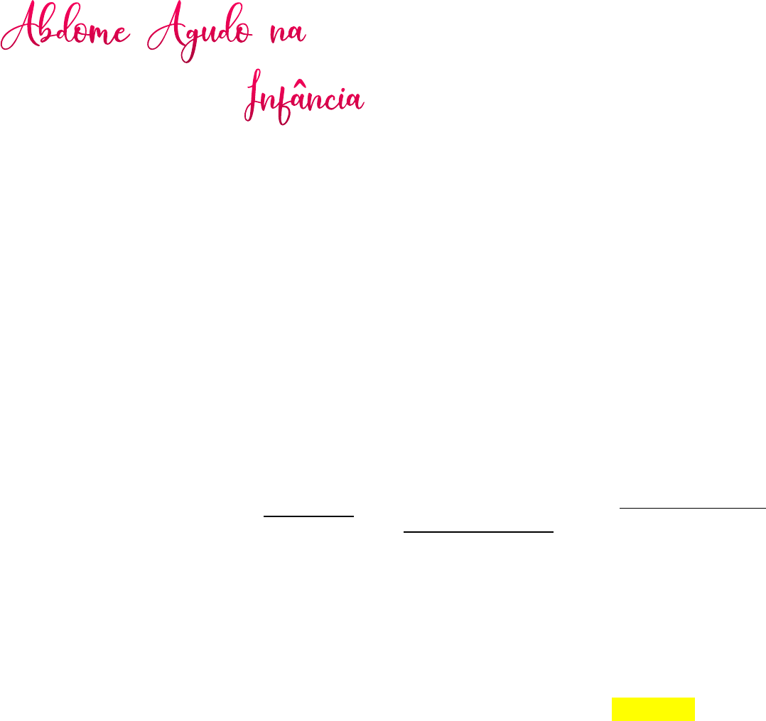 1 Khilver Doanne Sousa Soares Material restrito, favor não reproduzir nem distribuir sua posse!!! Nenhum serviço de impressão e xerox pode redistribuir este material a outros clientes!!! Clínica Cirúrgica, VIII° IMPORTANTE frisar que este tema é, no mínimo, IMENSO. No entanto, neste resumo, frisaremos os tópicos + importantes e discutidos pelos preceptores do 8° período, 2023.1. Mas lembre-se, o conteúdo COMPLETO é constituído de mais doenças que as abordadas neste resumo! Intussuscepção Intestinal A intussuscepção ou invaginação intestinal ocorre quando um segmento proximal de alça intestinal penetra em um segmento distal, causando compressão vascular do mesentério. Como consequência, há edema e isquemia da alça, com risco de necrose e perfuração. Essa entidade pode se manifestar em qualquer idade, mas apenas 10% a 25% dos casos ocorrem após os dois anos, sendo o pico de incidência entre o quinto e o nono mês de vida. Na esmagadora maioria dos casos (90%) a causa é idiopática, mas lesões anatômicas podem causar a invaginação neste contexto, o divertículo de Meckel é a lesão que mais se associa à intussuscepção secundária em crianças. Outras causas de intussuscepção secundária: Pólipos intestinais. Apêndice inflamado. Hemorragia submucosa associada à púrpura de Henoch-Schönlein. Corpo estranho. Tecido gástrico ou pancreático ectópico Duplicação intestinal A intussuscepção ocorre predominantemente na região ileocecal (80% dos casos). Classicamente a intussuscepção intestinal acomete lactentes entre 04 a 12 meses. A criança com esse diagnóstico apresenta episódios de dor abdominal aguda intensa e intermitente, caracteristicamente em cólica, acompanhada de palidez cutânea, sudorese e contração dos membros inferiores. Após o primeiro surto de dor, a criança permanece relativamente bem, mas em seguida volta a apresentar novo episódio álgico. Os surtos passam então a ser mais frequentes, surgem vômitos e eliminação anal de muco com sangue, com aspecto que lembra "geleia de morango". Se a intussuscepção não for diagnosticada e tratada precocemente, evolui para obstrução grave e possível necrose da alça intestinal! Geralmente, quando há procura por atendimento médico, o lactente já se apresenta prostrado, apático, com palidez cutânea e pele fria. Ao exame do abdome, palpa-se massa alongada, tubuliforme, no quadrante superior direito ou epigástrio. Também é descrito o sinal de Dance, que corresponde à fossa ilíaca direita “vazia” ou escafóide. O toque retal também é um elemento de importância fundamental para constatar a presença de sangue nas fezes ou de muco com sangue (geleia de morango). Em 50% dos casos, o diagnóstico pode ser suspeitado pela radiografia simples de abdome. Os achados desse exame incluem a presença de massa, geralmente em fossa ilíaca direita, ausência de gás colônico e distensão de alças de intestino delgado proximais à invaginação. No entanto, a USG abdominal é um exame mais sensível e específico que a radiografia, sendo realizada como prova diagnóstica inicial. Trata-se de exame não invasivo, rápido, de baixo custo e que permite um diagnóstico acurado. Os achados característicos incluem: 2 Khilver Doanne Sousa Soares Material restrito, favor não reproduzir nem distribuir sua posse!!! Nenhum serviço de impressão e xerox pode redistribuir este material a outros clientes!!! “Sinal do alvo”: corresponde a camadas concêntricas de ecogenicidades diferentes, em visão transversal à USG “Pseudo-rim”: corresponde à imagem da secção longitudinal da área de intussuscepção Tratamento A redução hidrostática por enema, utilizando contraste ou ar, é o procedimento terapêutico de eleição – contraindicações? Peritonite ou instabilidade hemodinâmica. A intussuscepção do intestino delgado também não costuma ser reduzida com sucesso através de enema. Portanto, esse método não é recomendado como terapia de escolha para esses casos. A redução hidrostática, quando indicada adequadamente, é bem-sucedida em mais de 80% dos casos. A confirmação do sucesso do tratamento é feita pela resolução da massa abdominal e pelo refluxo de ar no íleo terminal à radiografia. É possível que haja recidiva dentro das primeiras 24h pós procedimento principalmente e a redução hidrostática é realizada novamente. NO ENTANTO, uma terceira recorrência é indicação de cirurgia. Durante a cirurgia, é feita a desinvaginação por meio de manobras suaves de “ordenha retrógrada”. Em caso de necrose, o segmento acometido é ressecado e o trânsito reconstruído. Apendicite Aguda Ocorre em qualquer idade, mas na faixa pediátrica é mais comum entre os 4 e 15 anos. O principal fator desencadeante da apendicite aguda é a obstrução da luz apendicular. Na criança, a causa mais frequente de obstrução segue-se a um processo viral que provoca hiperplasia linfoide e obstrução do lúmen apendicular. Após 12 a 24 horas do início do processo, a obstrução do lúmen apendicular e a distensão do órgão levam ao comprometimento do retorno venoso e linfático, gerando isquemia. A inflamação decorrente de todos esses eventos atinge o peritônio parietal, que apresenta inervação somática e, então, o paciente passa a apresentar dor localizada em fossa ilíaca direita, acompanhada de sinais de peritonite localizada, como dor à descompressão brusca da fossa ilíaca direita ou mesmo à percussão local. Se a apendicite não for diagnosticada e prontamente tratada, podem ocorrer microperfurações, que tendem a evoluir para ruptura total do apêndice. Nesse caso, pode haver peritonite franca, com pus disseminado pela cavidade ou, então, abscesso na fossa ilíaca direita. 3 Khilver Doanne Sousa Soares Material restrito, favor não reproduzir nem distribuir sua posse!!! Nenhum serviço de impressão e xerox pode redistribuir este material a 