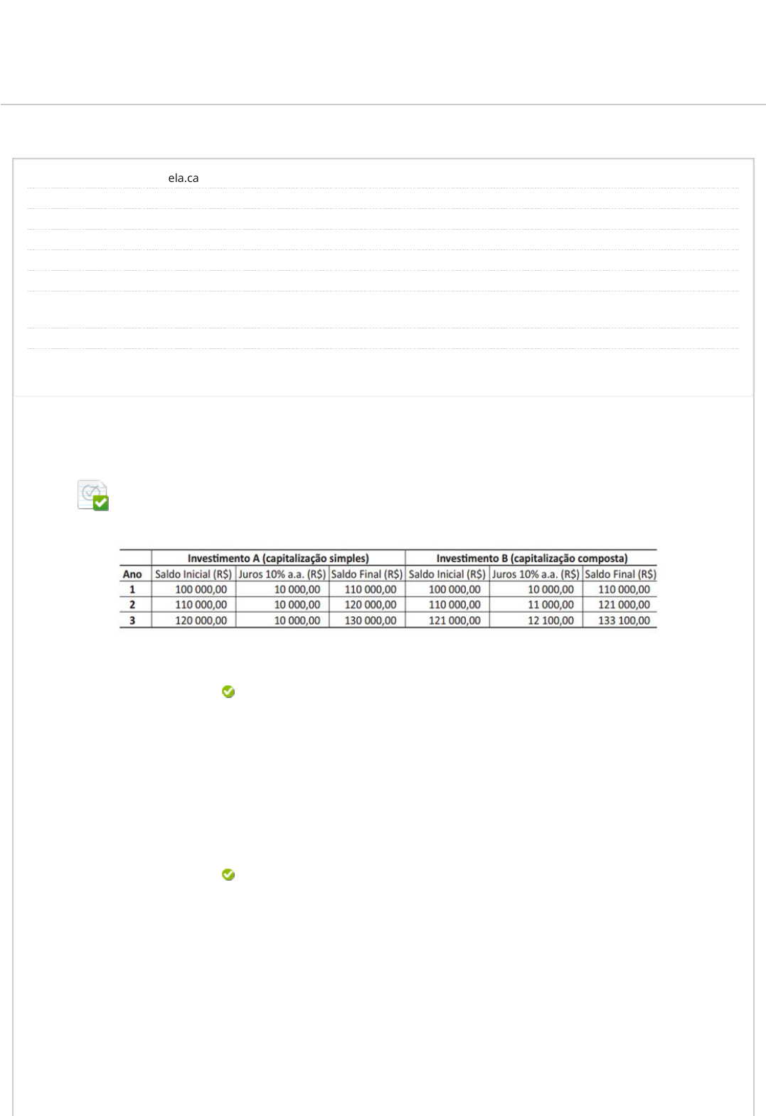 19/03/23, 16:58 Revisar envio do teste: QUESTIONÁRIO UNIDADE I – ... https://ava.ead.unip.br/webapps/assessment/review/review.jsp?attempt_id=_91622161_1&course_id=_264976_1&content_id=_3148183_1&retur… 1/7 Revisar envio do teste: QUESTIONÁRIO UNIDADE IMATEMÁTICA FINANCEIRA 4650-30_55820_R_E1_20231 CONTEÚDO Usuário rafaela.castro12 @aluno.unip.br Curso MATEMÁTICA FINANCEIRA Teste QUESTIONÁRIO UNIDADE I Iniciado 19/03/23 16:15 Enviado 19/03/23 16:58 Status Completada Resultado da tentativa 5 em 5 pontos Tempo decorrido 42 minutos Resultados exibidos Todas as respostas, Respostas enviadas, Respostas corretas, Comentários, Perguntas respondidas incorretamente Pergunta 1 Resposta Selecionada: c. Respostas: a. b. c. d. e. Feedback da resposta: (ENADE 2015) O gerente �nanceiro de uma empresa de serviços analisou as opções de investimento A e B, apresentadas na tabela a seguir, sobre um capital de $ 100.000,00 no período de três anos. Em ambas as opções, os juros são capitalizados anualmente à taxa de 10% ao ano, segundo regimes de capitalização diferentes. Com base na análise dos dados apresentados, conclui-se que: O investimento B é mais atrativo, porque os juros são calculados sobre o montante, o qual inclui os juros do período anterior. O investimento A gerou para a empresa o valor de $ 30.000,00, o que corresponde à apuração de juros sobre juros, ao �nal do período de três anos. O investimento B é mais atrativo, porque os juros são calculados de forma linear e incidem sobre o capital inicial investido pela empresa. O investimento B é mais atrativo, porque os juros são calculados sobre o montante, o qual inclui os juros do período anterior. O investimento A é menos atrativo, porque os juros aumentaram a cada período de forma exponencial. O investimento A gera para a empresa montante inferior ao investimento B, ao �nal de cada ano. Resposta: C Comentário: Se analisarmos cada uma das a�rmações veremos que todas, com exceção da a�rmação da alternativa “c”, possuem algum erro: UNIP EAD BIBLIOTECAS MURAL DO ALUNO TUTORIAISCONTEÚDOS ACADÊMICOS 0,5 em 0,5 pontos http://company.blackboard.com/ https://ava.ead.unip.br/webapps/blackboard/execute/courseMain?course_id=_264976_1 https://ava.ead.unip.br/webapps/blackboard/content/listContent.jsp?course_id=_264976_1&content_id=_3147194_1&mode=reset https://ava.ead.unip.br/webapps/portal/execute/tabs/tabAction?tab_tab_group_id=_10_1 https://ava.ead.unip.br/webapps/portal/execute/tabs/tabAction?tab_tab_group_id=_27_1 https://ava.ead.unip.br/webapps/portal/execute/tabs/tabAction?tab_tab_group_id=_47_1 https://ava.ead.unip.br/webapps/portal/execute/tabs/tabAction?tab_tab_group_id=_29_1 https://ava.ead.unip.br/webapps/portal/execute/tabs/tabAction?tab_tab_group_id=_25_1 https://ava.ead.unip.br/webapps/login/?action=logout 19/03/23, 16:58 Revisar envio do teste: QUESTIONÁRIO UNIDADE I – ... https://ava.ead.unip.br/webapps/assessment/review/review.jsp?attempt_id=_91622161_1&course_id=_264976_1&content_id=_3148183_1&retur… 2/7 • Na alternativa “a” o valor dos juros, ao �nal de cada período, é o mesmo no valor de $ 10. 000,00 o que descarta a a�rmação juros sobre juros; • Na alternativa “b” os juros são calculados sobre o valor atualizado, ao �nal de cada período. Observe que os valores dos juros se alteram em cada ano; • Na alternativa “d” os juros se mantêm constantes, ou seja, não aumentam de forma exponencial; • Na alternativa “e”, somente a partir do segundo ano que o montante produzido por A é inferior ao montante produzido por B; Portanto, a a�rmação correta é a alternativa “c” que, de fato, os juros são calculados sobre o valor atualizado, ao �nal de cada período. Pergunta 2 Resposta Selecionada: e. Respostas: a. b. c. d. e. Feedback da resposta: No �nal de 2 anos, a empresa XYZ deverá efetuar um pagamento de $ 200.000,00, referente ao valor de um empréstimo contraído hoje, mais os juros compostos devidos, correspondente a uma taxa de 3% a.m. Qual foi o valor aproximado emprestado à empresa hoje? $ 98.386,75. $ 81.713,44. $ 85.584,65. $ 88.548,07. $ 93.911,17. $ 98.386,75. . Pergunta 3 Resposta Selecionada: b. Respostas: a. b. c. O banco KLM fez uma aplicação de $ 1.000.000,00 por 12 meses a uma taxa de 18% ao ano sob o regime de capitalização composta. O valor resgatado após os 12 meses foi de: $ 1.180.000,00. $ 1.188.100,00. $ 1.180.000,00. $ 1.192.200,00. 0,5 em 0,5 pontos 0,5 em 0,5 pontos 19/03/23, 16:58 Revisar envio do teste: QUESTIONÁRIO UNIDADE I – ... https://ava.ead.unip.br/webapps/assessment/review/review.jsp?attempt_id=_91622161_1&course_id=_264976_1&content_id=_3148183_1&retur… 3/7 d. e. Feedback da resposta: $ 1.191.300,00. $ 1.193.700,00. . Pergunta 4 Resposta Selecionada: a. Respostas: a. b. c. d. e. Feedback da resposta: Qual o montante auferido em uma aplicação de $ 50.058,80 em regime de juros compostos, pelo prazo de um ano, à taxa de 2,08% a.m.? $ 64.086,77. $ 64.086,77. $ 64.011,49. $ 63.936,28. $ 63.861,16. $ 63.786,11. . Pergunta 5 Resposta Selecionada: b. Um banco anuncia o seguinte: "aplique hoje $ 10.000,00 e receba daqui a três anos $ 20.000,00". Qual a taxa paga pelo banco no triênio? 100%. 0,5 em 0,5 pontos 0,5 em 0,5 pontos 19/03/23, 16:58 Revisar envio do teste: QUESTIONÁRIO UNIDADE I – ... https://ava.ead.unip.br/webapps/assessment/review/review.jsp?attempt_id=_91622161_1&course_id=_264976_1&content_id=_3148183_1&retur… 4/7 Respostas: a. b. c. d. e. Feedback da resposta: 50%. 100%. 150%. 200%. 250%. Resposta: B Comentário: Para o cálculo da taxa de correção, utilizamos uma das relações básicas da Matemátca Financeira: Pergunta 6 Resposta Selecionada: d. Respostas: a. b. c. d. e. Feedback da resposta: Um capital A de $ 1.000,00 é aplicado a juros simples, à taxa de 12% a.a., ao passo que um outro capital B, também de $ 1,000,00, é aplicado a juros compostos, à taxa de 1